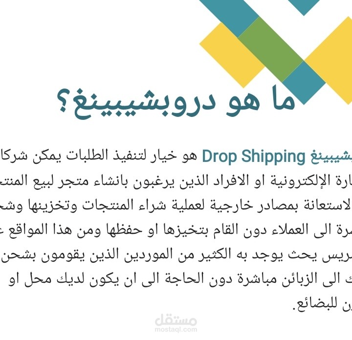 دروبشيبينغ Drop Shipping هو خيار لتنفيذ الطلبات يمكّن شركات التجارة الإلكترونية او الافراد الذين يرغبون بانشاء متجر لبيع المنتجات من الاستعانة بمصادر خارجية لعملية شراء المنتجات وتخزينها وشحنها مباشرة الى العملاء دون القام بتخيزها او حفظها ومن هذا المواقع علي اكسبريس يحث يوجد به الكثير من الموردين الذين يقومون بشحن طلبك الى الزبائن مباشرة دون الحاجة الى ان يكون لديك محل او مخزن للبضائع.