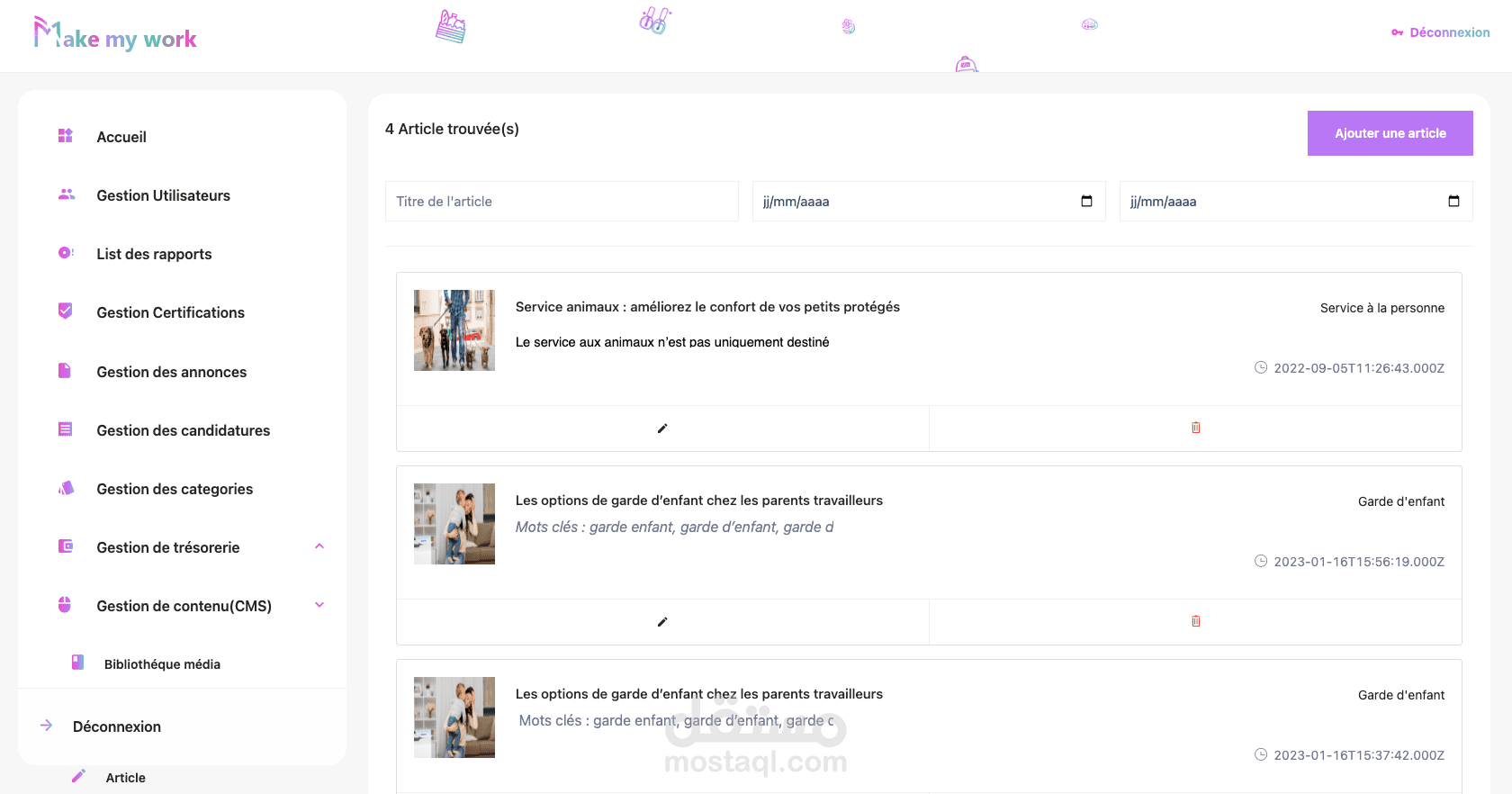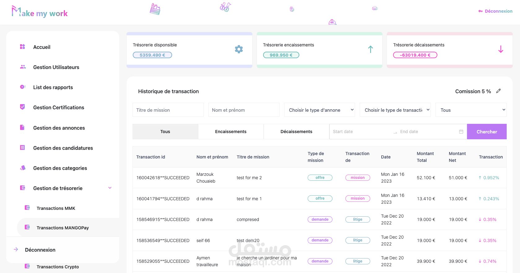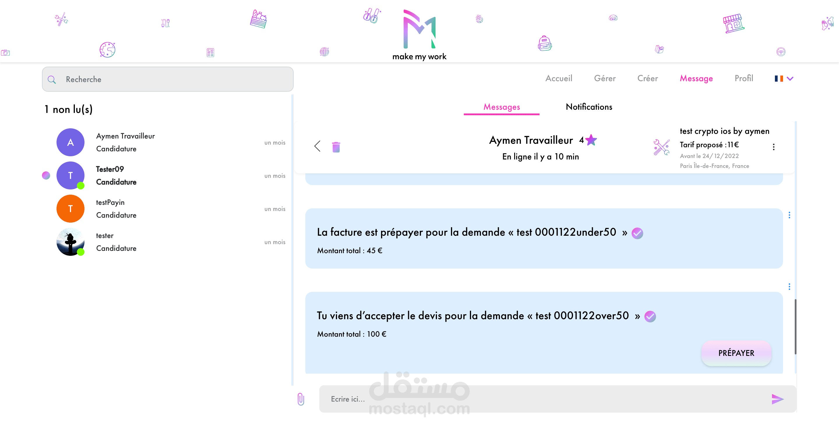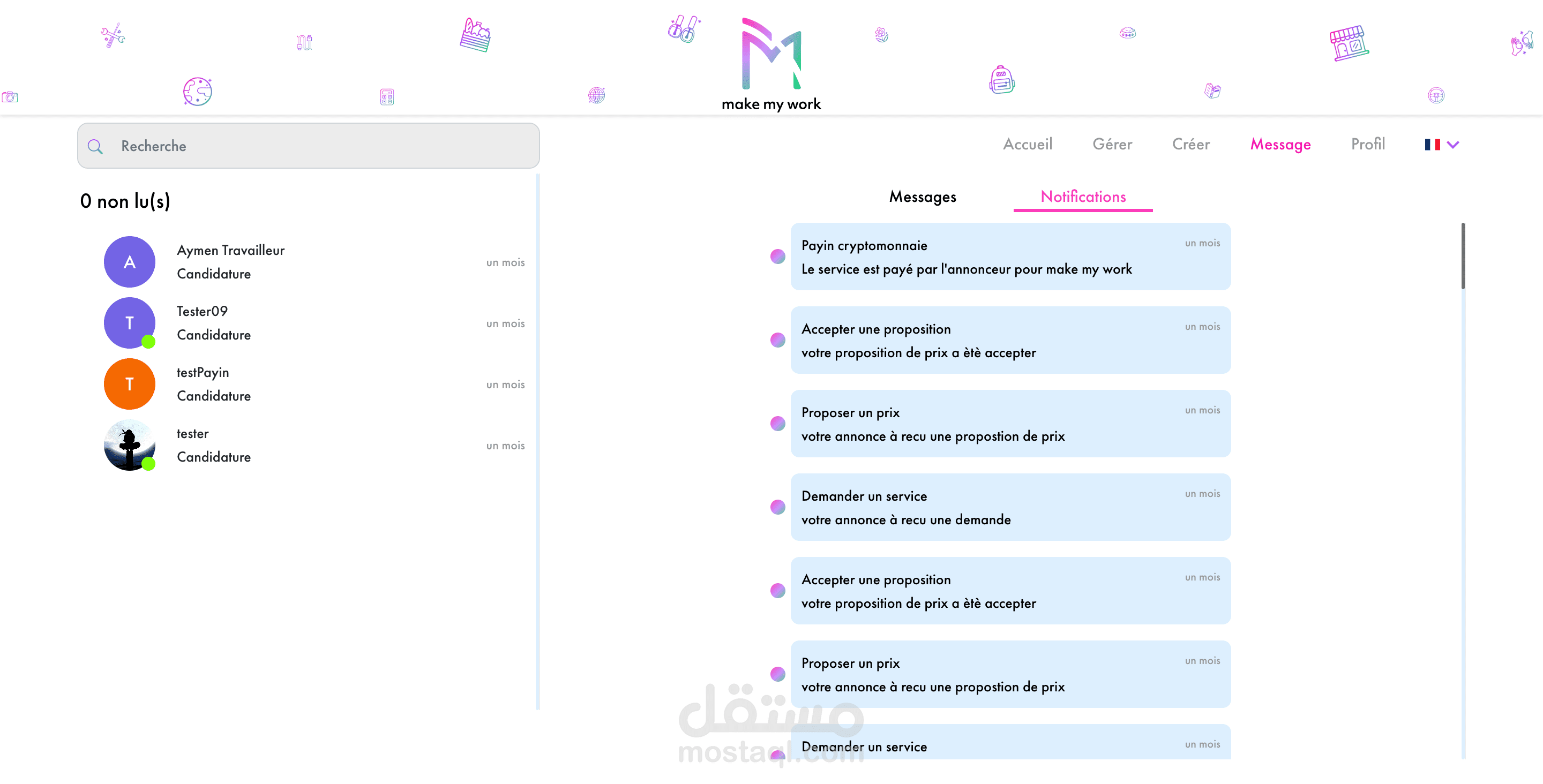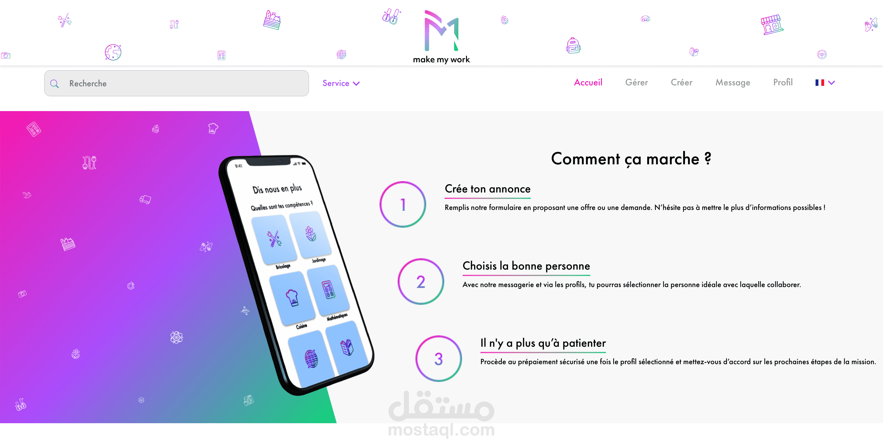 MakeMyWork is a platform for teaching assistance and paid service between individuals. Our application and our website adapt to new lifestyles by modifying responsible methods of exchange without neglecting the security of transactions and exchanges between members.