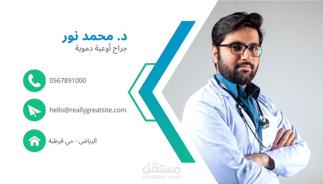 باختصار، تم تصميم كرت العمل الاحترافي للطبيب في المركز الصحي بأسلوب جذاب وواضح يعكس الثقة والاحترافية. يمنح العملاء معلومات هامة وسهولة التواصل، مع تعزيز العلامة التجارية للمركز الصحي وتسهيل الوصول إلى المعلومات الإضافية.