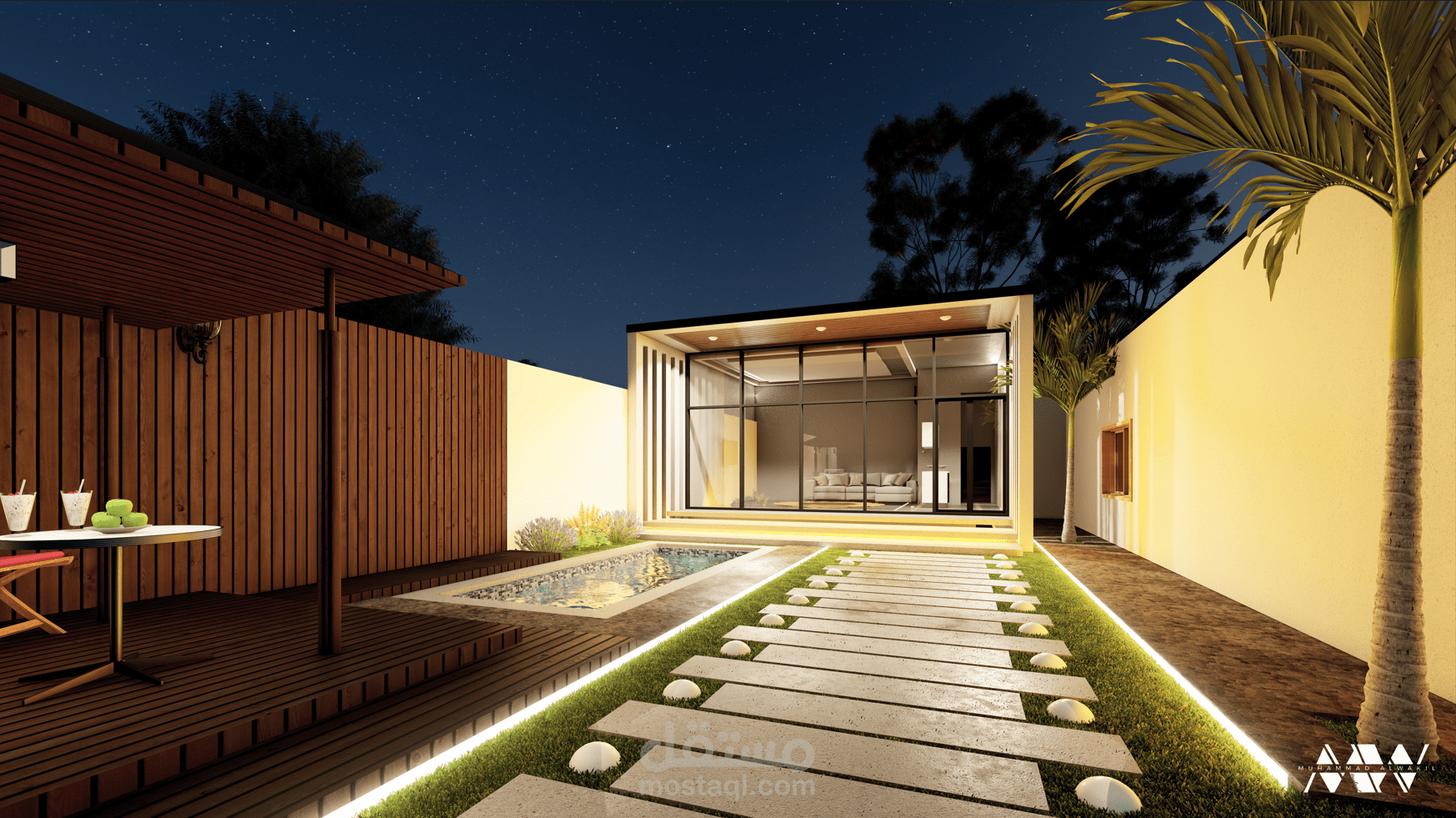 تصميم مجلس رجالي و غرفة الحارس مع حديقة خلفية بحمام السباحة