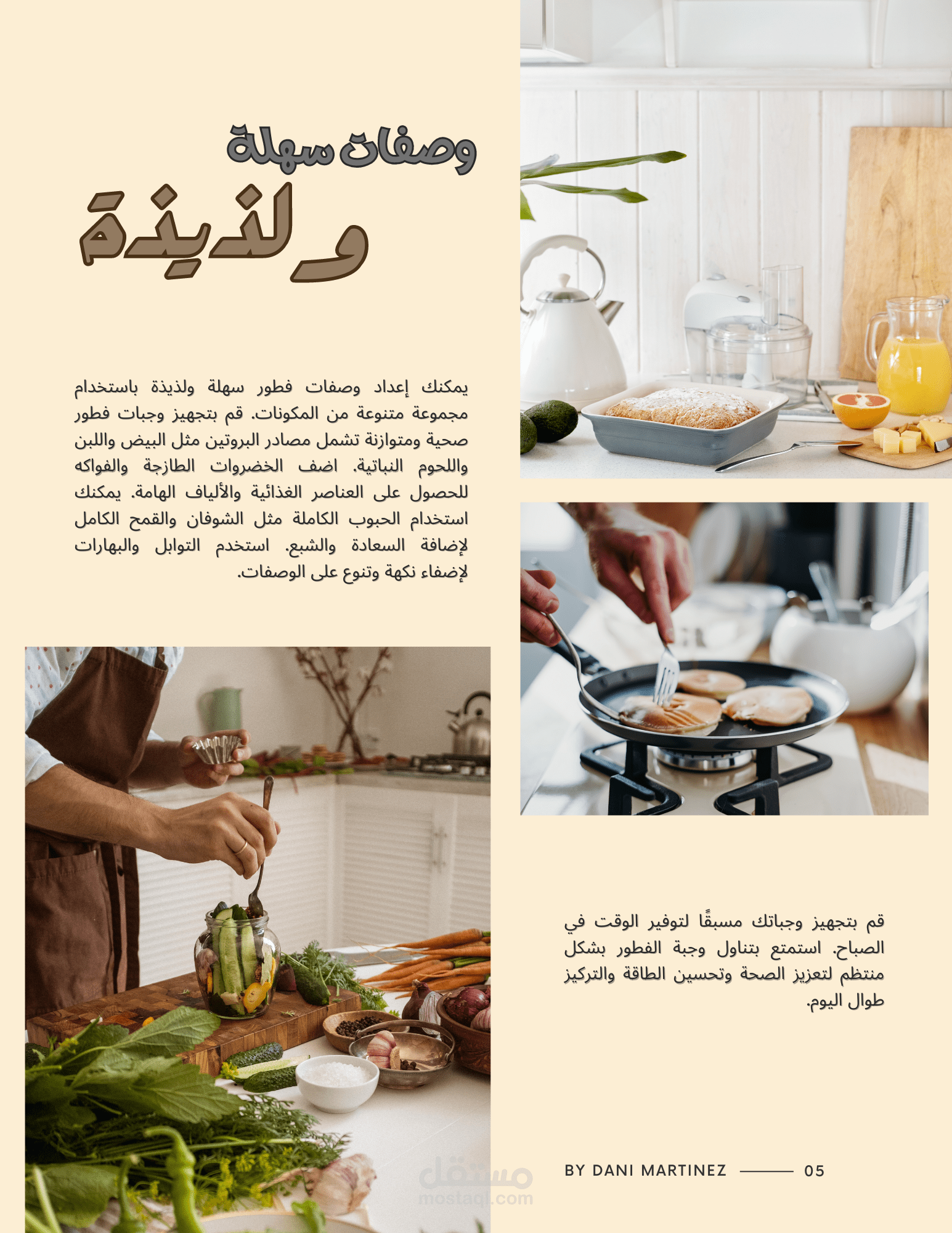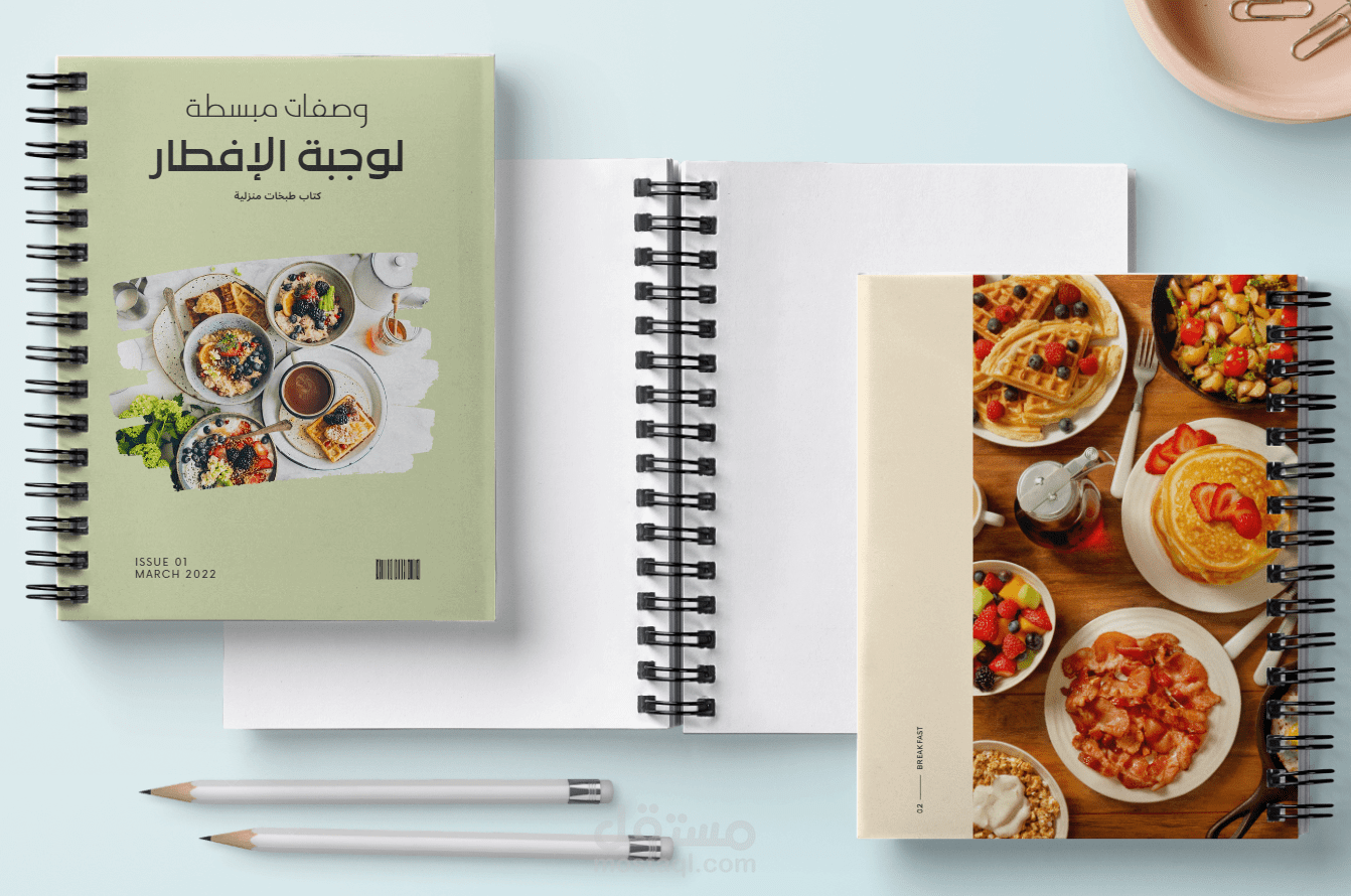 تم تصميم غلاف كتاب "وصفات منزلية مبسطة لوجبة الإفطار" بأسلوب أنيق واحترافي يجذب القارئ من النظرة الأولى. يتميز الغلاف بتوجيه الانتباه إلى المحتوى اللذيذ والمشوق من خلال استخدام صور ملونة وجذابة لوجبات الإفطار المختلفة. تم استخدام خطوط عصرية وأنماط تصميم جذابة لتعزيز الجمالية والملاءمة لمحتوى الكتاب.