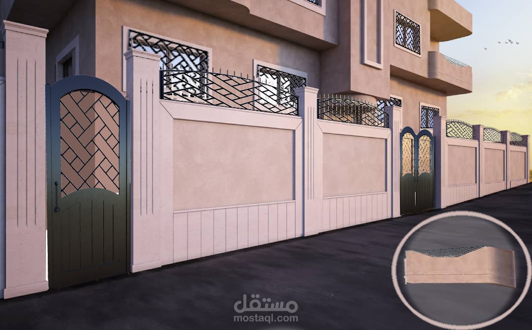 اختيار سياج ملائم للمباني المحيطة و يتناسي مع التصميم و أعمل به كسور للحائط و الشرفات و الباب الرئيسي و سياج للنوافذ