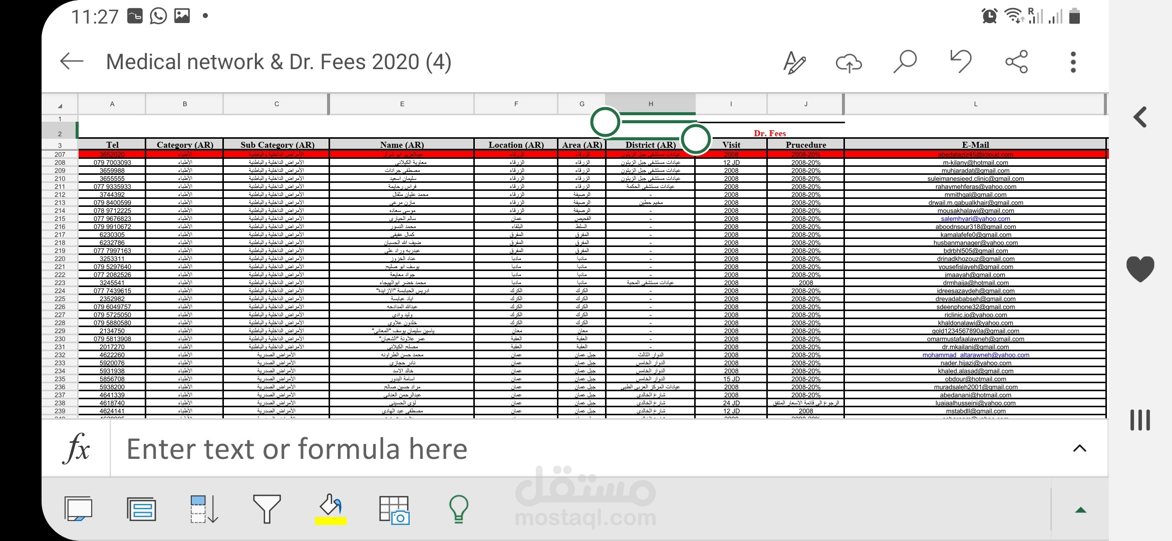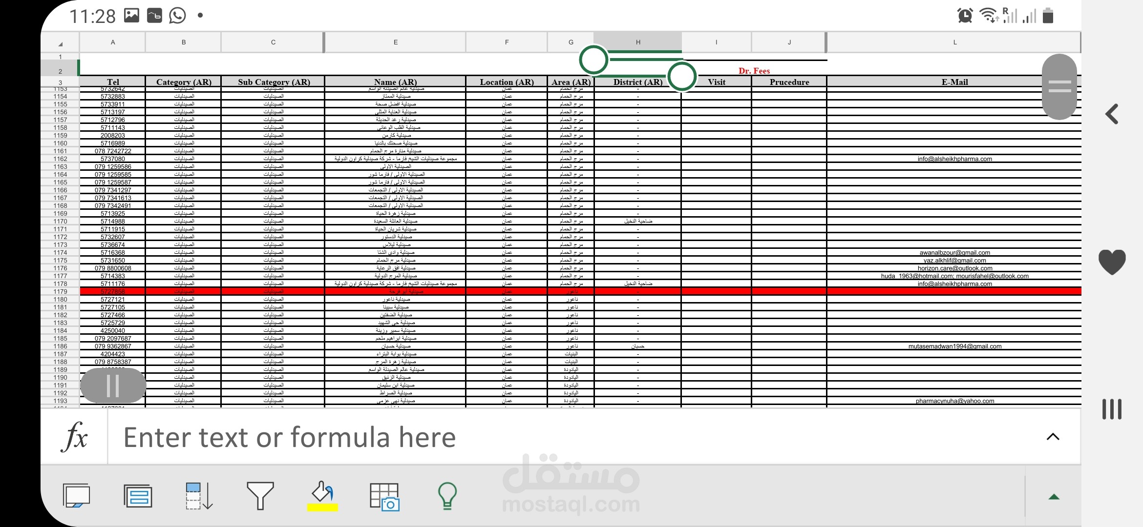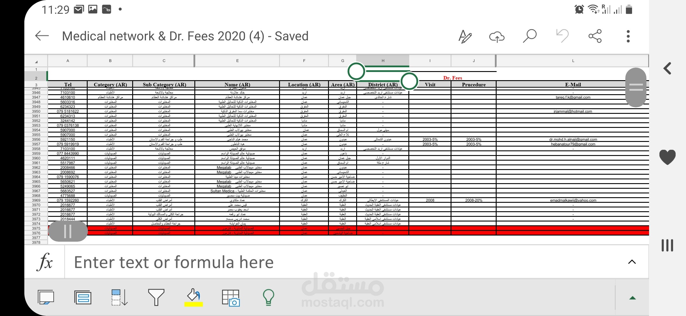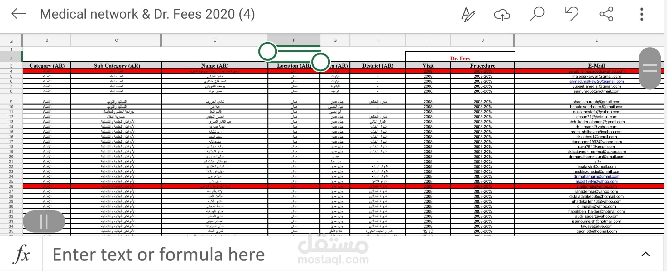 جدول يخص إحدى شركات التأمين يتضمن اسماء الجهات الطبية التابعة لشبكتهم الطبية مع عناوين هذة الجهات، أرقام الهواتف، البريد الالكتروني الخاص بكل منهم والأسعار المتفق عليها معهم.