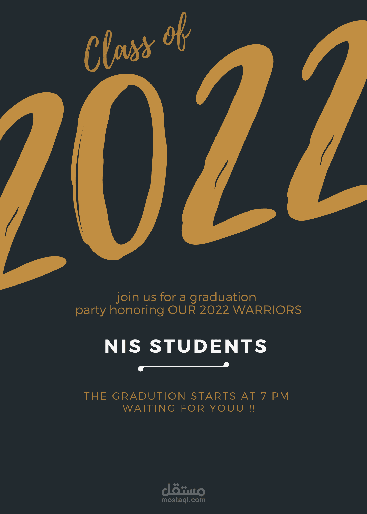 A simple ,elegant ,and minimal graduation design inviting parents and junior students to attend the class of 2022s graduation at NIS highschool of Egypt it was preformed using photoshop and the date and time of the event