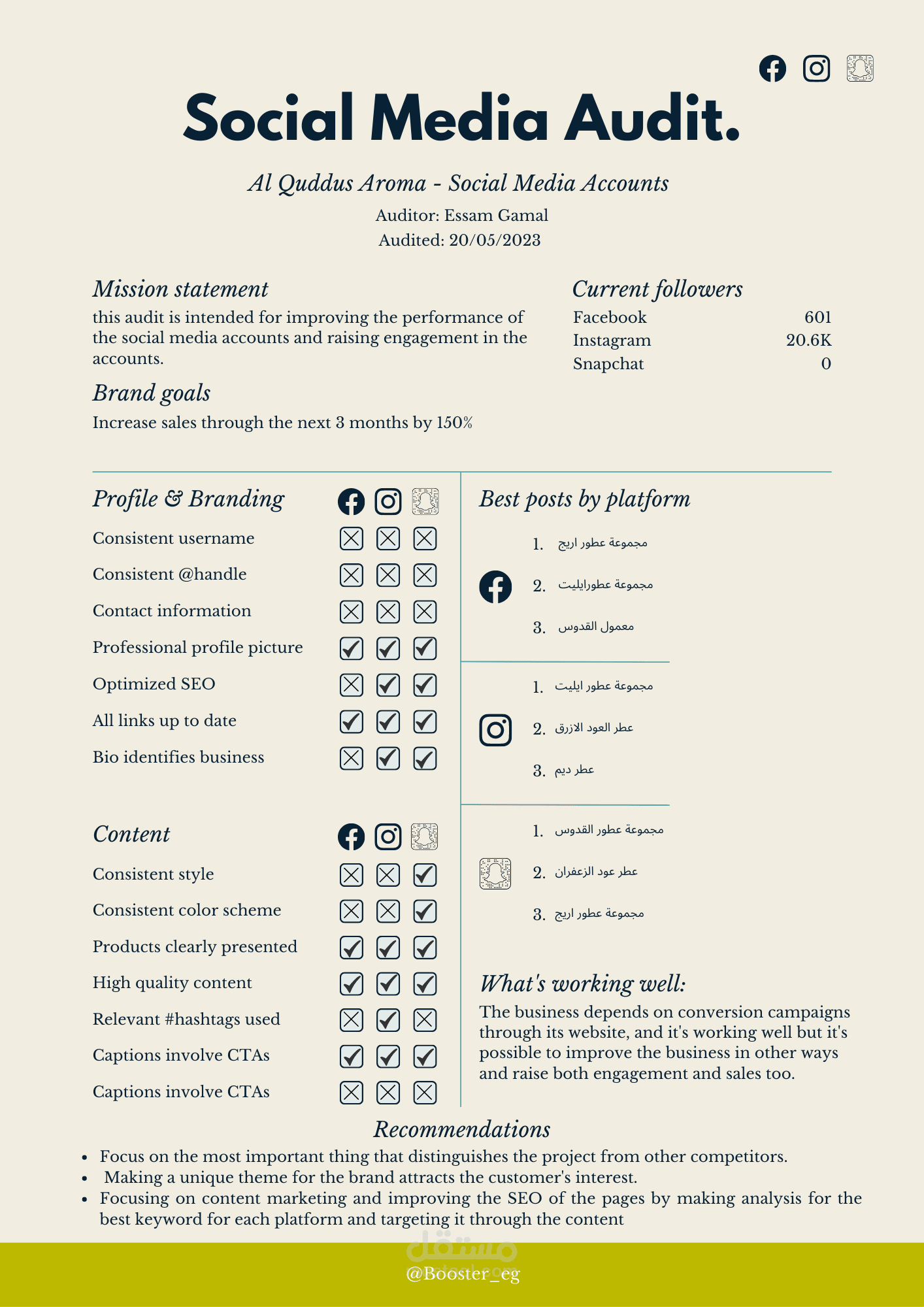 قبل البدء في ادارة اي مشروع يتم عمل بعض الخطوات لتحديد الاستراتيجية المناسبة التي سيتم العمل عليها خلال فترة العمل و من اهم هذه الخطوات عمل فحص و تدقيق على تواجد المشروع على صفحات التواصل الاجتماعي ( فيسبوك، انستقرام، سناب شات، لينكد ان، تويتر، تيك توك ) و تحديد ما يحتاجه المشروع للتركيز عليه خلال فترة العمل للوصول الى الاهداف المطلوبة.