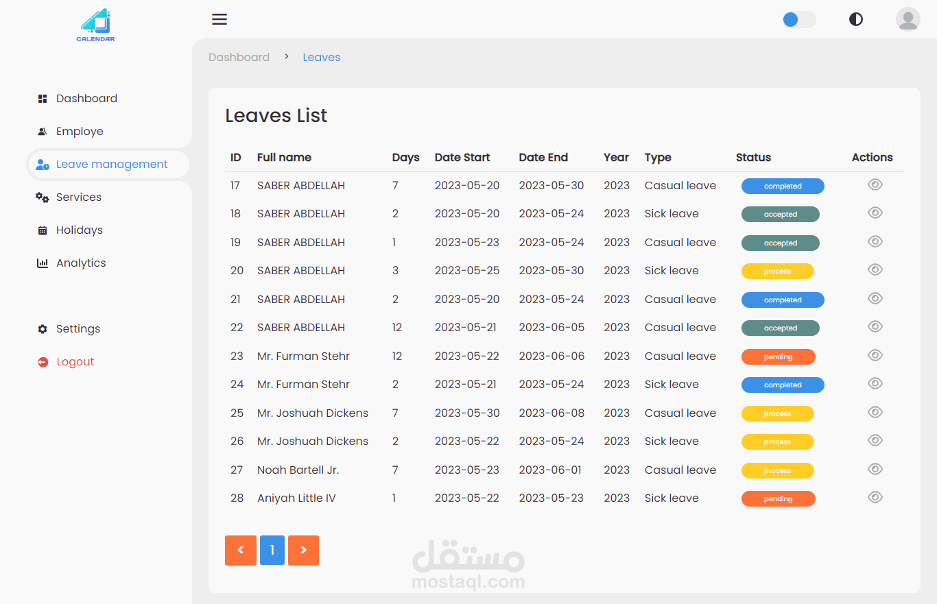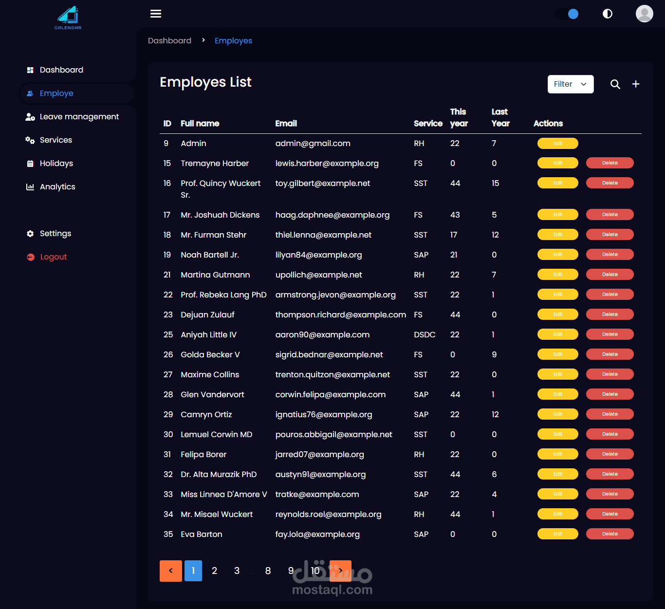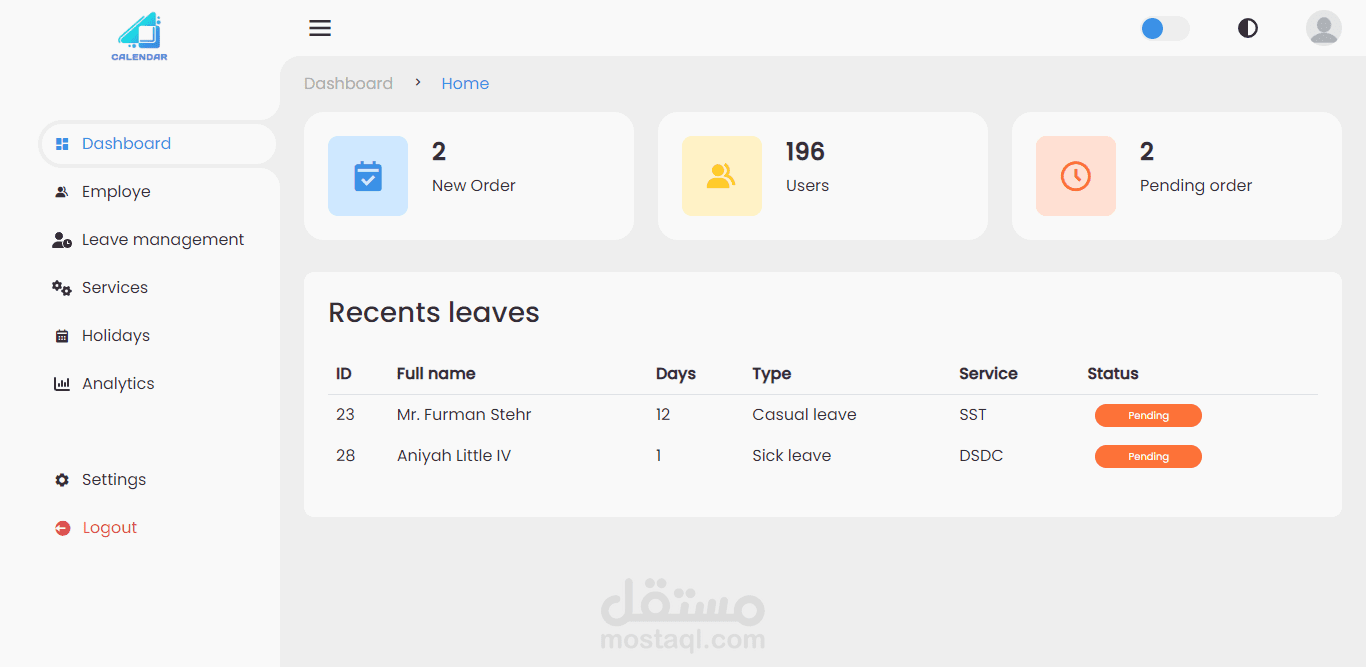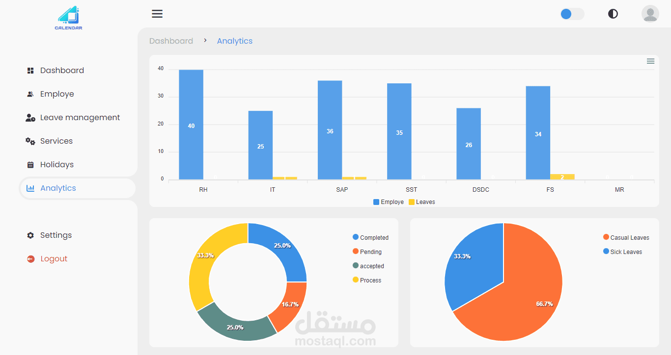نظام إدارة الموظفين لشركة خاصة مع وجود واجهتين منفصلتين: واجهة الموظف لتقديم طلبات الإجازة وواجهة المشرف للموافقة على طلبات الإجازة وإدارة الموظفين. يتكون النظام من عدة صفحات، بما في ذلك صفحة إدارة الإجازات والموظفين، بالإضافة إلى صفحة تحليلات.