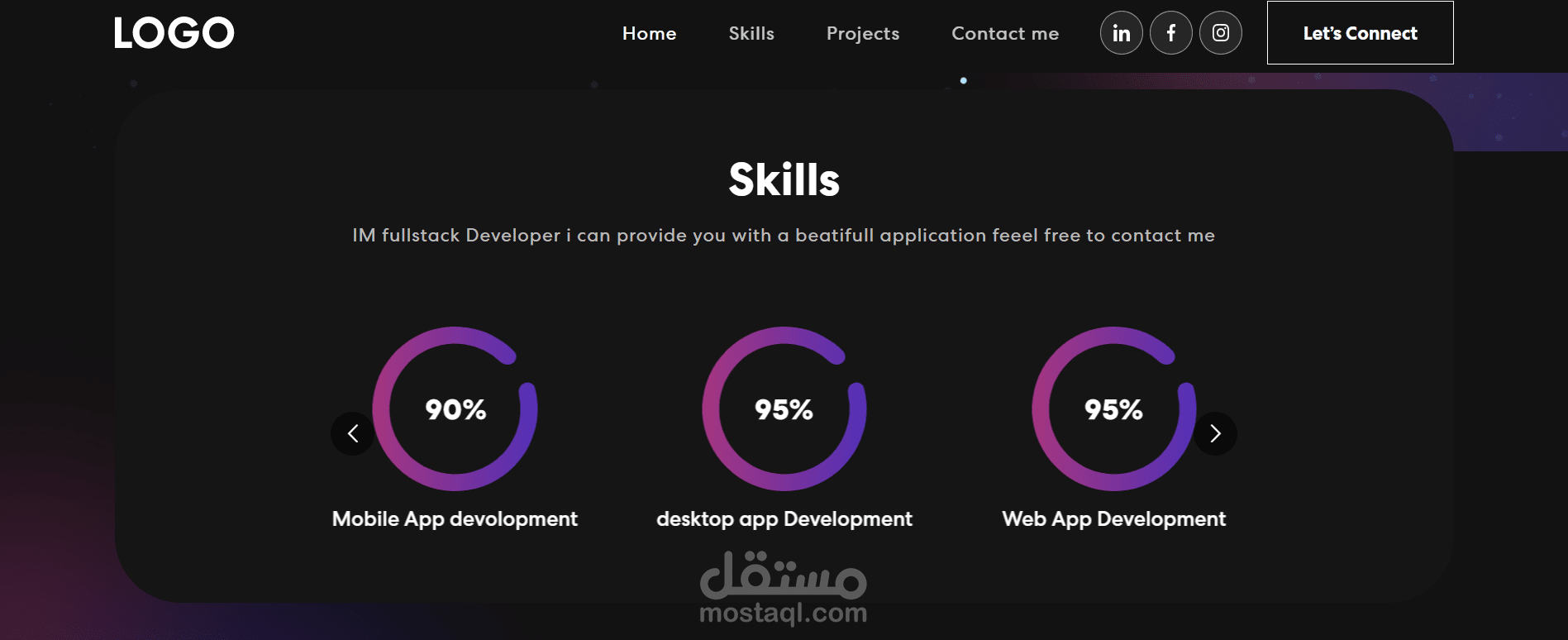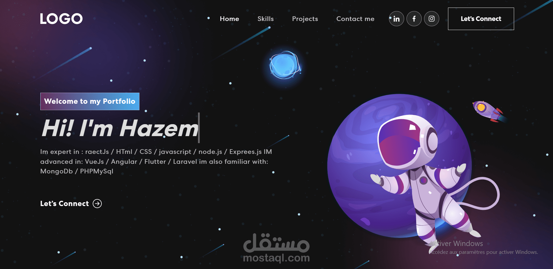 this project is created by me with the freamwork of javascript (ReactJs)it contain 4 pages (home/skills/projects/the form section )