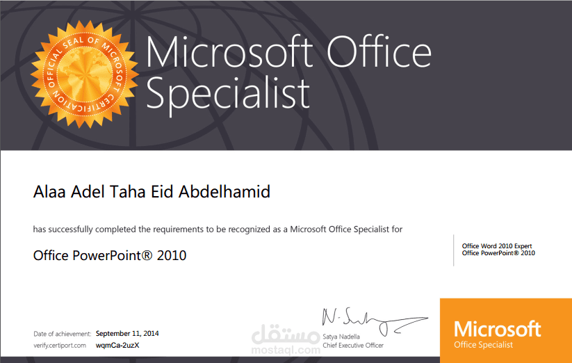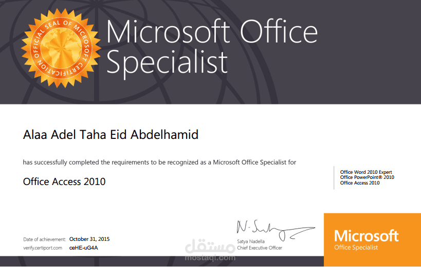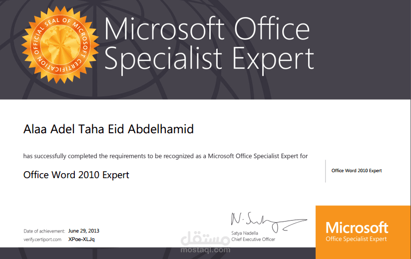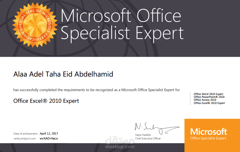 شهادة الخبرة من ميكروسوفت تعني إن الحاصل عليها قد قام بإجتياز الاختبارات التي تمثل أساسيات العمل والتعامل مع برامج الأوفيس : إكسل - وورد - باوربوينت - أكسس