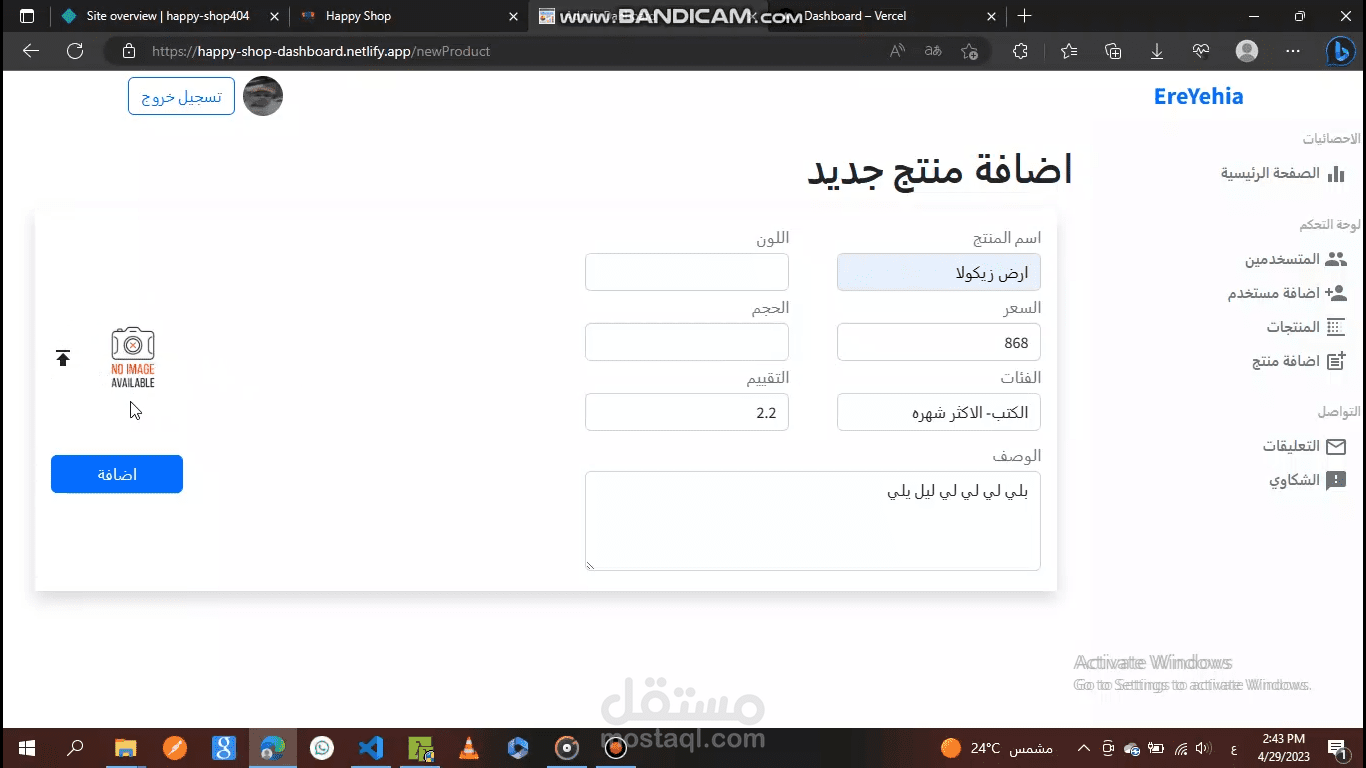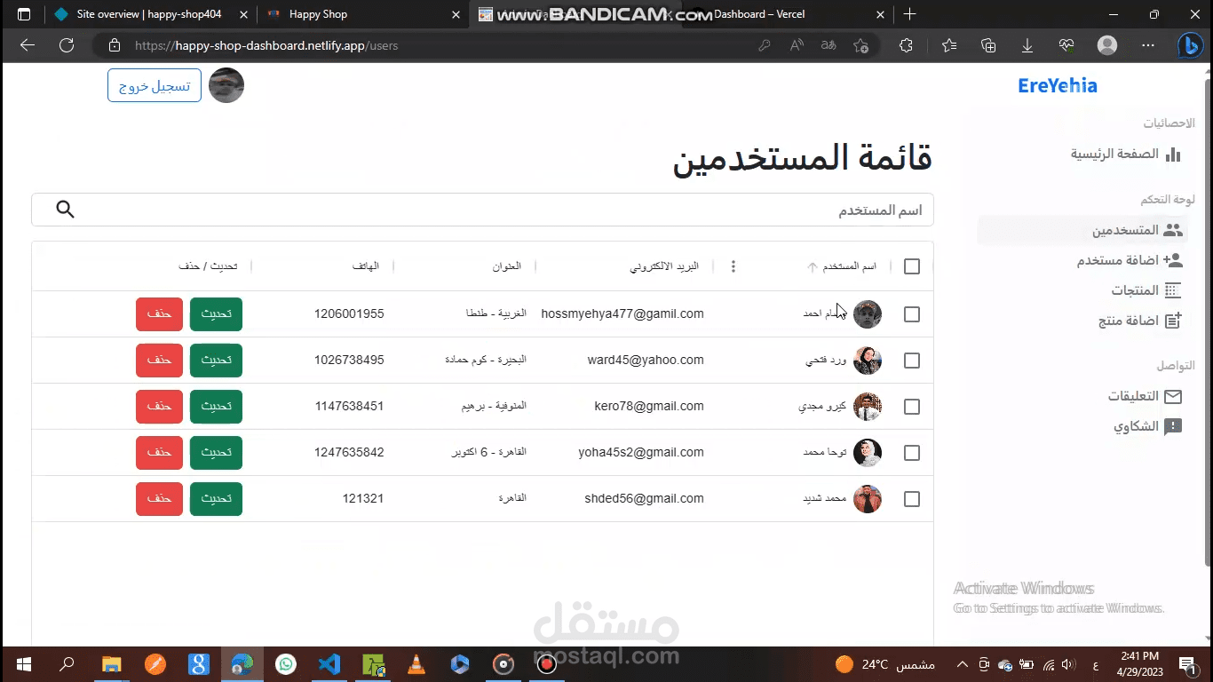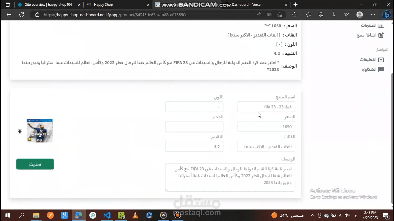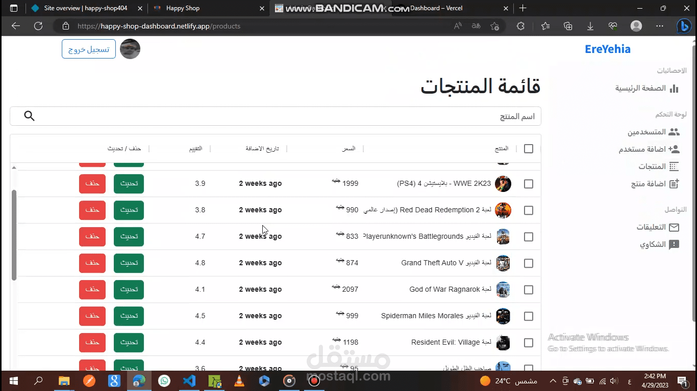 لوحة التحكم لموقع Happy Shop، حيث نستطيع التحكم في الموقع الرئيسي عن طريق الإضافة أو الحذف أو التعديل