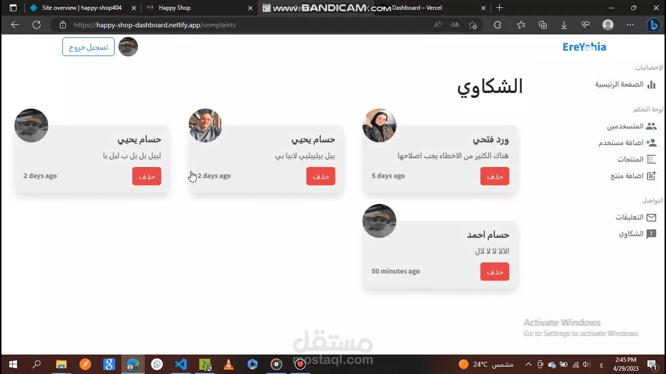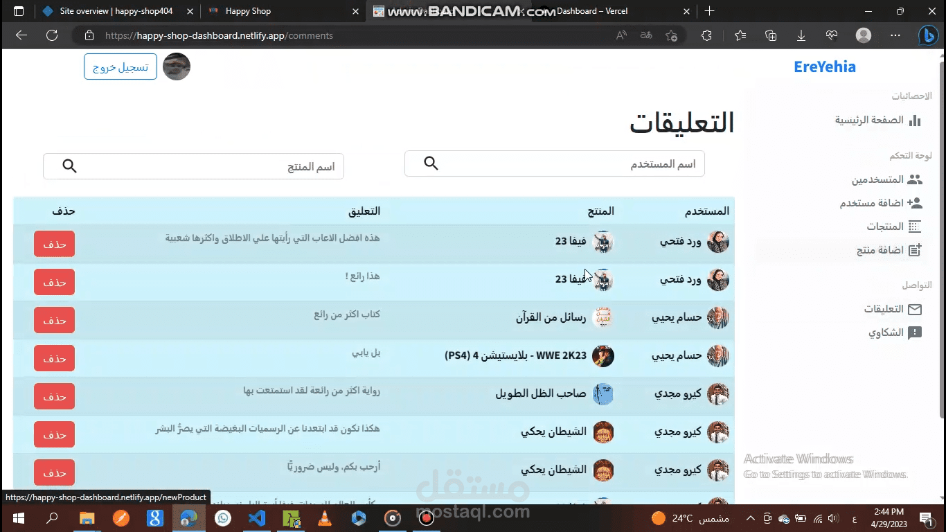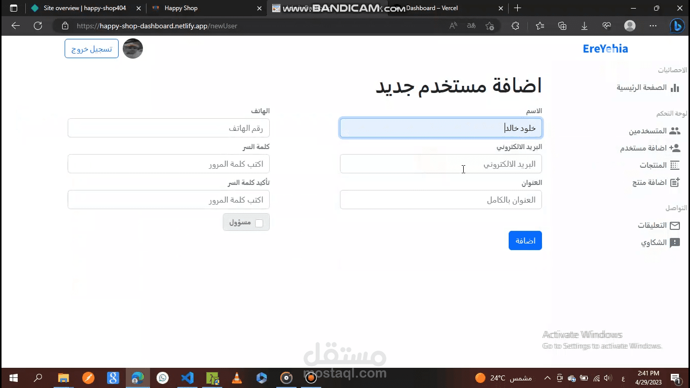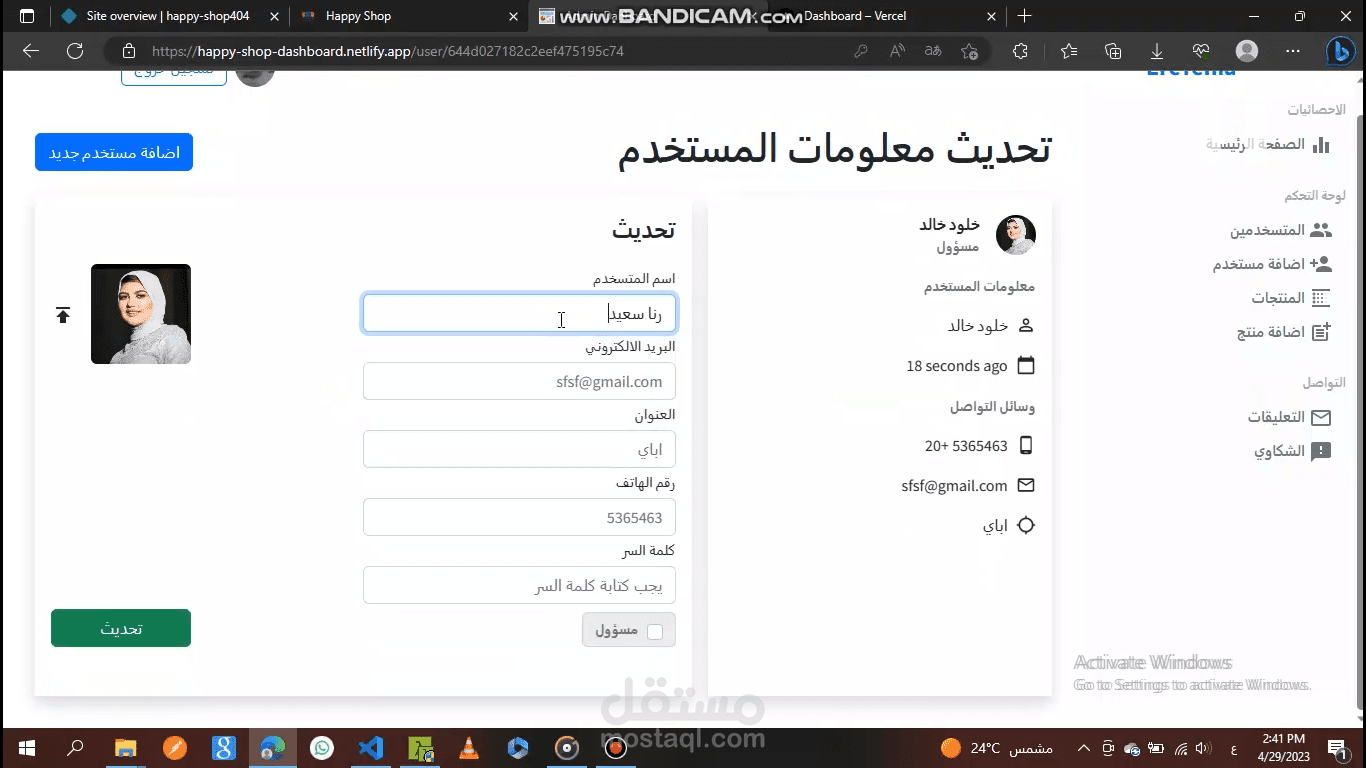 لوحة التحكم لموقع Happy Shop، حيث نستطيع التحكم في الموقع الرئيسي عن طريق الإضافة أو الحذف أو التعديل