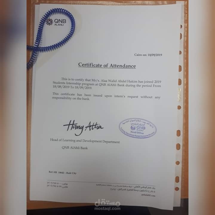 حاصل علي شهادة تدريب في البنك القطري ...2019