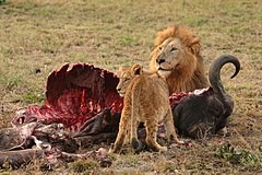 افتراس:أسد وشبل يتغذيان من ثور افترساه.