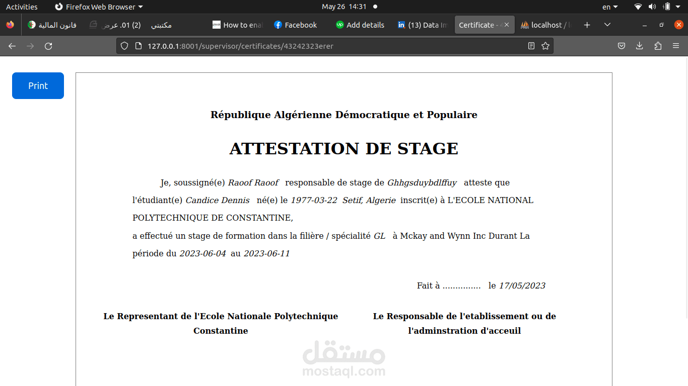 عندما يكمل الطالب فترة التدريب ، سيحصل على شهادة من مشرف التدريب.