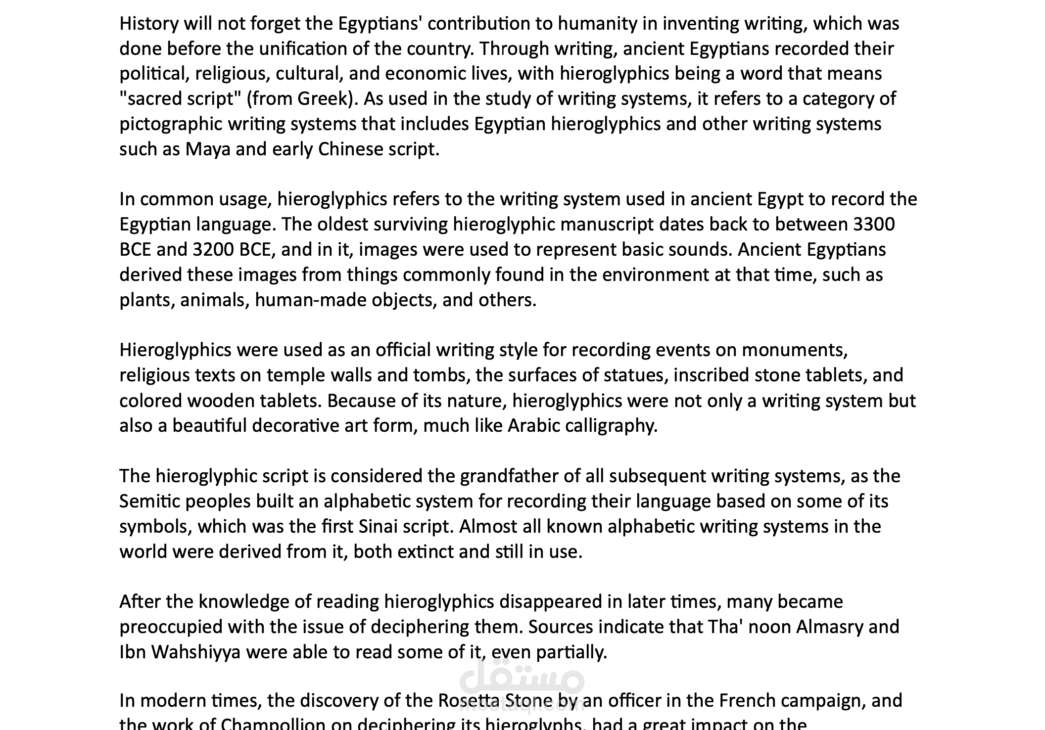 تم عمل بحث عن الكتابات المصريه القديمه وترجمته من اللغه العربيه الي اللغه الانجليزيه.