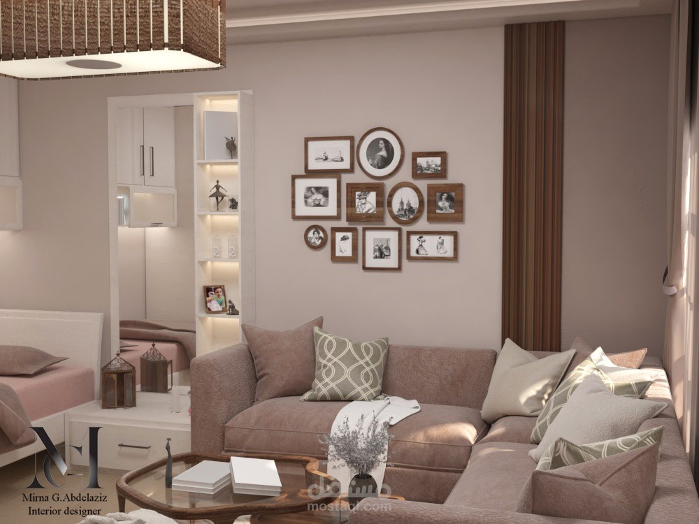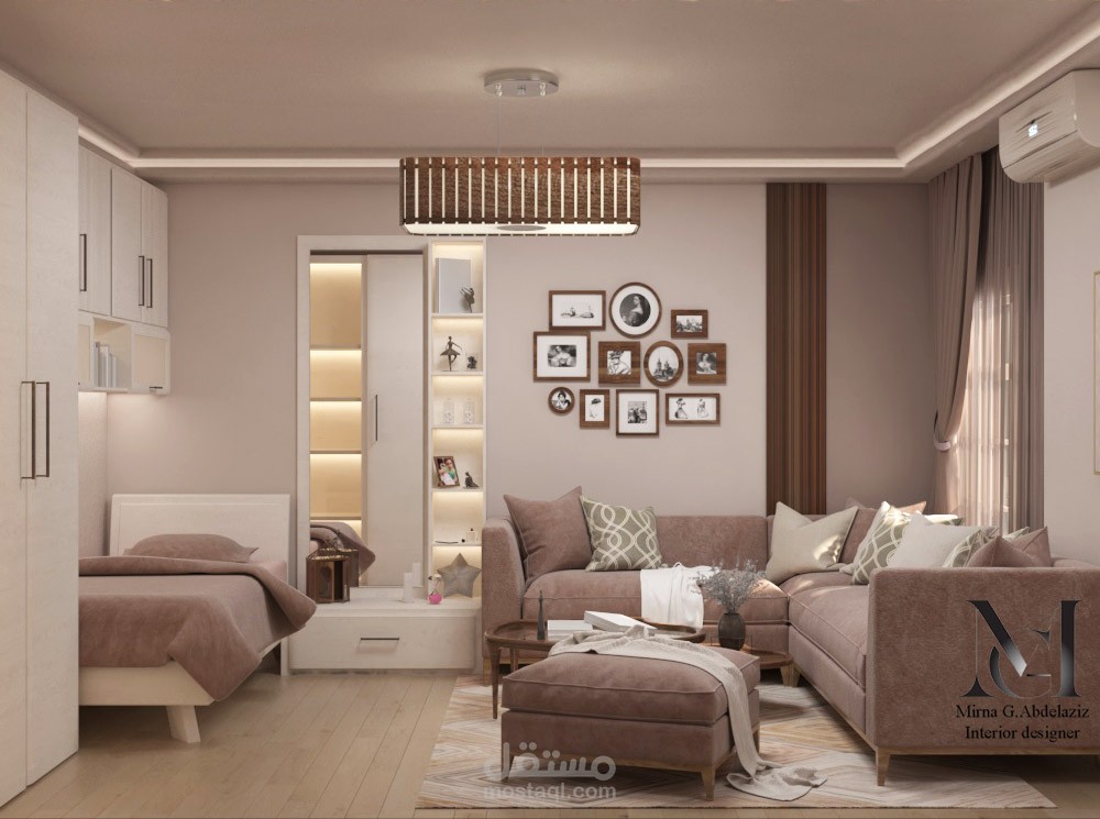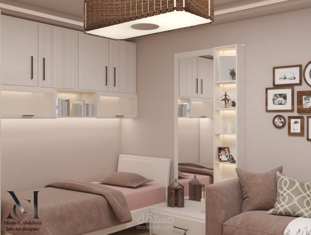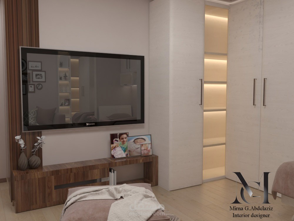 غرفة طفلة مع مراعاة طلب العميل بعمل جزء من الغرفة كغرفة معيشة او ركنه بتلفزيون لاستغلال الغرف فتم عمل وحده 3*1 للفصل بين الغرفة و الركنه واستخدامها كتسريحه و كا كمود للطفله و عمل الدولاب يناسب المساحه و استغلالها و ايضا يتيح اماكن للتخزين و استغلال جزء منه كمكتبه للالعاب و الكتب