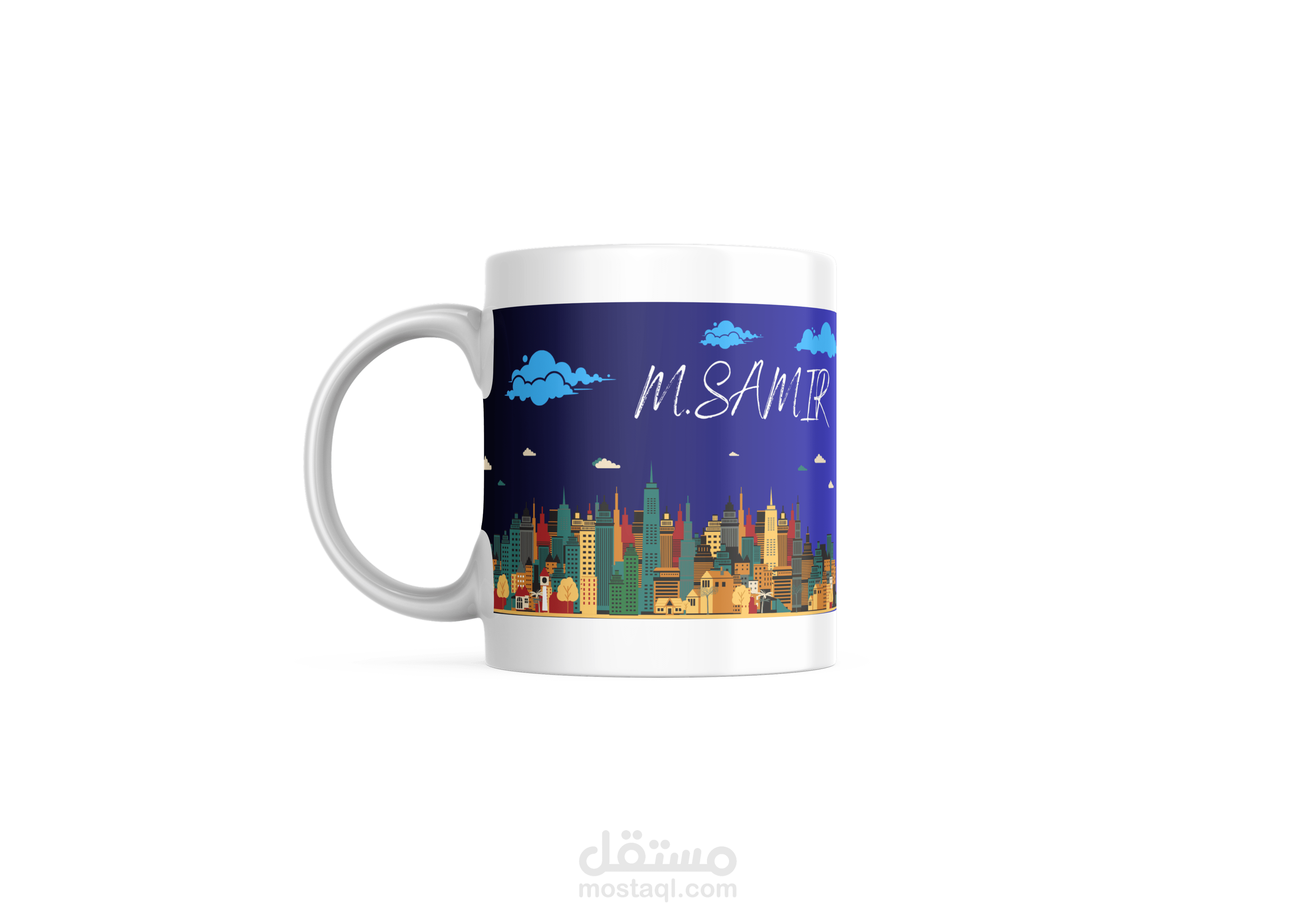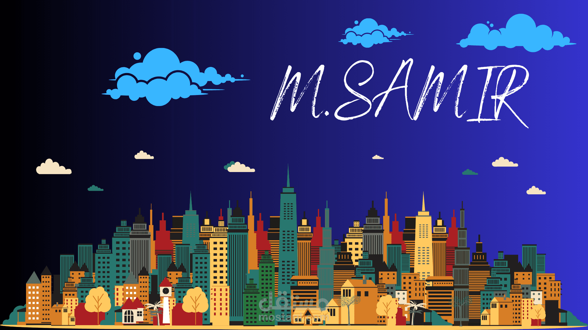 هذه العمل يمثل صورة لخلفية كمبيوتر تجسد مدينة مذهلة مع مجموعة من ناطحات السحاب الضخمة. تبرز السماء الزرقاء الواضحة والسحب الطبيعية في الخلفية، مما يعزز جو المدينة الحديثة والمذهلة. تظهر هذه الصورة توازنًا جميلاً بين الألوان المحايدة والمشرقة، حيث تتألف ناطحات السحاب من مزيج من الألوان الحمراء والصفراء والخضراء والرمادية بالاضافة لوجود اسم صاحب الخلفية مكتوب عليها.