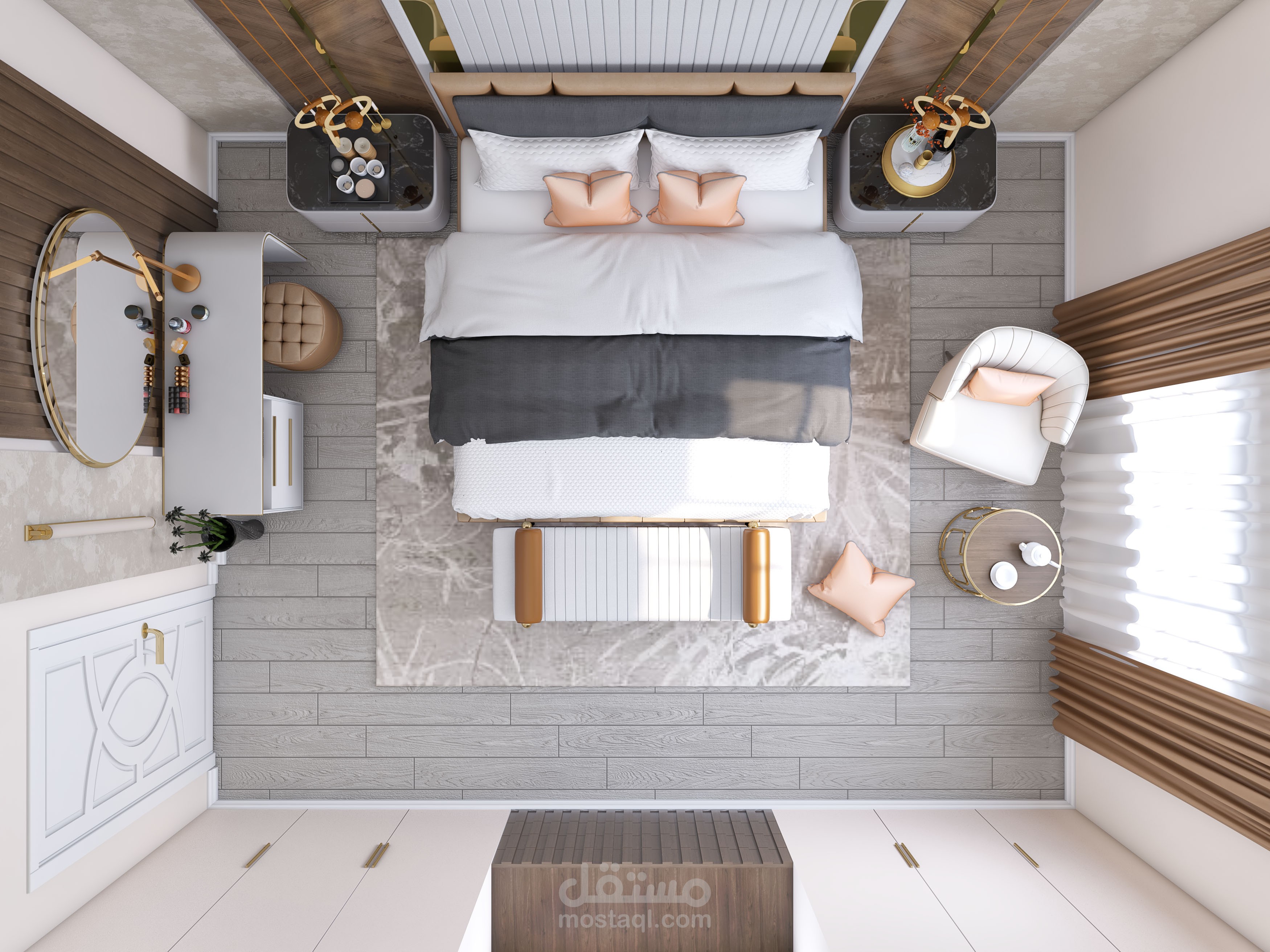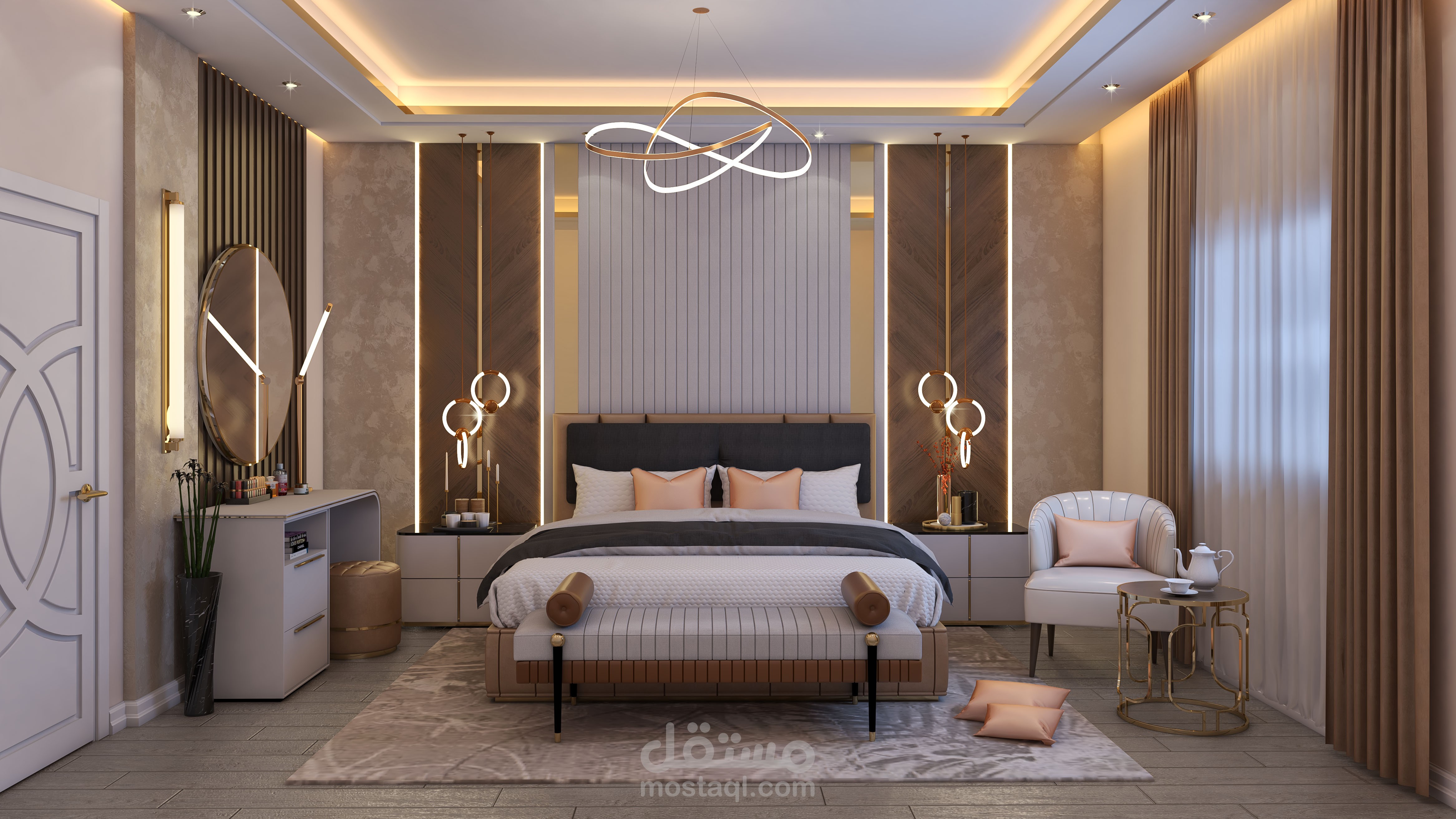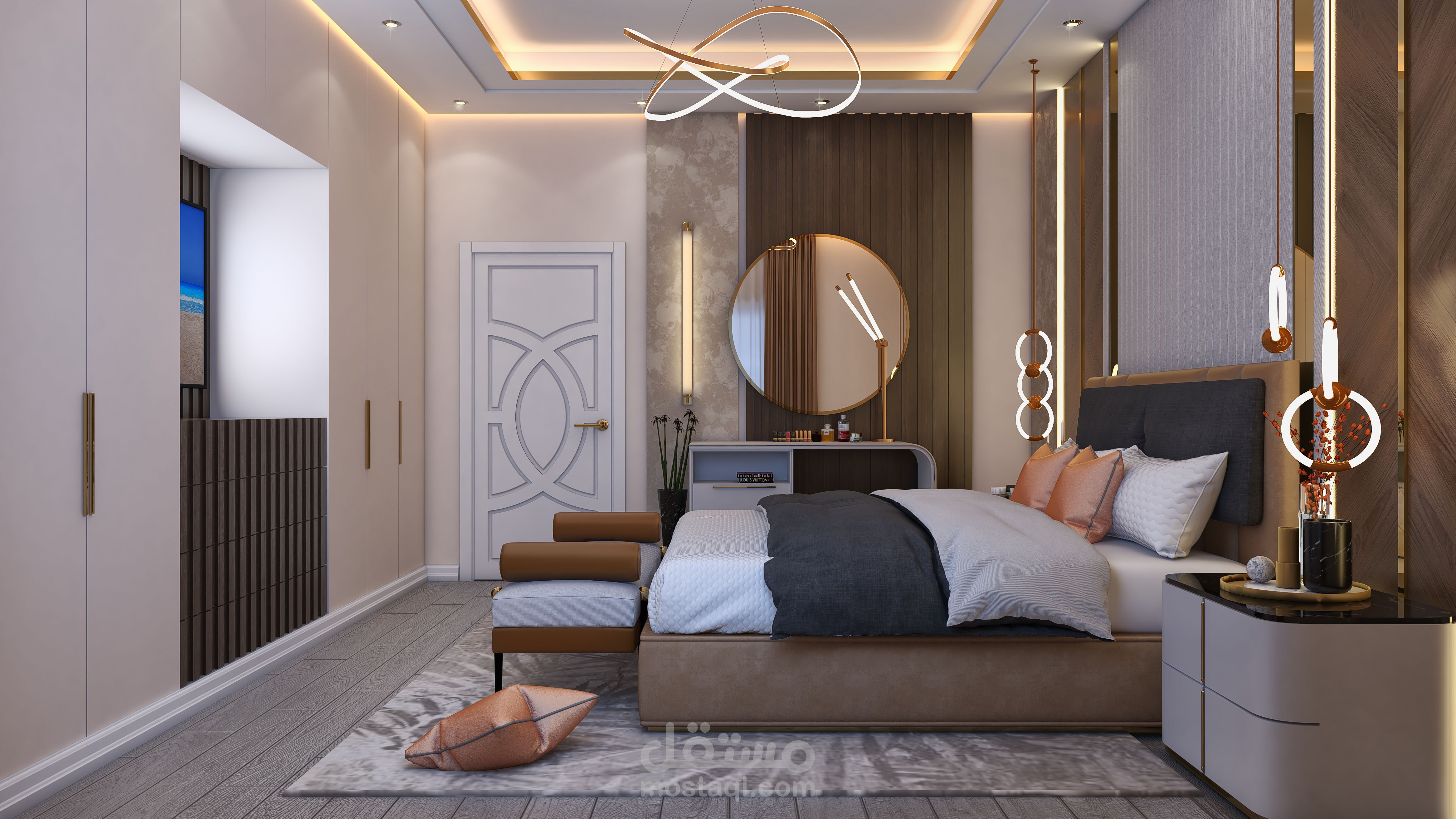 تصميم لغرفة نوم فخمة تحتوي على سرير و٢كومود وتسريحة ودولاب بعرض ولون الحائط به فراغ لتلفاز.