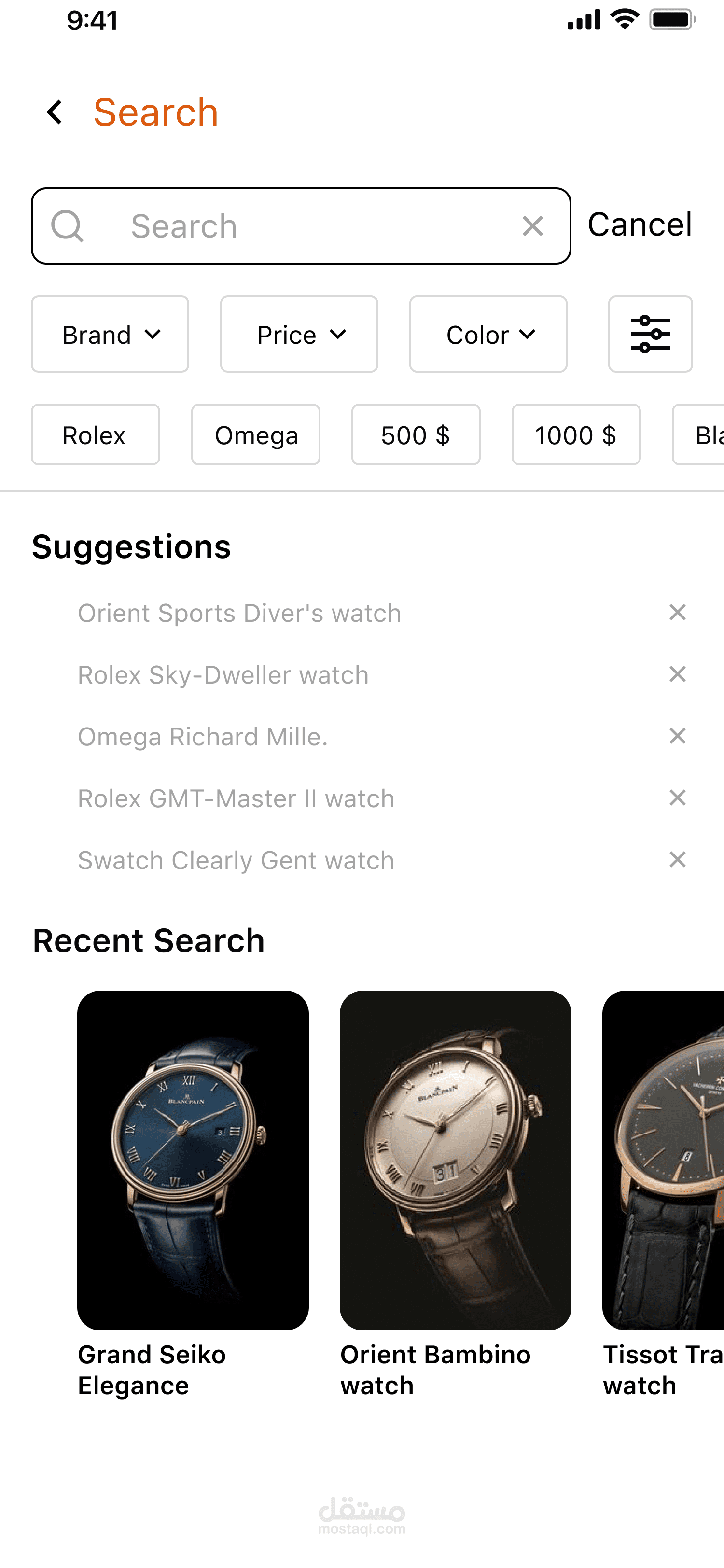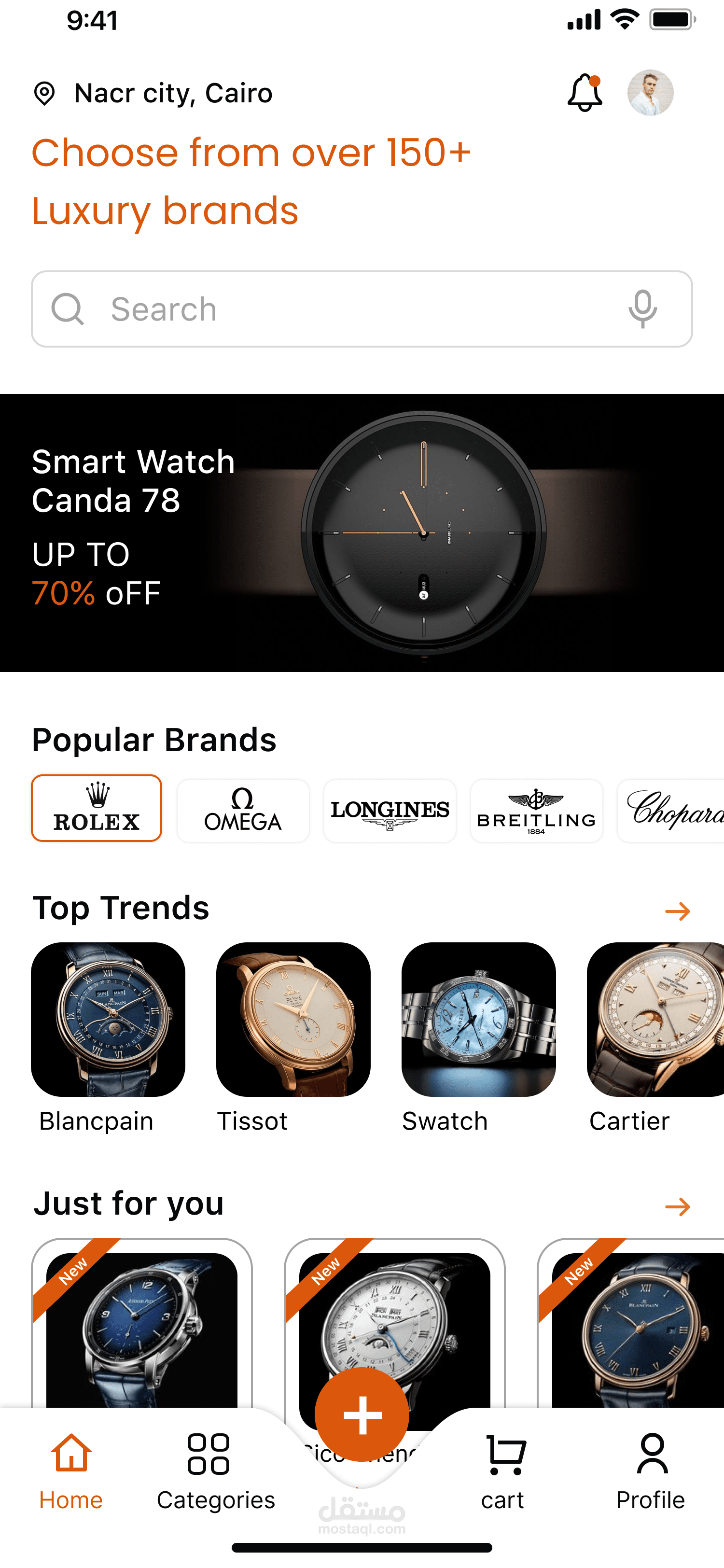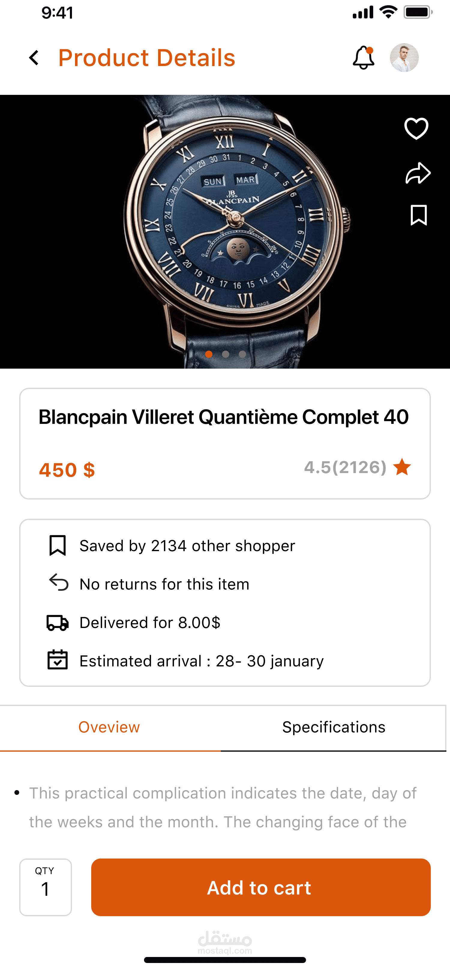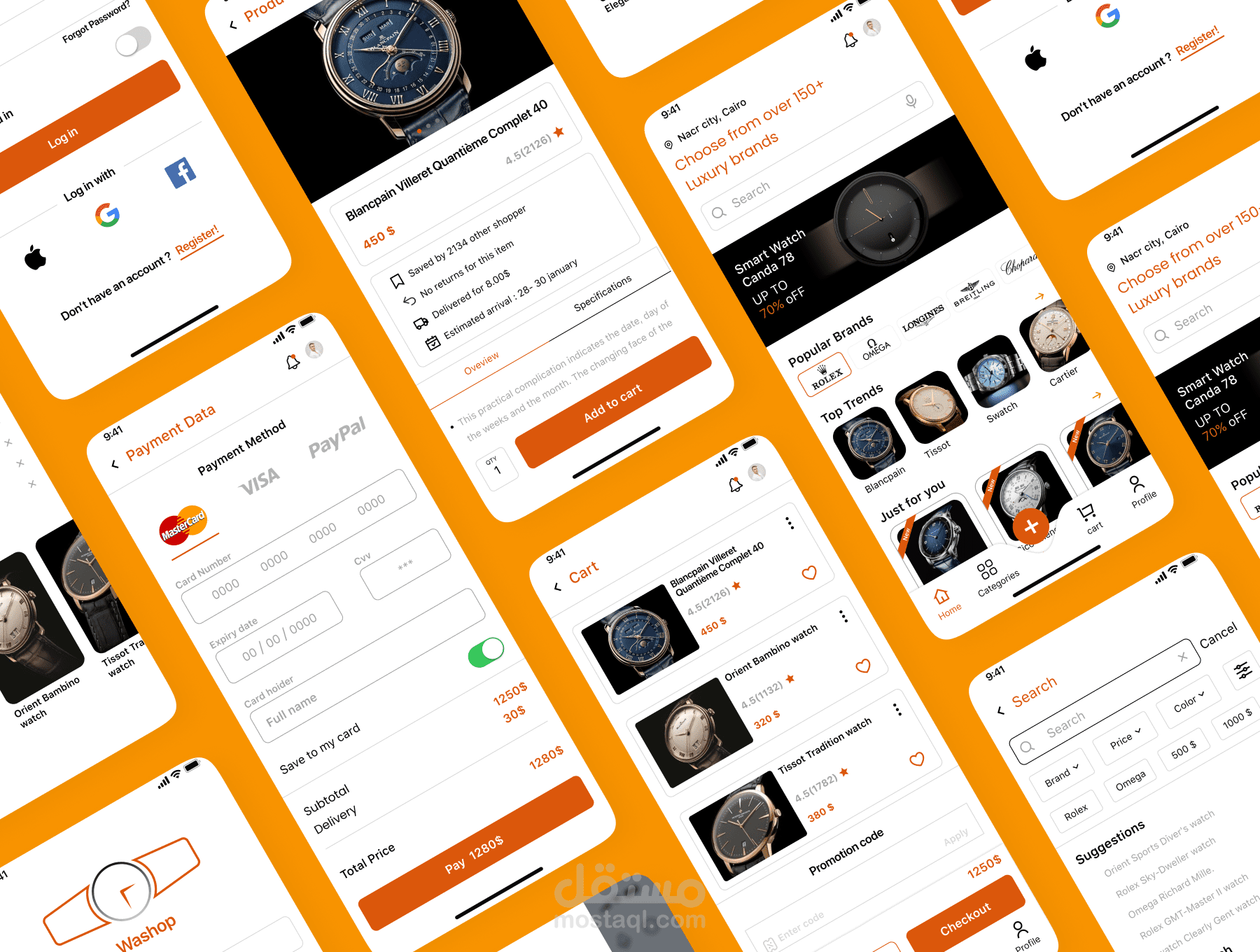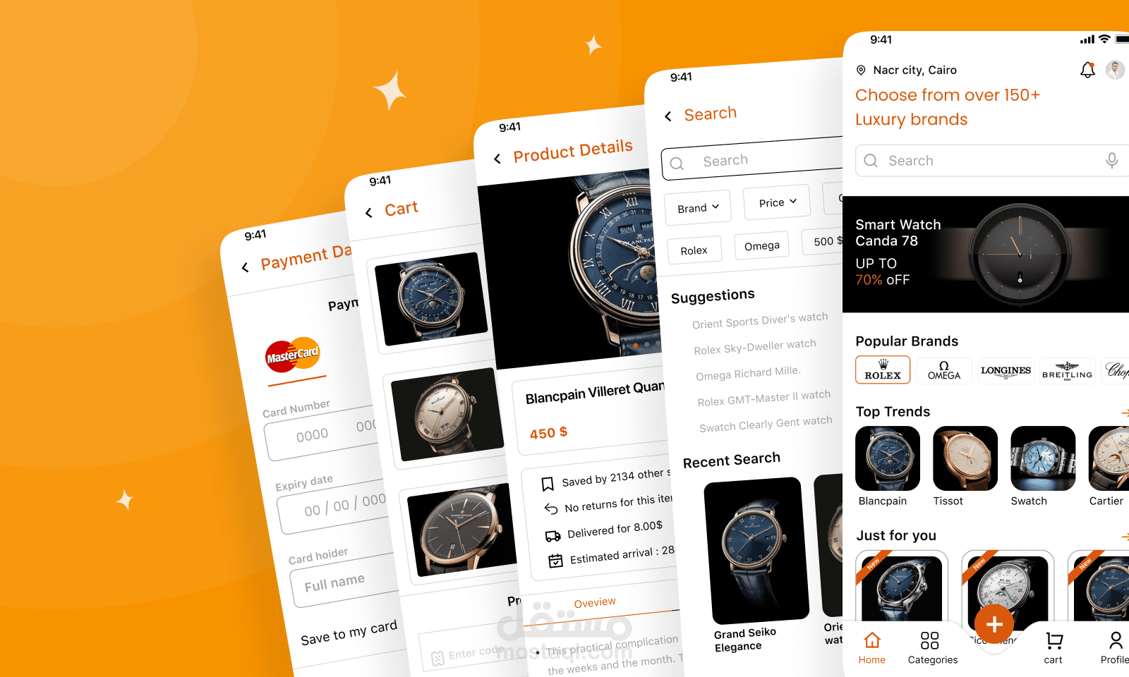 تصميم سريع لبعض الاسكرينات الخاصه بتطبيق متخصص في بيع الساعات حيث تم استخدام برامج فيجما و فوتوشوب واليستريتور والاستعانة بقوانين تصميم التطبيقات والالتزام بمادئ التصميم