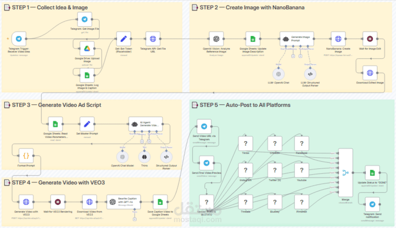 1. **Idea & Image Collection:** The workflow starts by receiving an idea and image from a **Telegram** message.