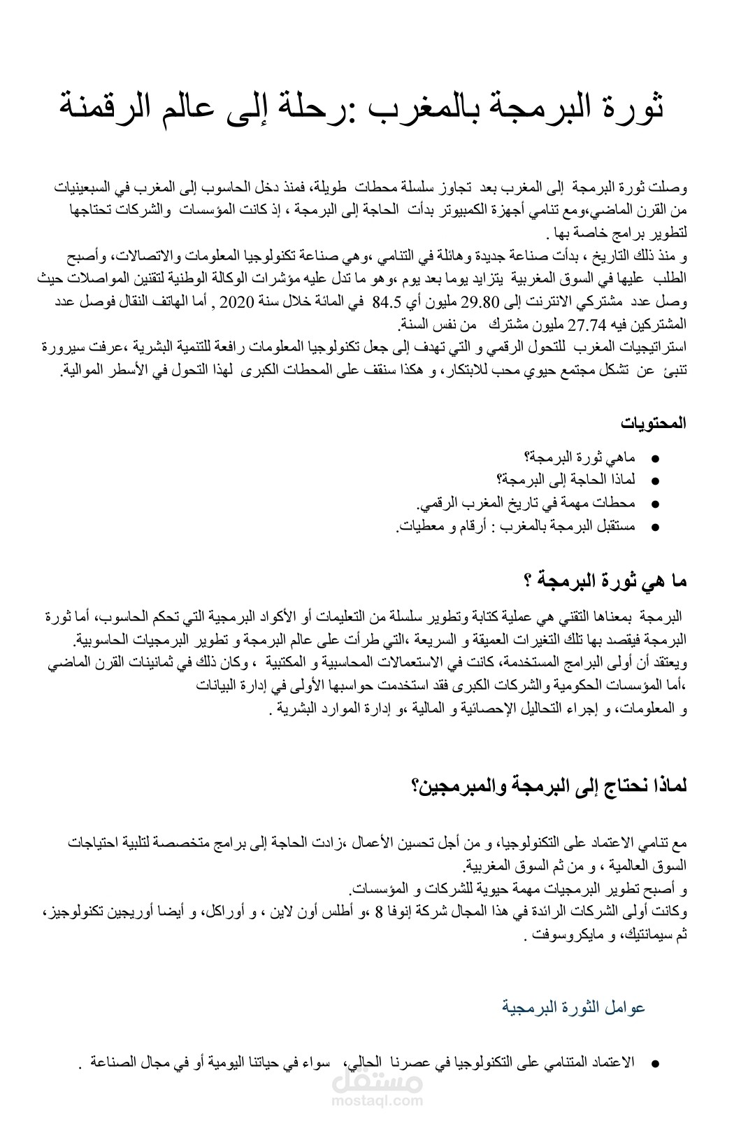 هذه المقالة هي خلاصة بحث عن ثورة البرمجة في المغرب ،مسار طويل ،بلغة عربية جميلة و بتتبع احترافي لعالم البرمجة في المغرب منذ انطلاقاتها الاولى في الثمانينات إلى اليوم ،مع استشراف مستقبل واعد للمبرمجين .