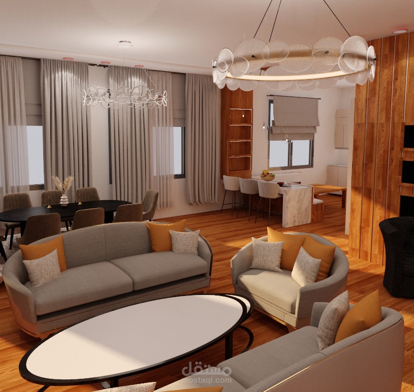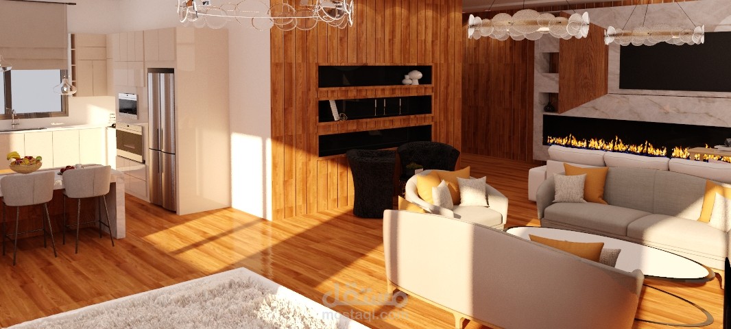 تصميم داخلي ل غرفة معيشة مع مطبخ وبار