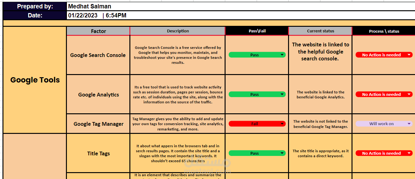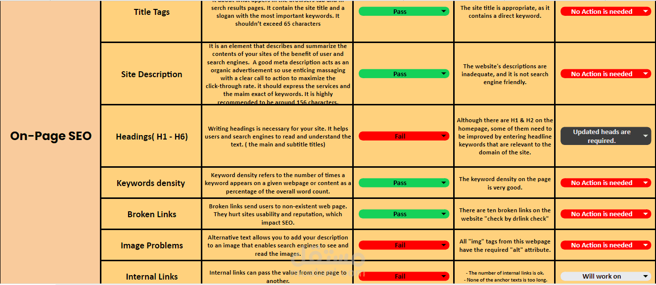 1. البنية والتنظيم: يتم فحص هيكلية الموقع وتنظيمه للتأكد من وجود هيكلية صحيحة وروابط داخلية قوية، كما يتم التأكد من توافق الموقع مع معايير SEO واستخدام عناصر HTML المناسبة.