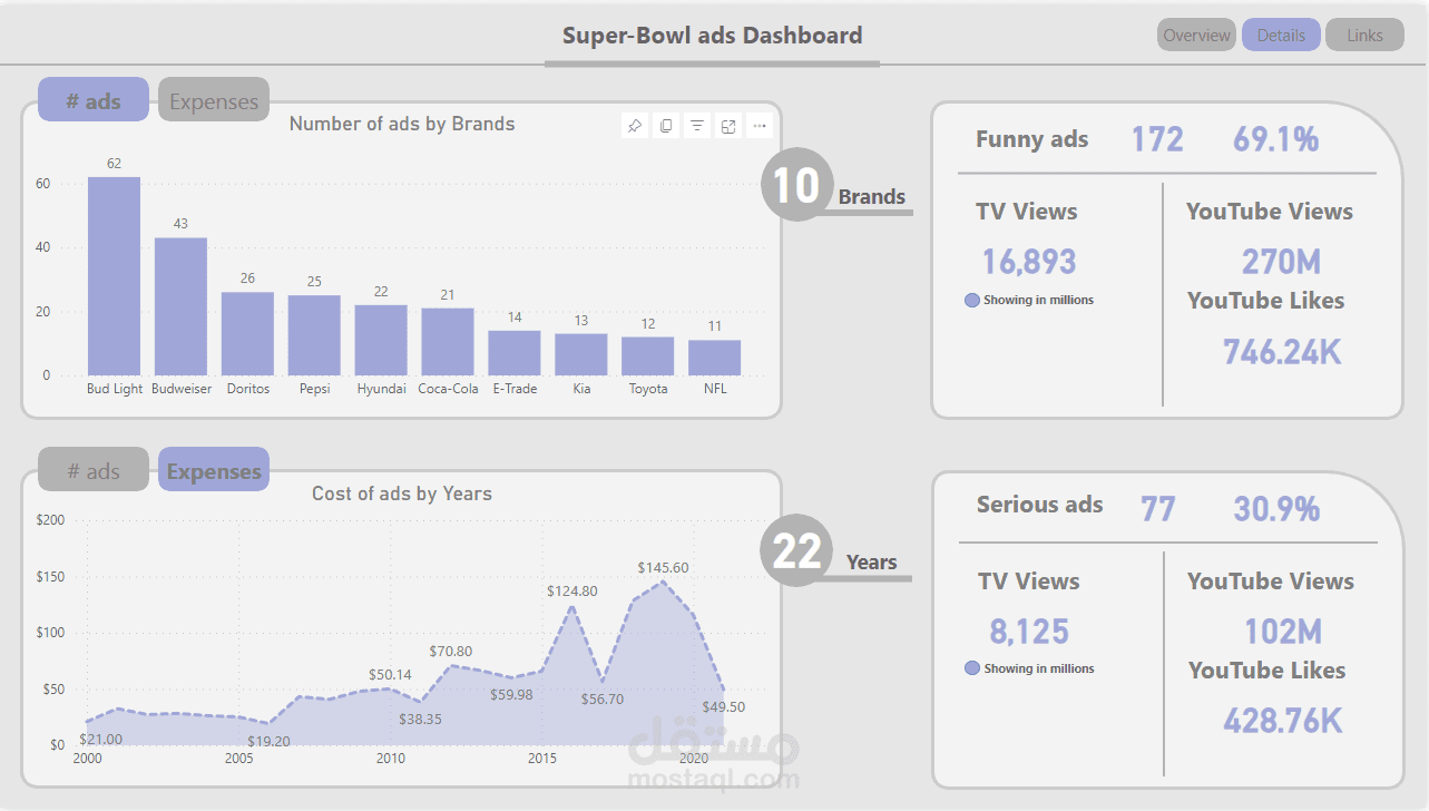 This Super Bowl Ads Dataset Dashboard project demonstrates my proficiency in developing comprehensive and visually engaging reports using Power BI. The dashboard's integration of Super Bowl ad data, trends, and viewer engagement metrics offers users a comprehensive view of Super Bowl advertisements. I am confident that my skills and experience in creating impactful dashboards using Power BI will be a valuable asset to clients seeking to analyze Super Bowl ad data, assess advertising strategies, and make informed decisions related to their marketing campaigns.