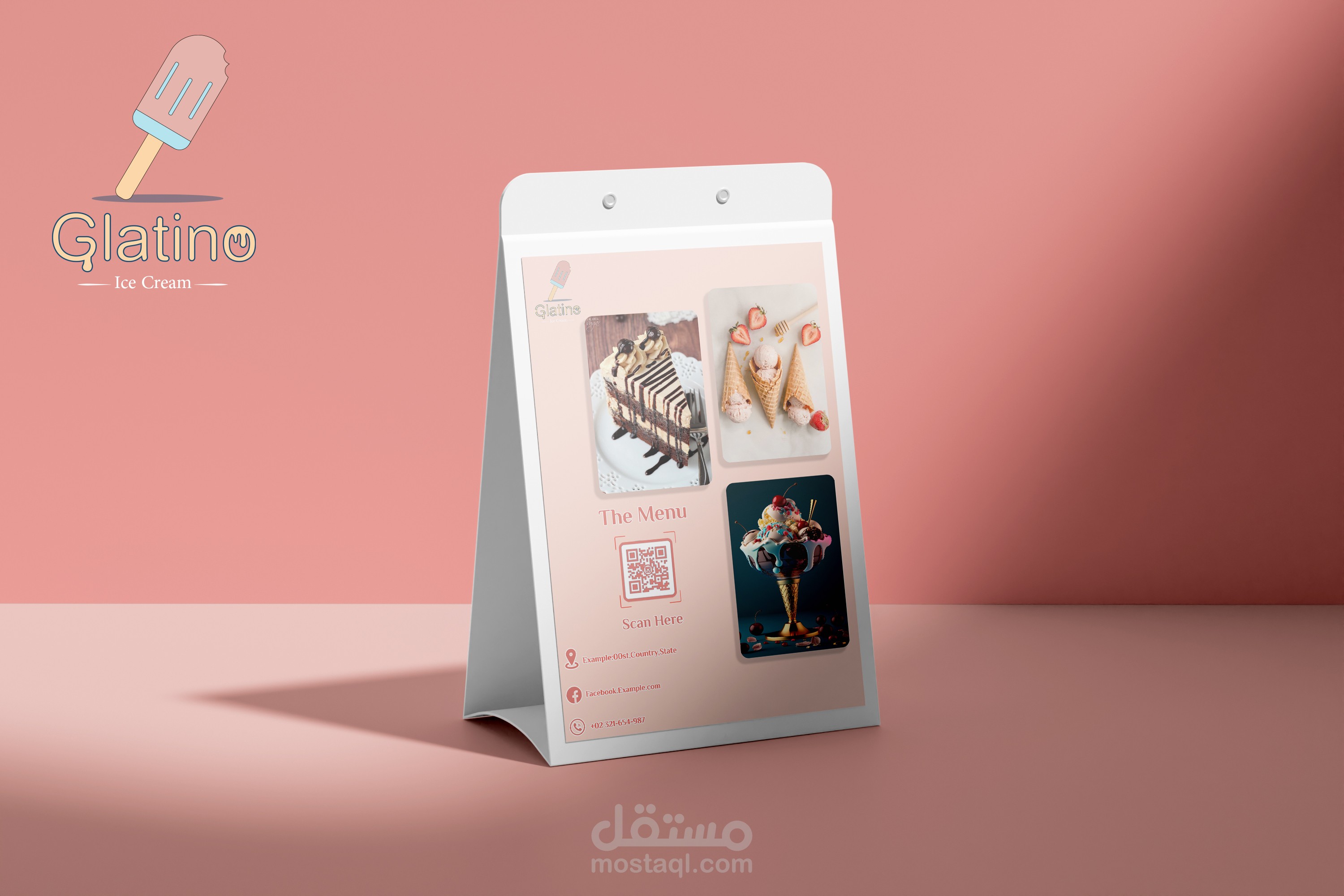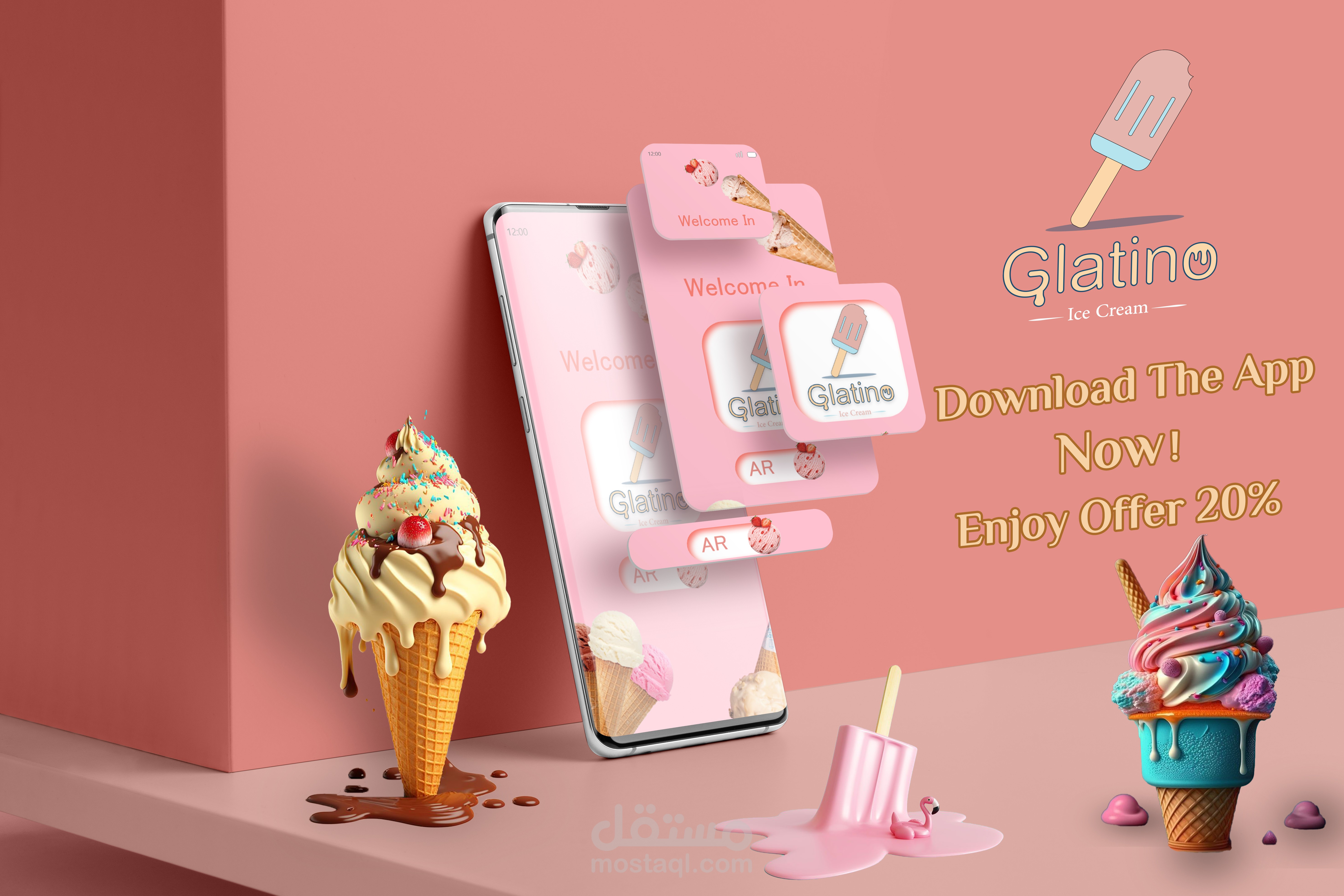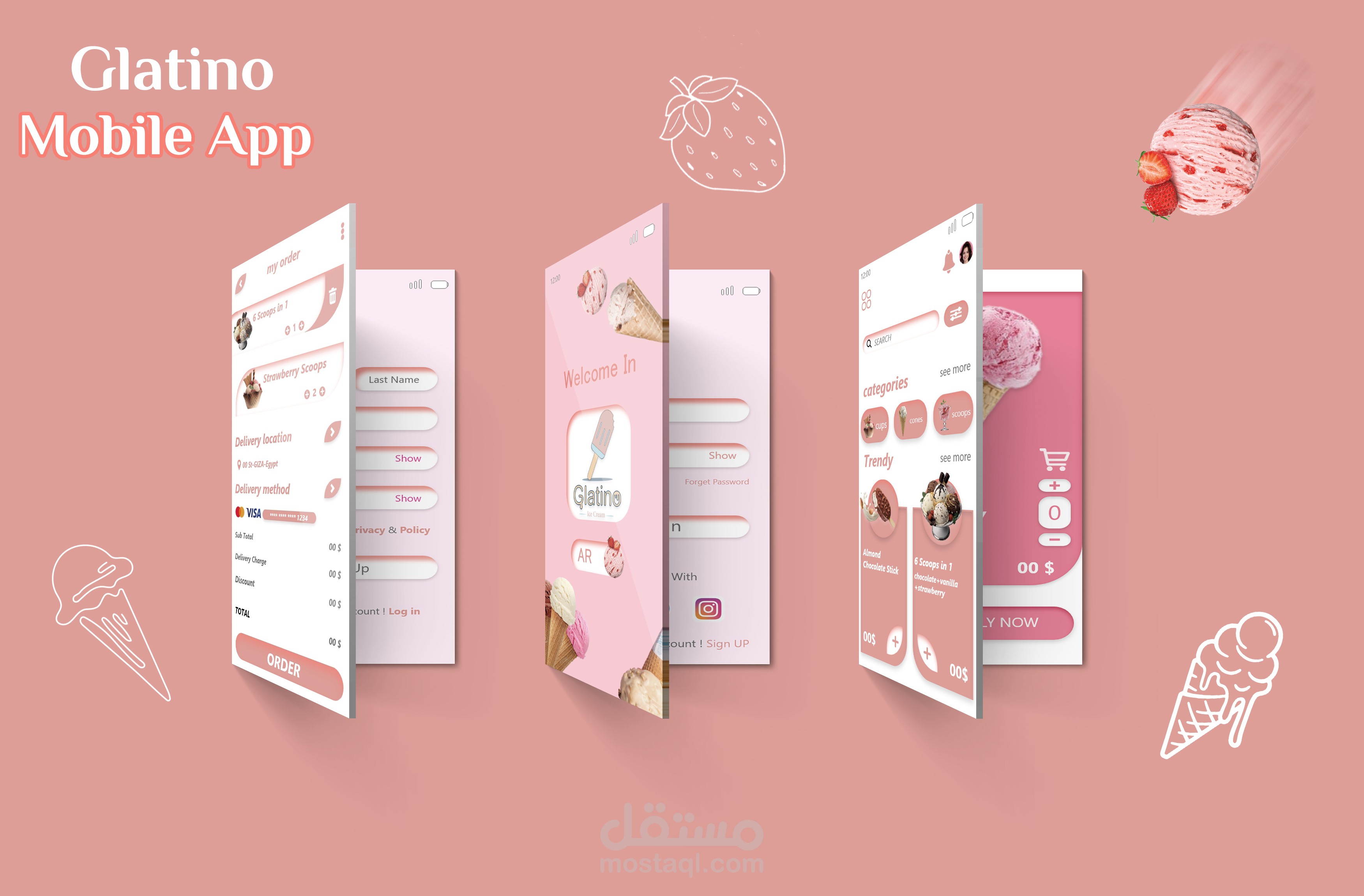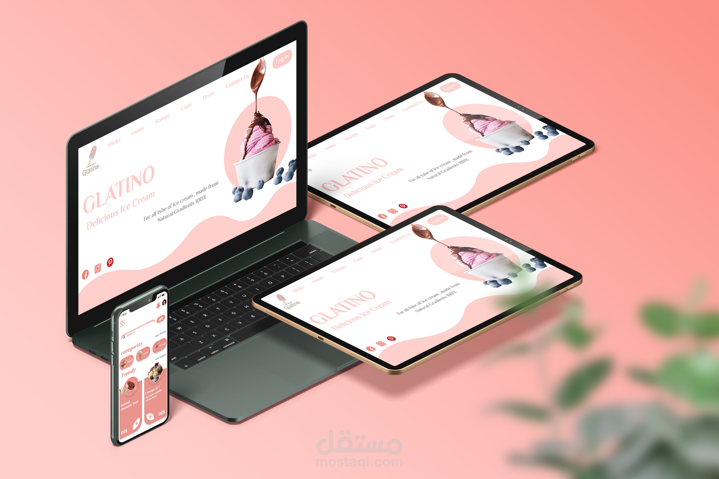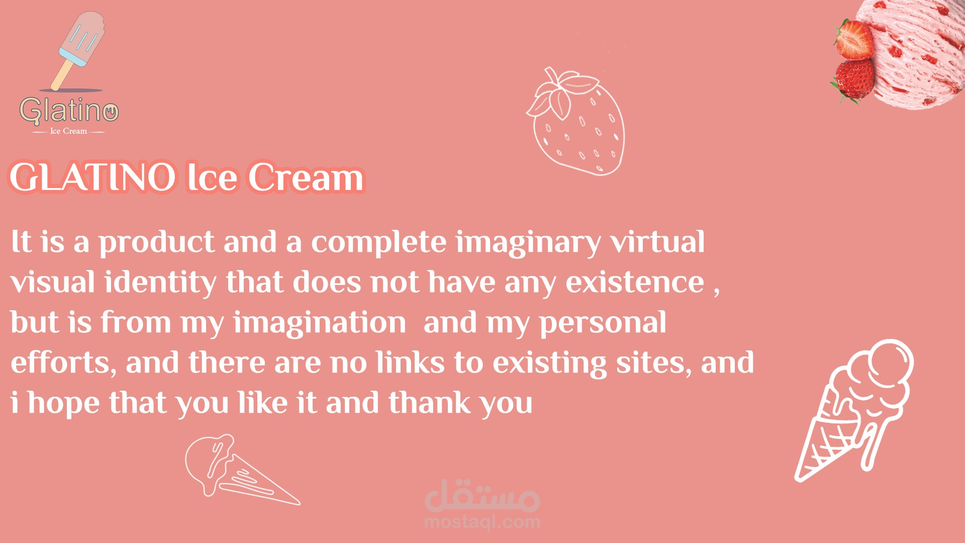 (Glatino) iهوية منتج بصرية لمحل مثلجات افتراضية تخيلية غير موجودة علي ارض الواقع من الروابط الي مواقع التواصل الاجتماعي وتصميم واجهة التطبيق كلها خيالية من جهودي الشخصية شكرا لمشاهدتك واتمني ان تنال اعجابكم.