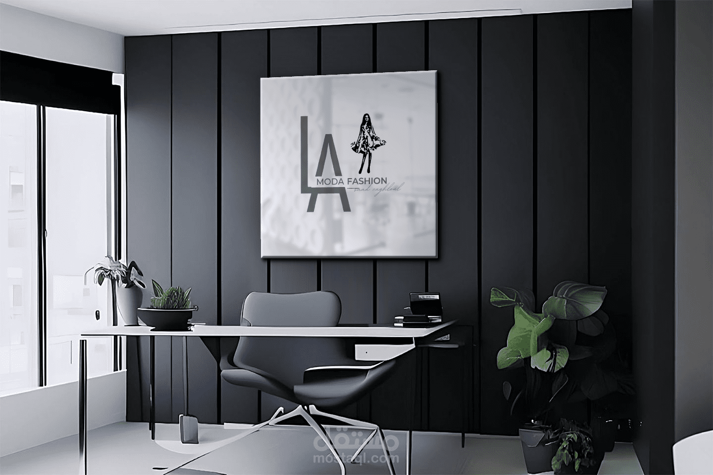 3D logo mockup on black wall office room