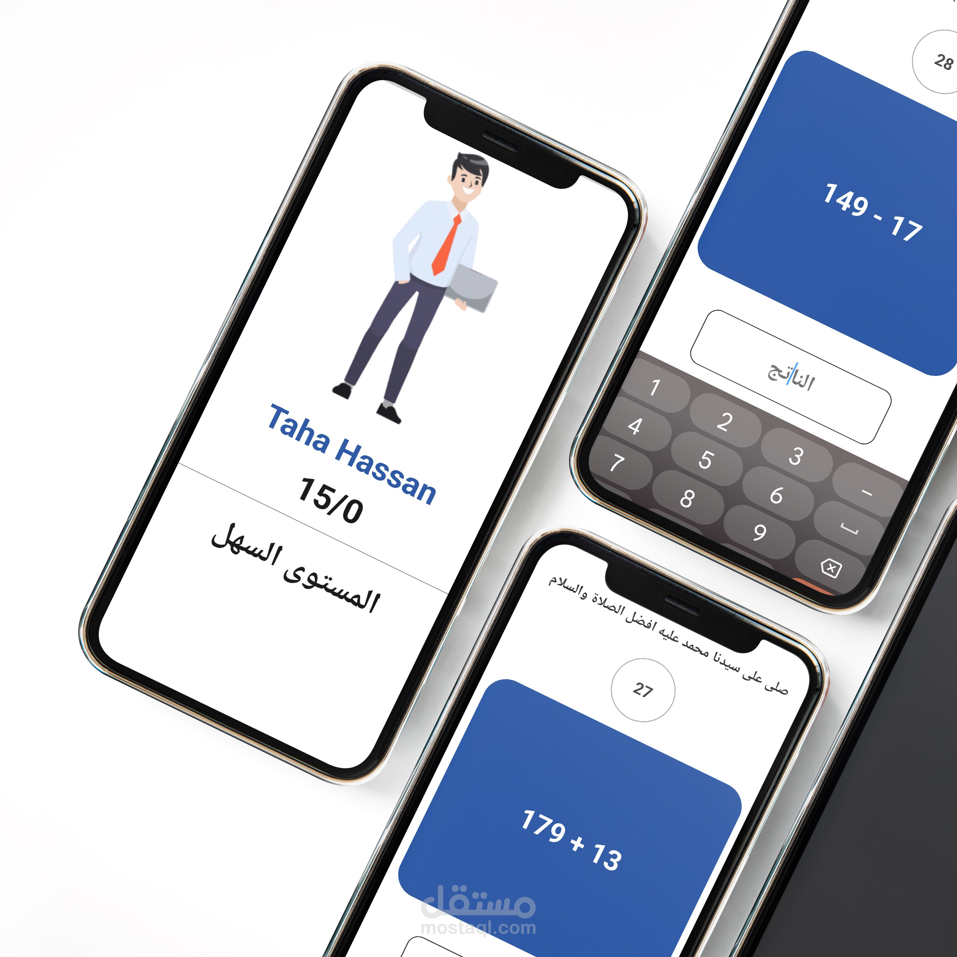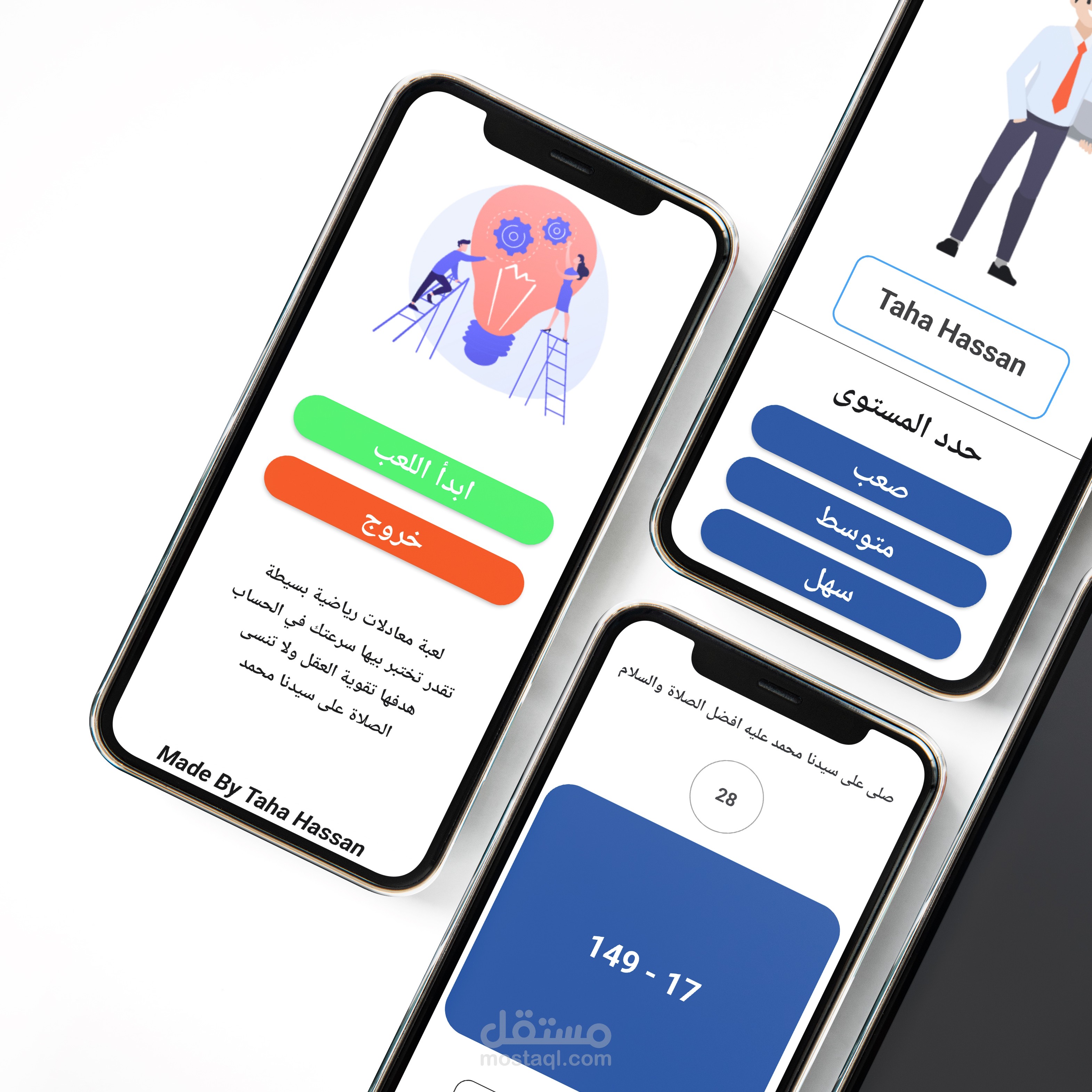 3- صفحة اللعب عبارة عن سبورة يتم عرض المسألة عليها ويوجد بها حقل ادخال الإجابة وعداد وقت حتى اذا المستخدم لم يجيب على السؤال يتم تحويله لسؤال آخر