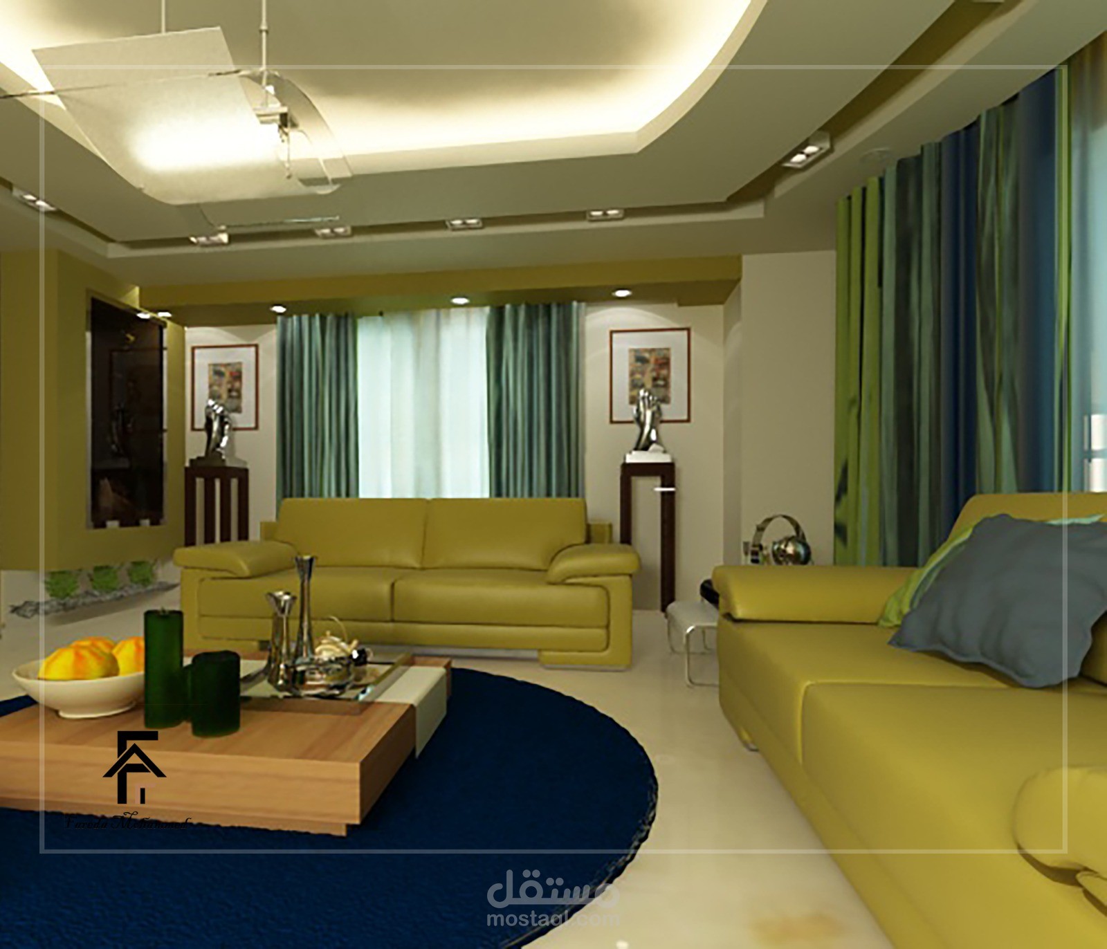 غرفه معيشه تمتاز بالجراءه في استخدام الالوان وبساطة التصميم، ضمن مشروع تصميم داخلى لفيلا