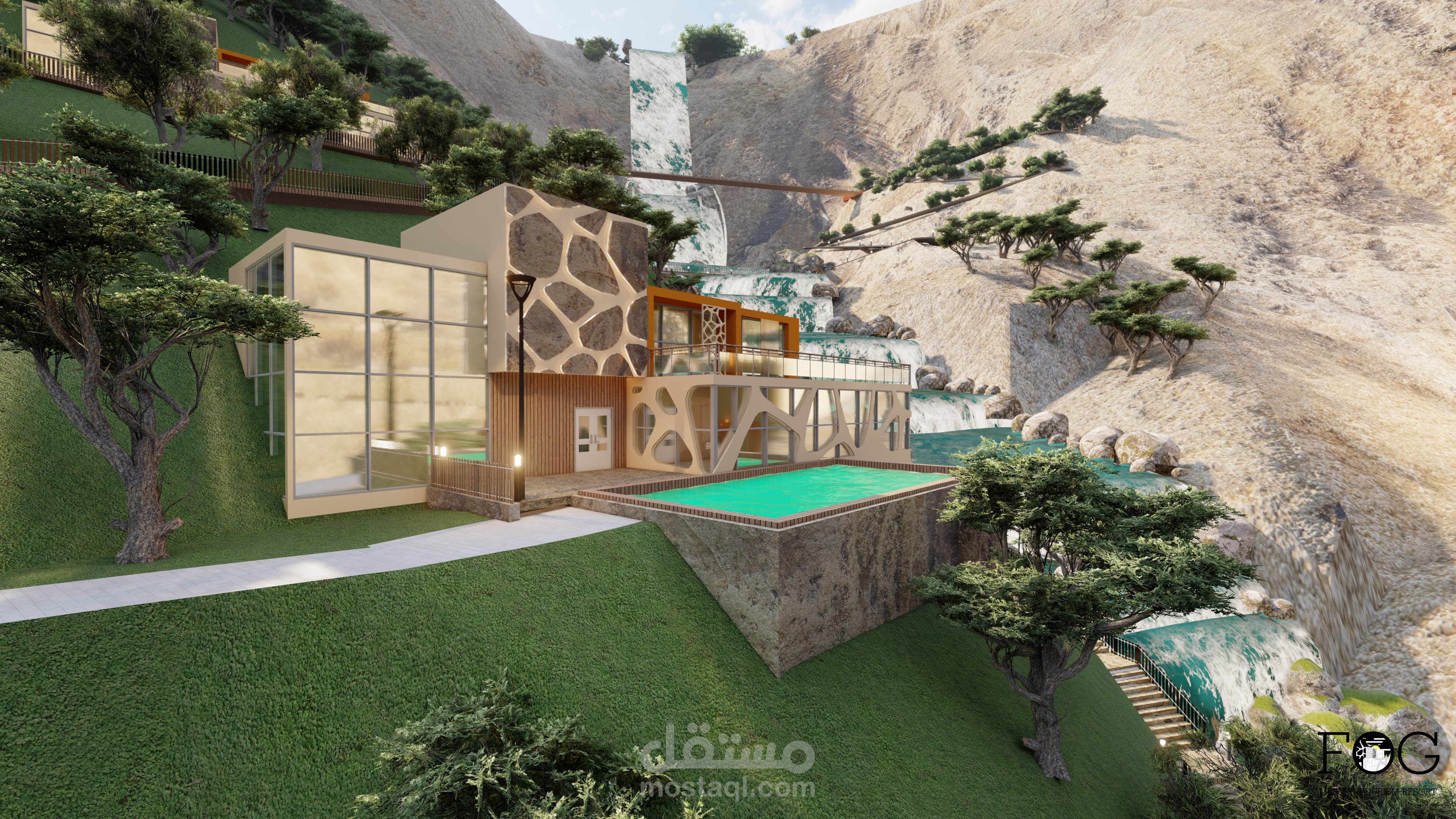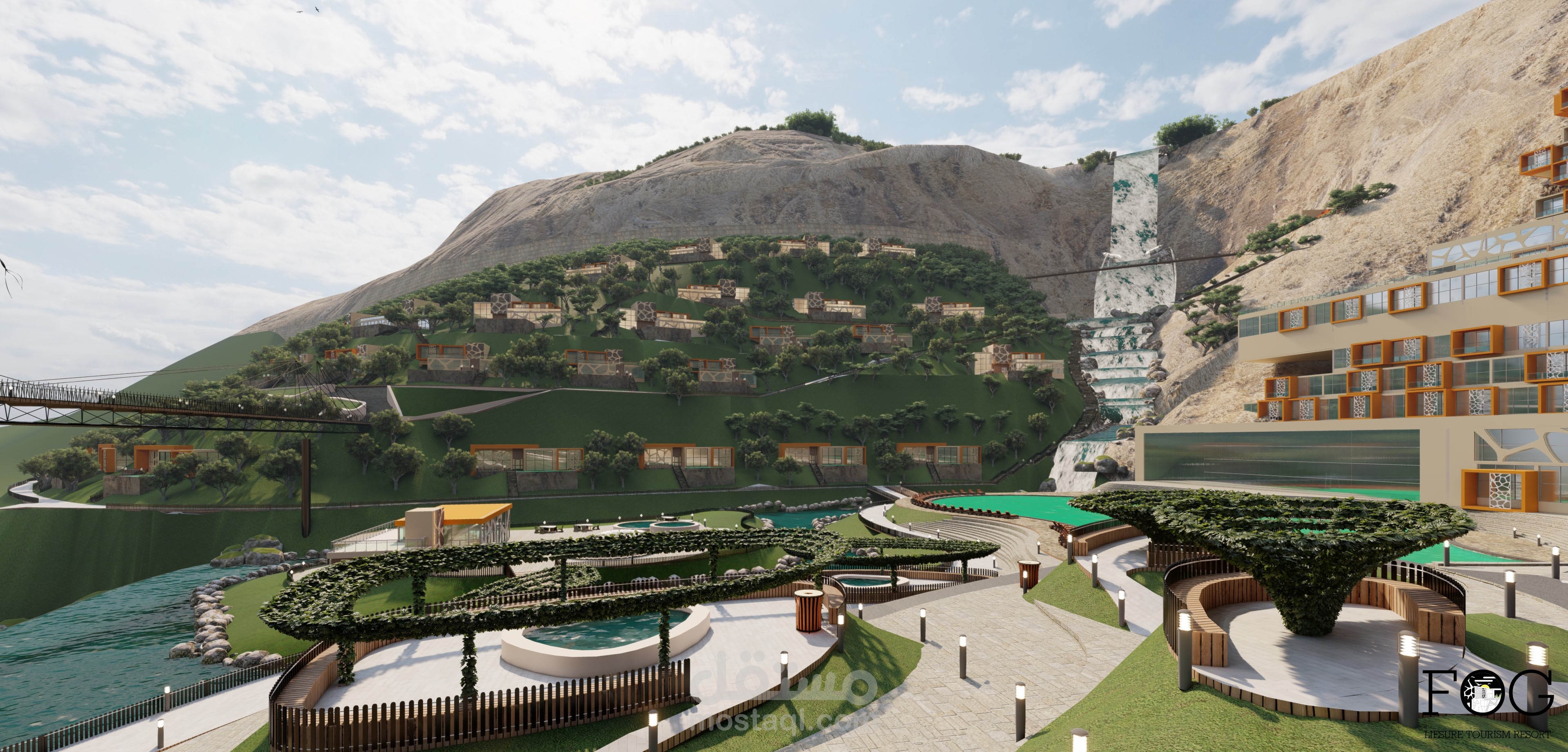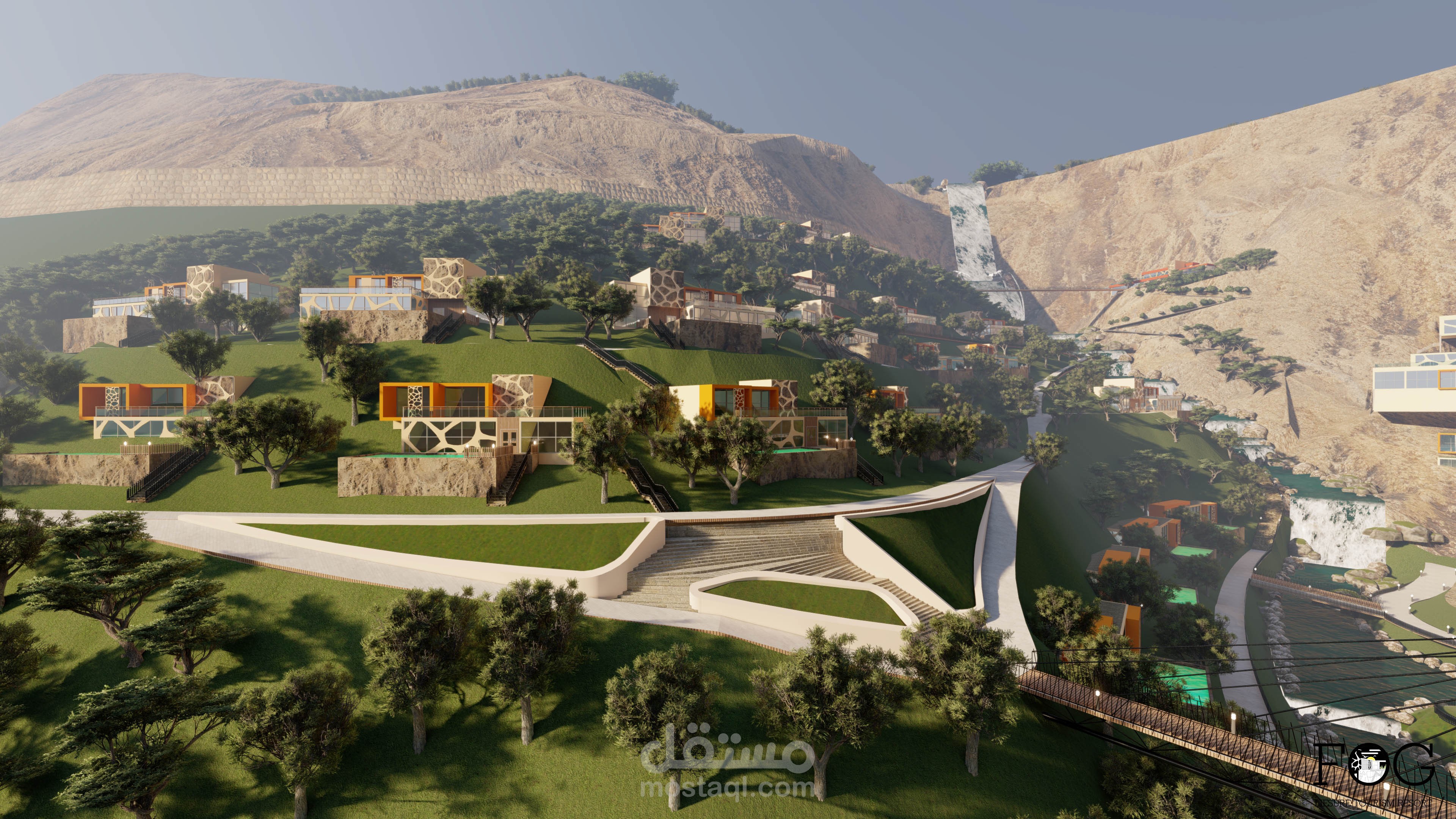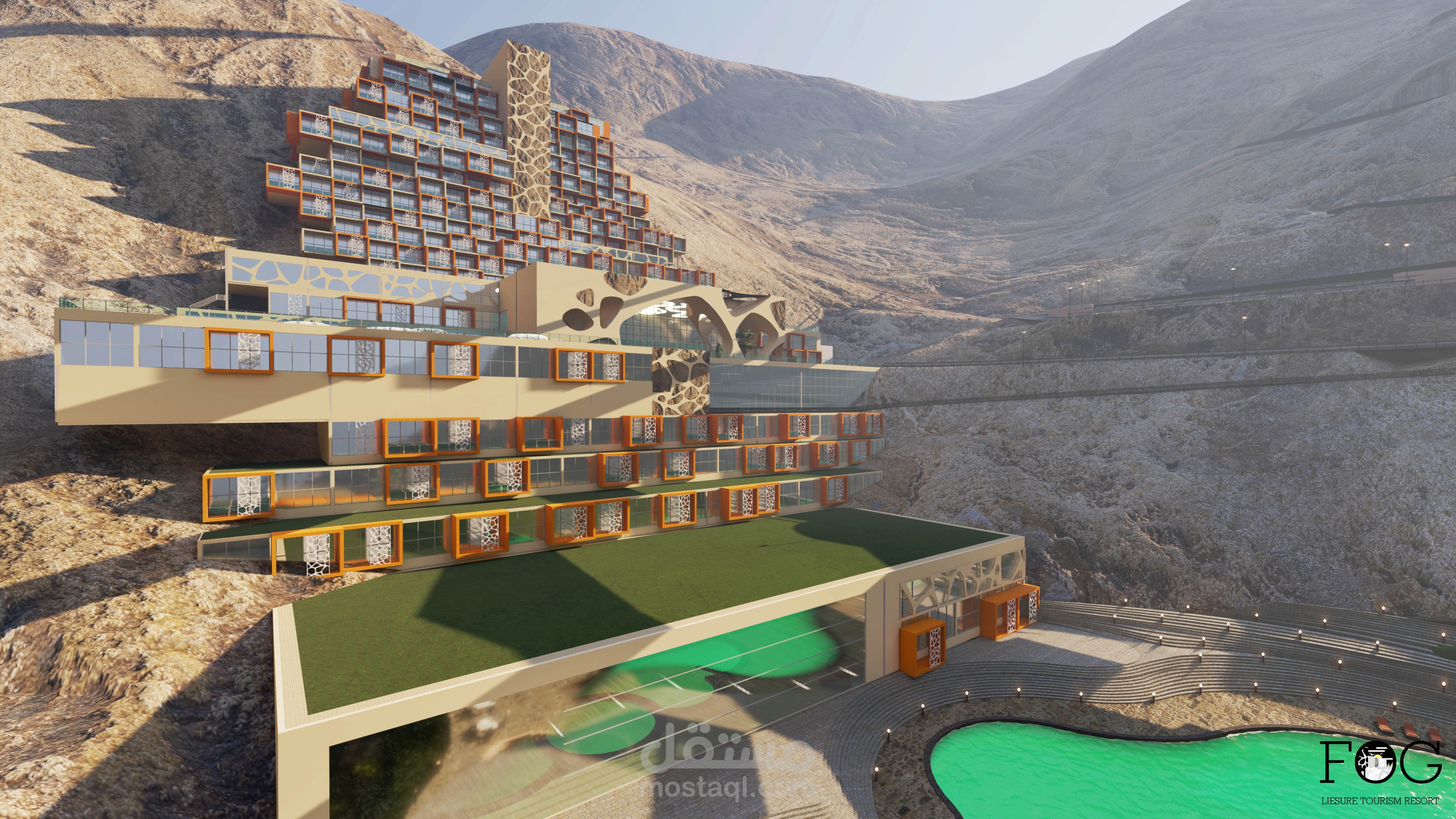 اما بالنسبة للمباني فقد تم استخدام تراكيب مكعبية متفككة و متدرجة على المنسوب و متماشي مع الانحدار لتبدو كجزء بارز من الجبال .