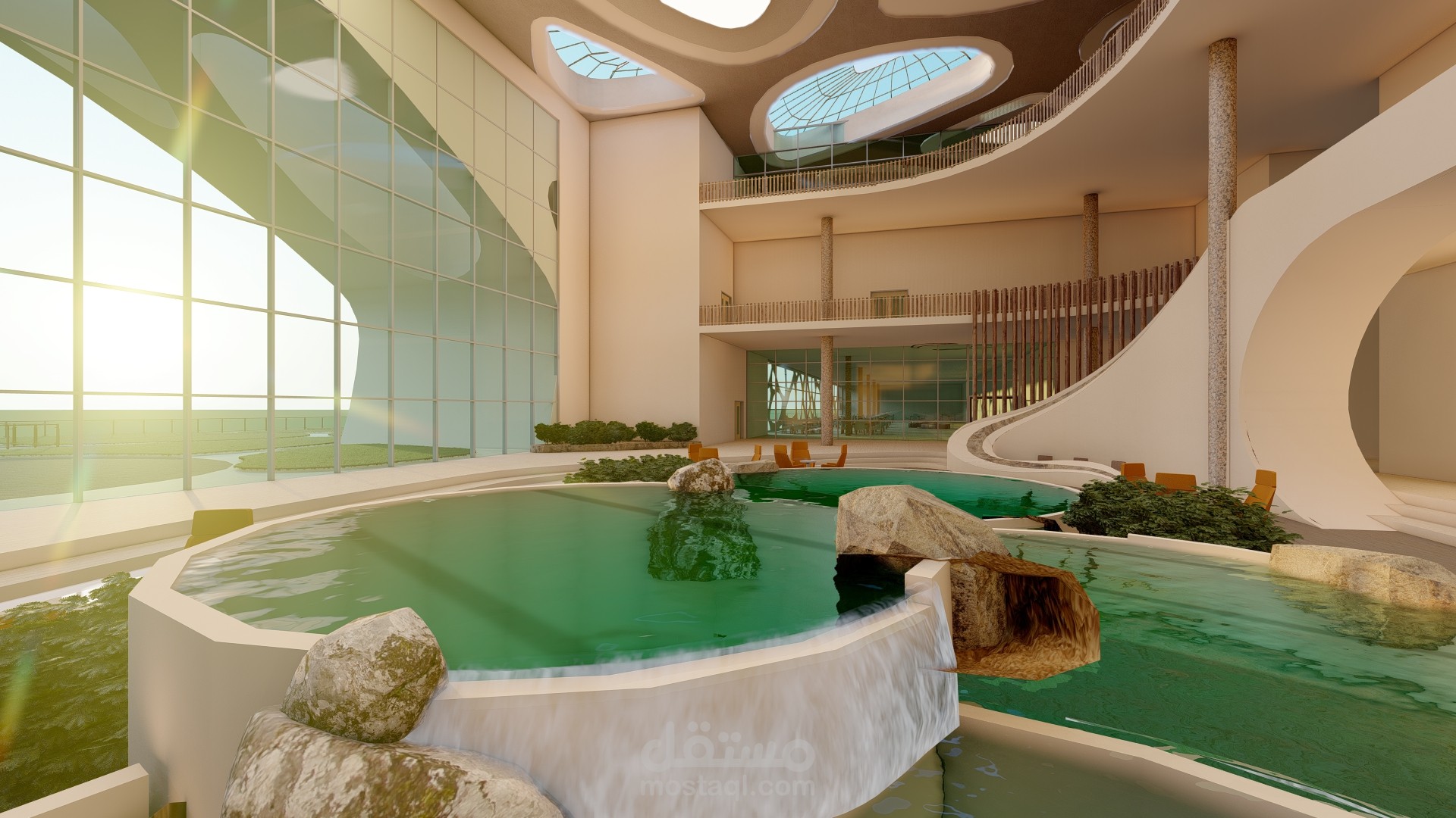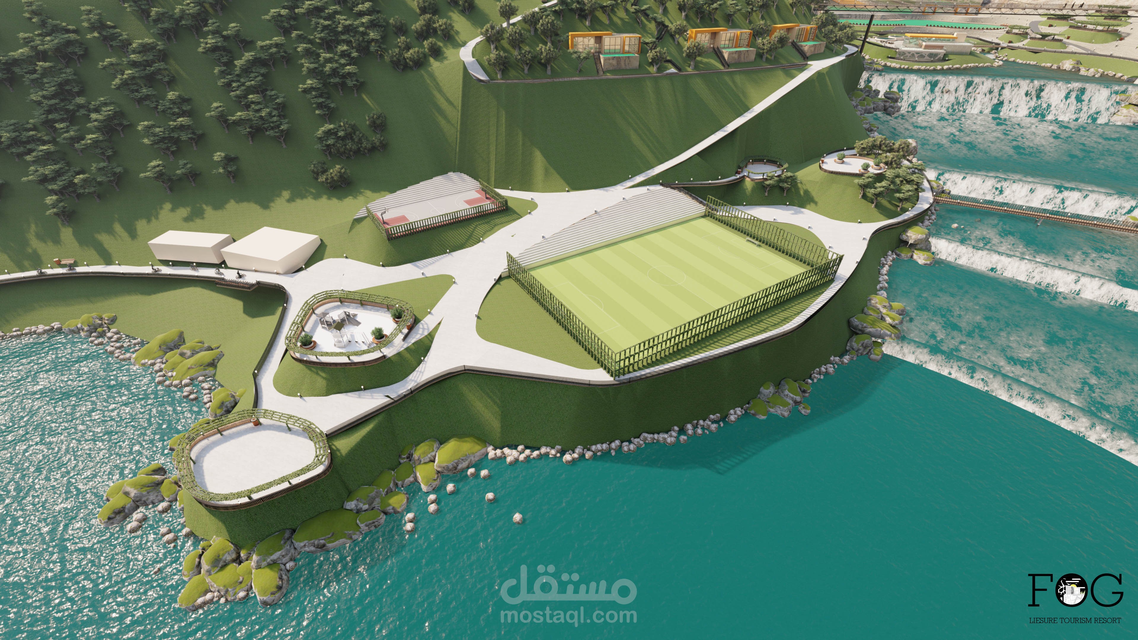 المنتجع مستوحى من الطبيعة و خصائصها العضوية وألوانها حيث تم استخدام اشكال الصخور لتنسيق الموقع و تصميم الجلسات والحدائق و على واجهات المباني .