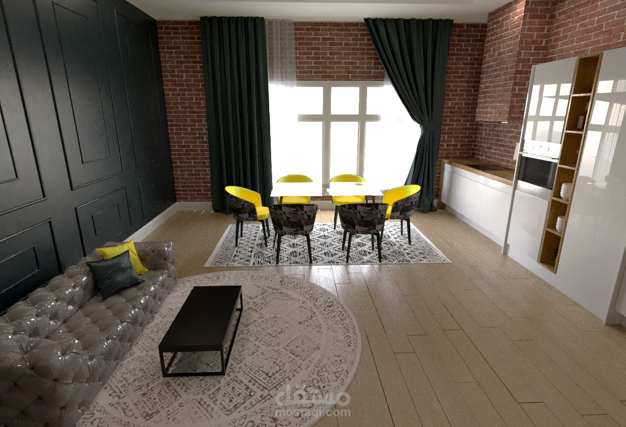تصميم داخلي لمطبخ وغرفة معيشة بطراز( industrial )