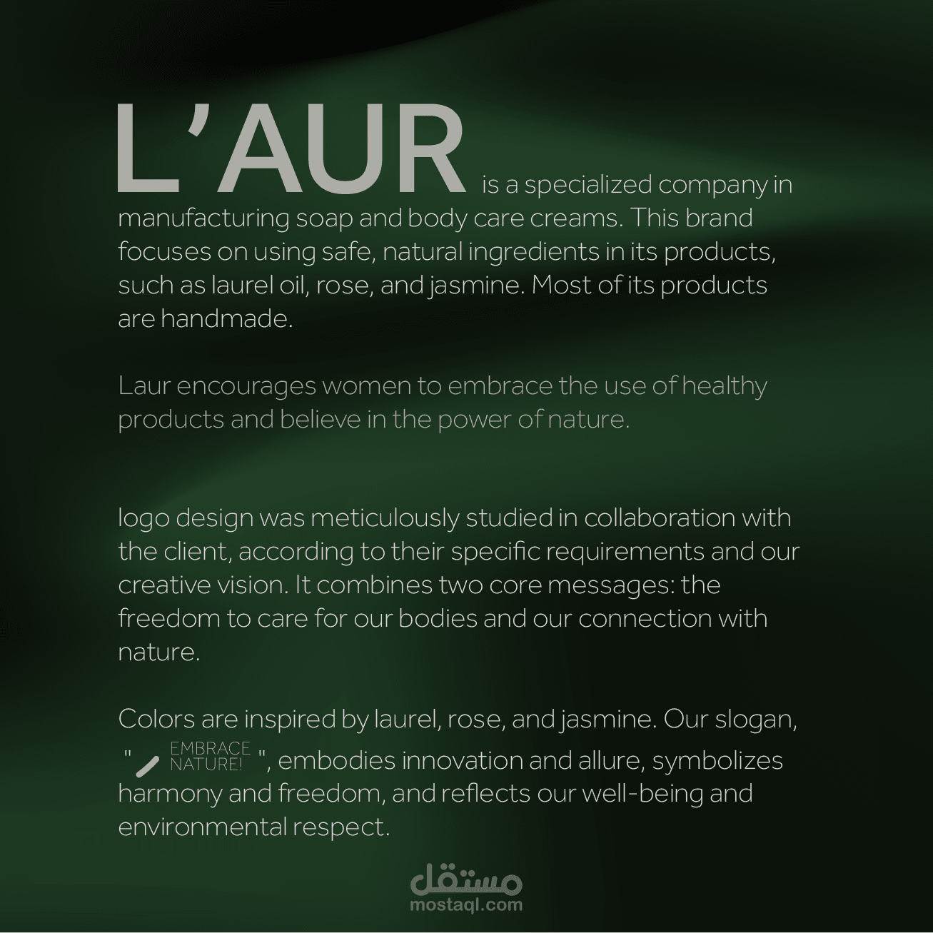 مكونات طبيعية وآمنة في منتجاتها ، مثل زيت الغار والورد والياسمين. معظم منتجاتهم مصنوعة يدويًا. تم دراسة تصميم الشعار بعناية بالتعاون مع العميل ، وفقًا لمتطلباته الخاصة ورؤيتنا الإبداعية. يجمع التصميم بين رسالتين أساسيتين: حرية العناية بأجسادنا وارتباطنا بالطبيعة. الألوان مستوحاة من الغار والورد والياسمين. شعارنا هو