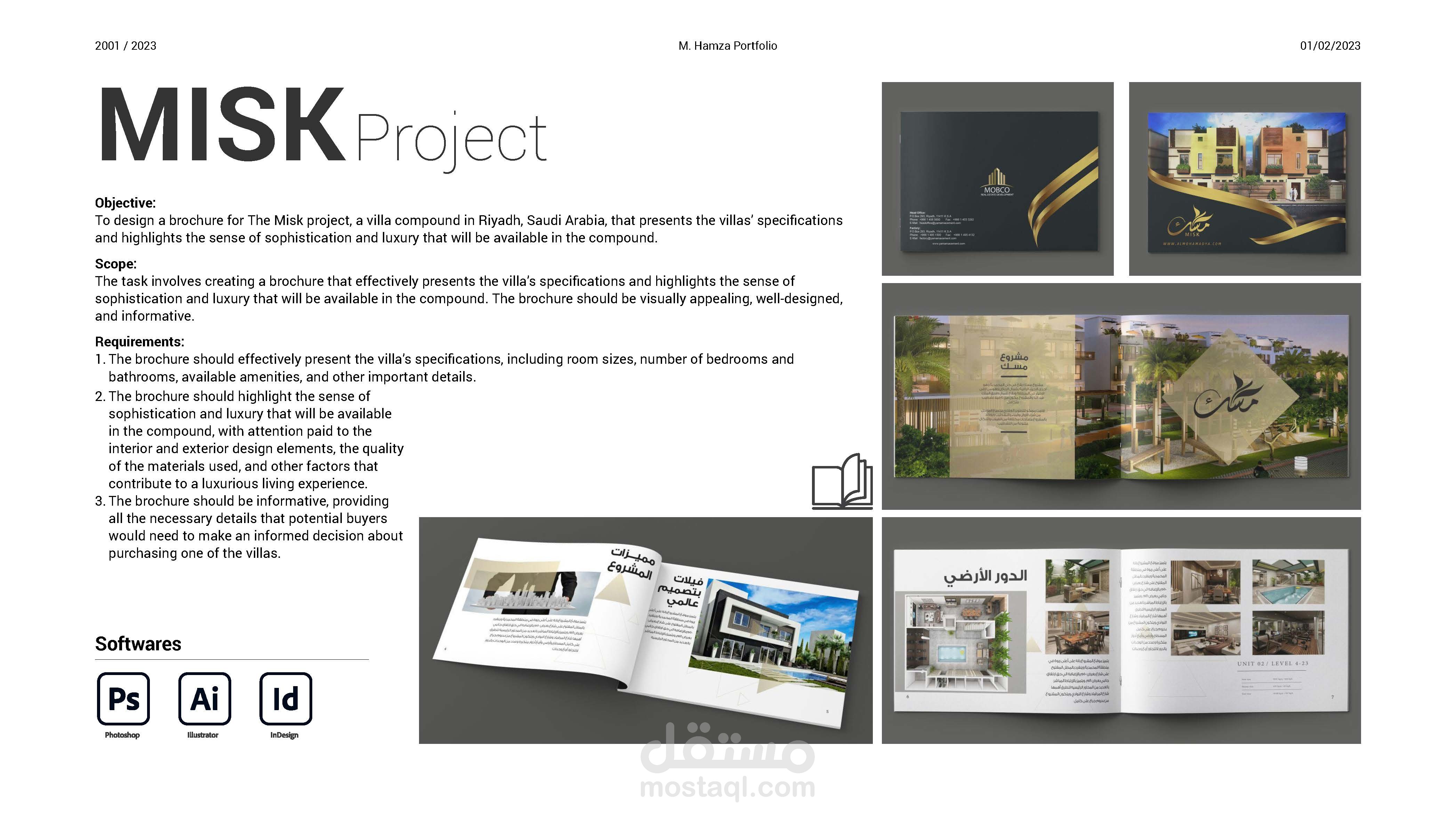 To design a brochure for The Misk project, a villa compound in Riyadh, Saudi Arabia, that presents the villas’ specifications and highlights the sense of sophistication and luxury that will be available in the compound.