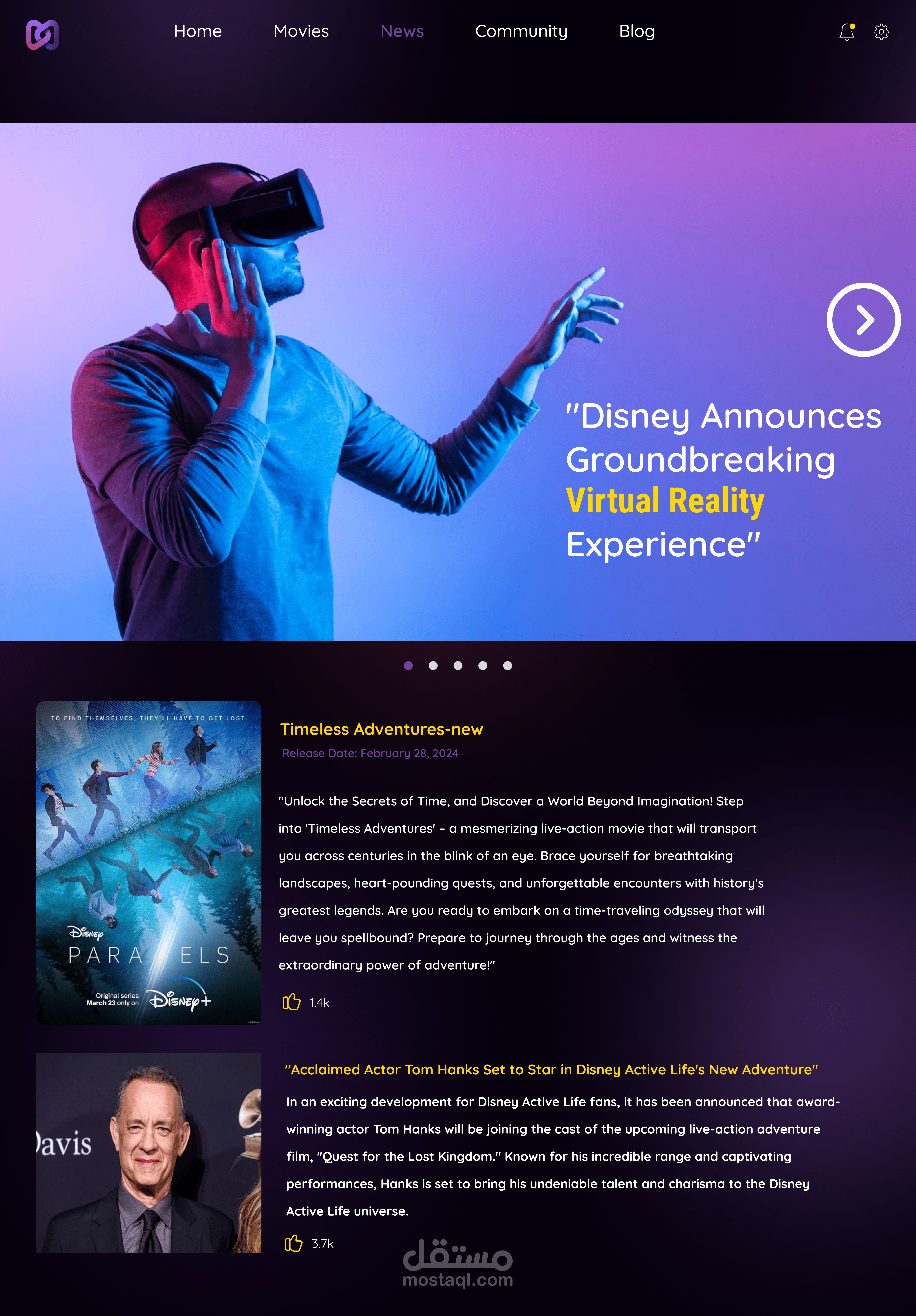 التصميم وواجهة المستخدم: تصميم واجهة مرئية جذابة للموقع، مع الأخذ في الاعتبار ثيمة Disney Active Life واستخدام عناصر الخيال والسحر. يشمل ذلك تصميم الصفحة الرئيسية، صفحات عرض الأفلام، صفحات الأفلام الفردية، صفحات المدونة، وصفحات المجتمع. ويتم التأكد من توفير واجهة مستخدم متسقة وسهلة التنقل تسهل تجربة تصفح ممتعة.