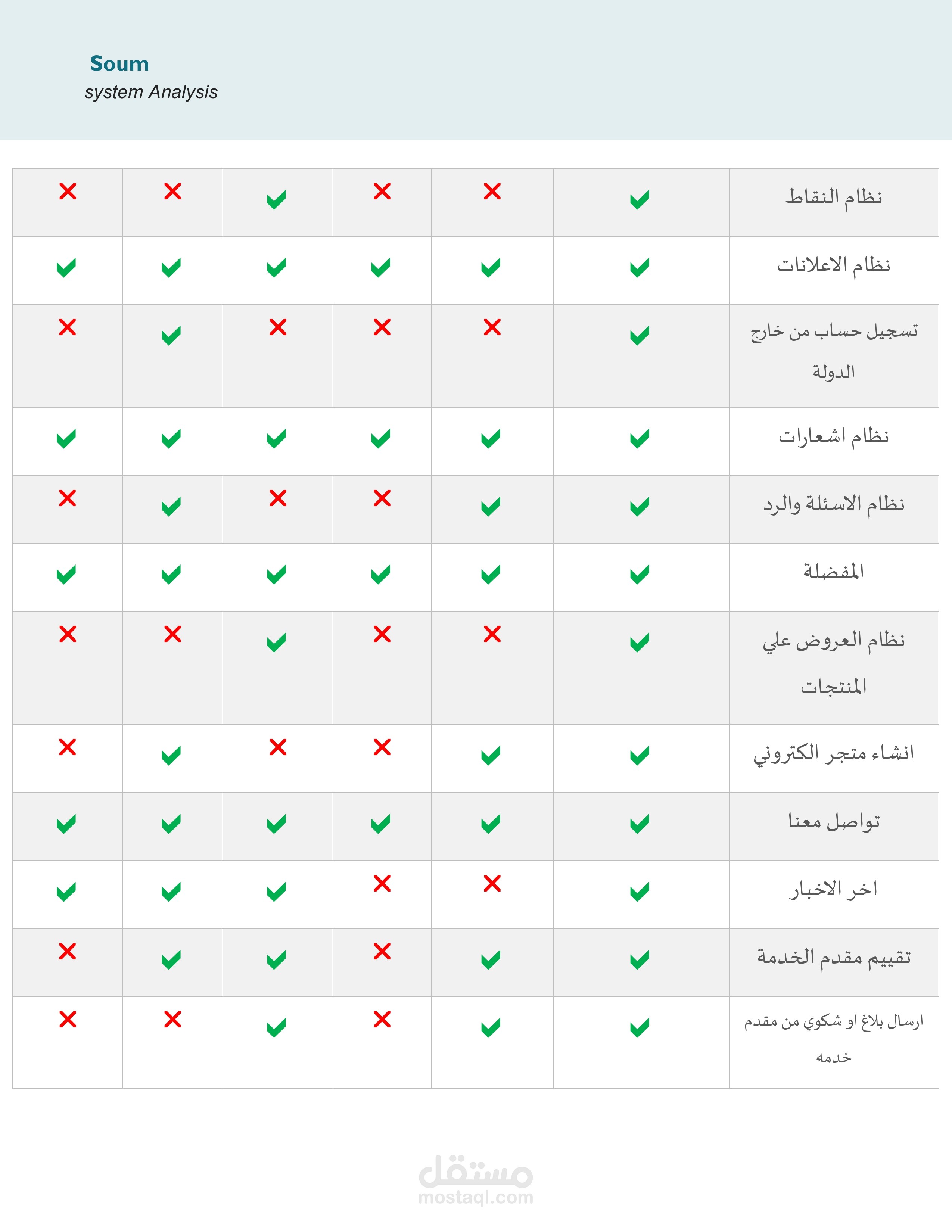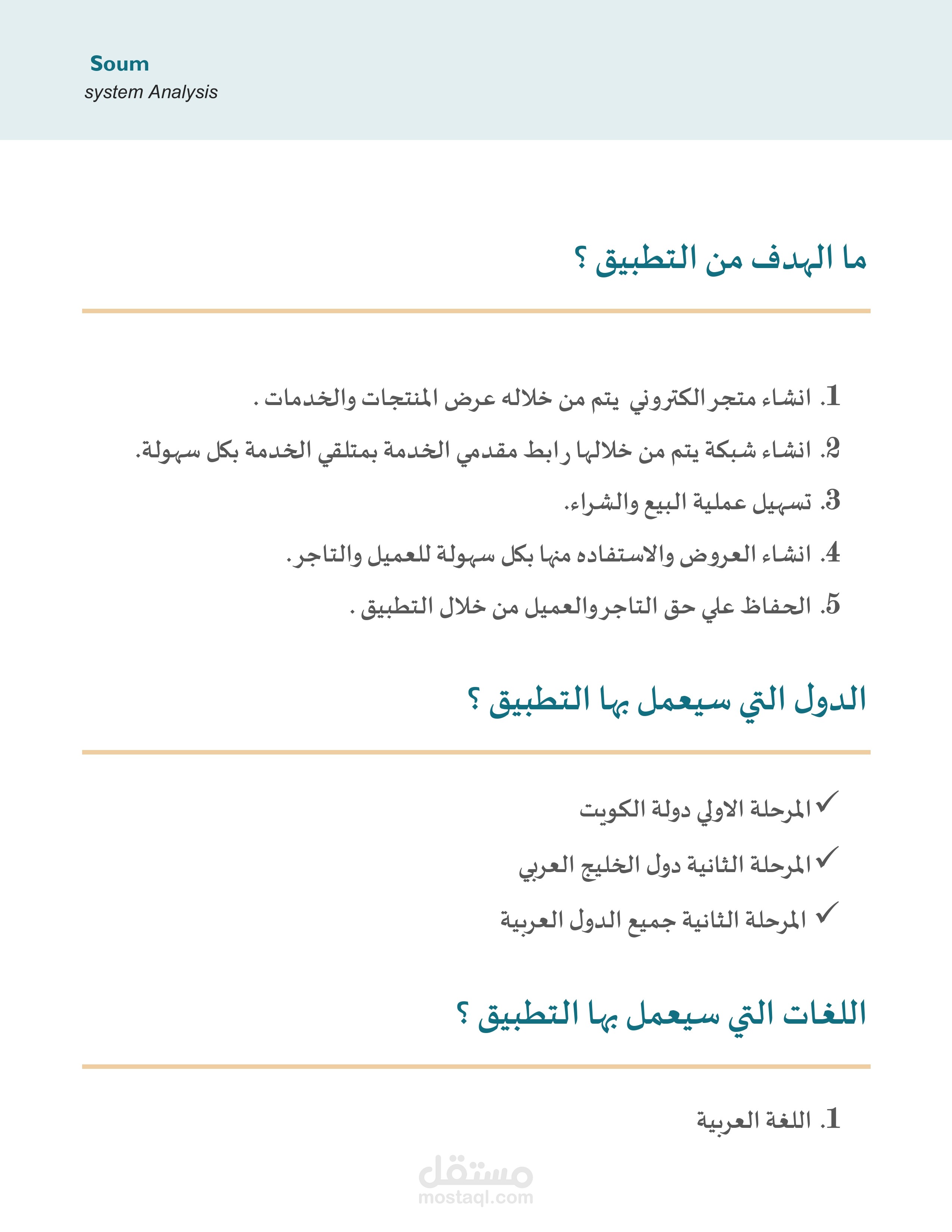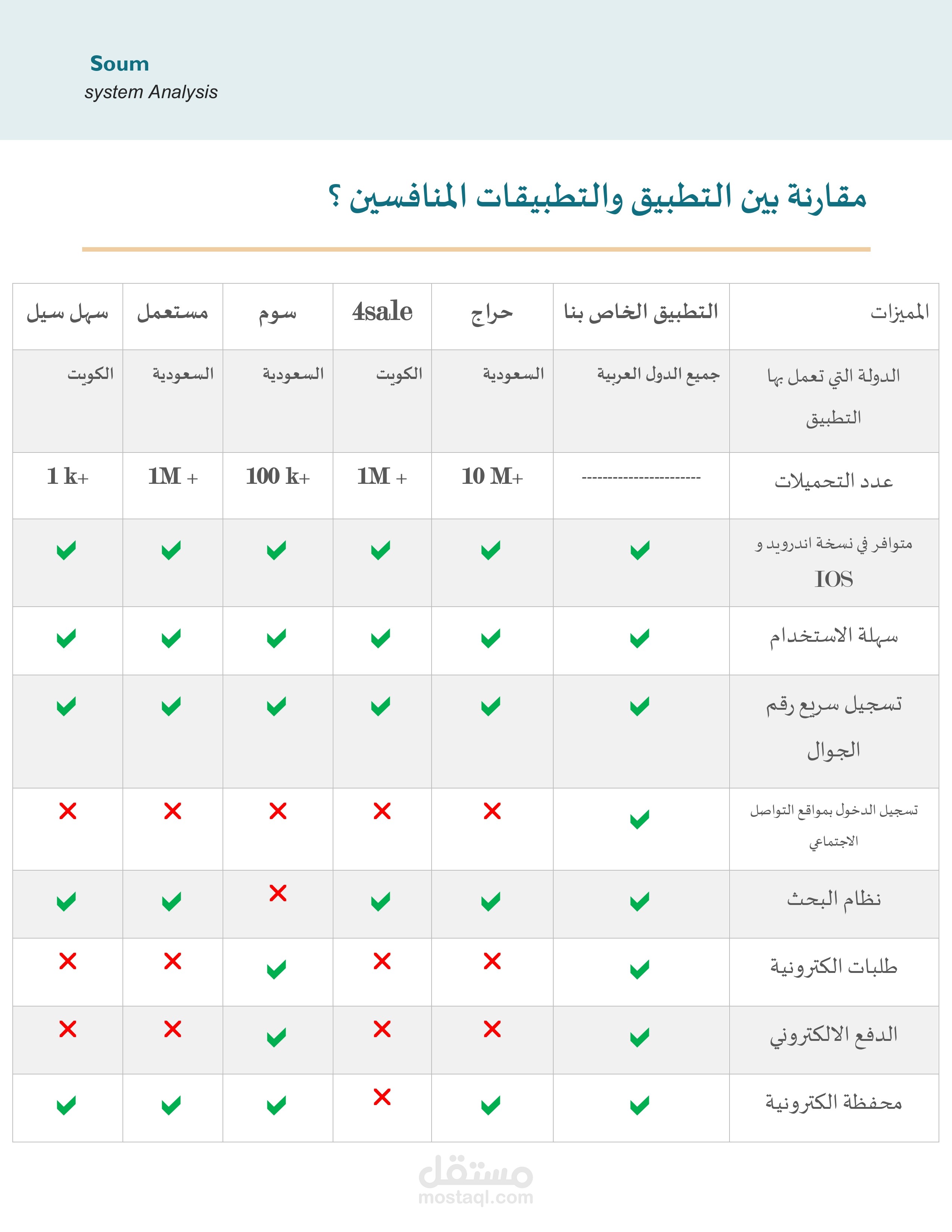 من ضمن ما اقدمه للعميل انني اقوم بعمل تحليل كامل وشامل في بدايه العمل الهدف منه هو توضيح كافه النقاط المطلوبة ومساعده العميل على معرفه جودة فكرته وقابلية تنفيذها من عدمه مع تحليل كامل للسوق والمنافسين الاخرين مرفق مثال بسيط من تحليل احدى المشاريع للتجارة الالكترونية مثل حراج