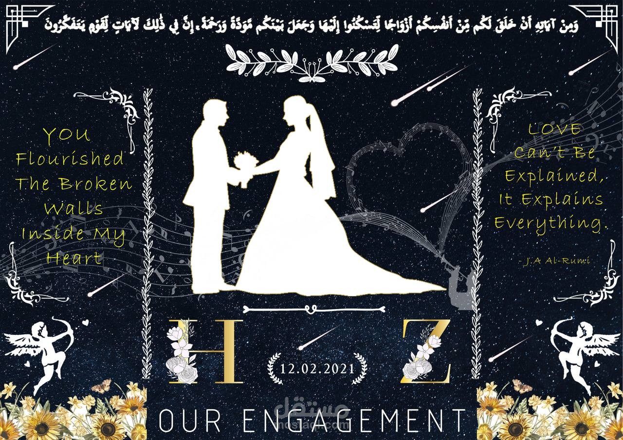 Theme and color scheme: Choose a theme and color scheme that reflects the couple's style and personality. Consider using colors that are traditionally associated with weddings, such as white, gold, or pastels. Make sure the colors chosen work well in both English and Arabic.