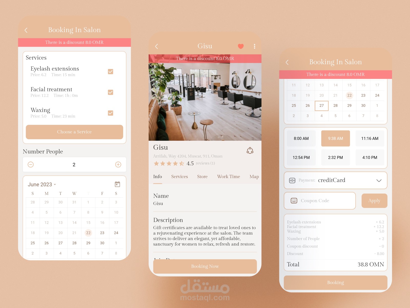 - حجز بالوقت والتاريخ مع اختيار عدد الاشخاص والخدمات المراد حجزها