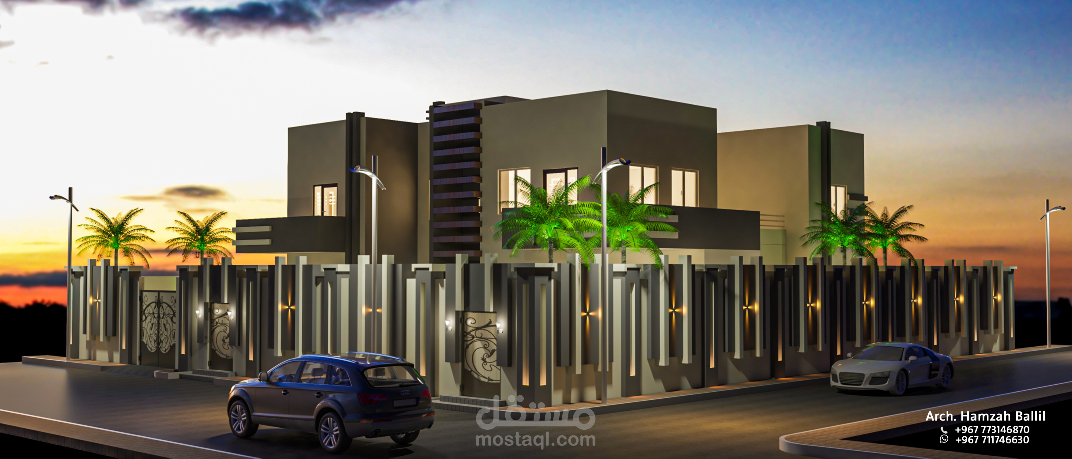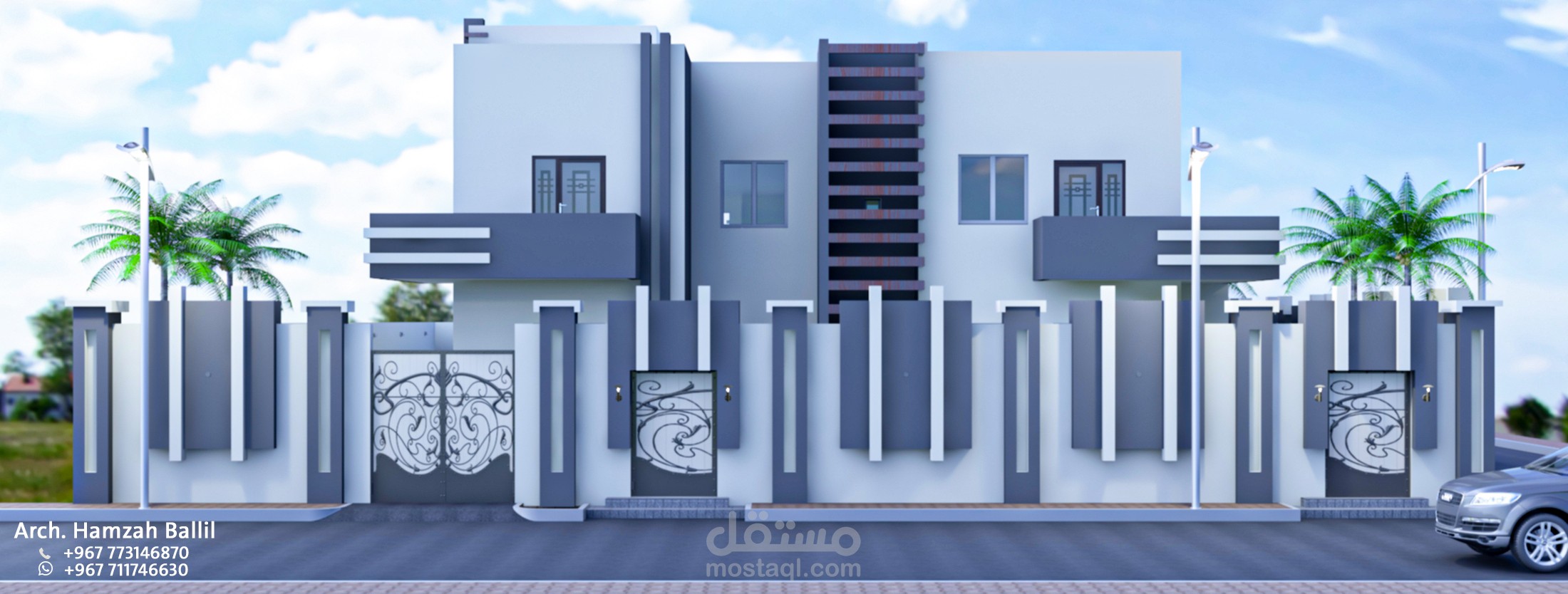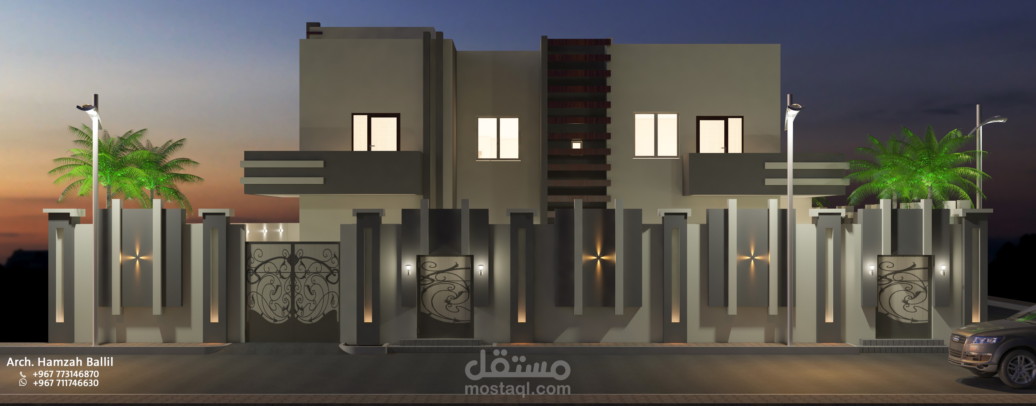 الدور الأرضي يتكون من غرفتي استقبال منفصلتين كل واحدة منهما بحمام ومدخل خاص وغرفة معيشة وغرفة طعام ومطبخ.