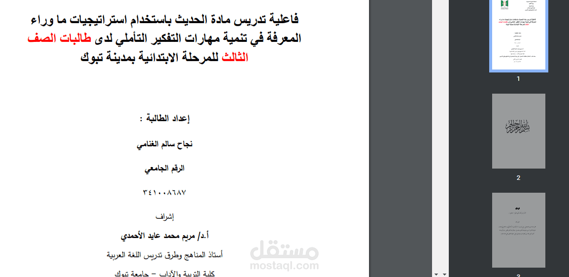 نموذج من تدقيق لغوي لرسالة ماجستر بعنوان (فاعلية تدريس مادة الحديث باستخدام استراتيجيات ما وراء