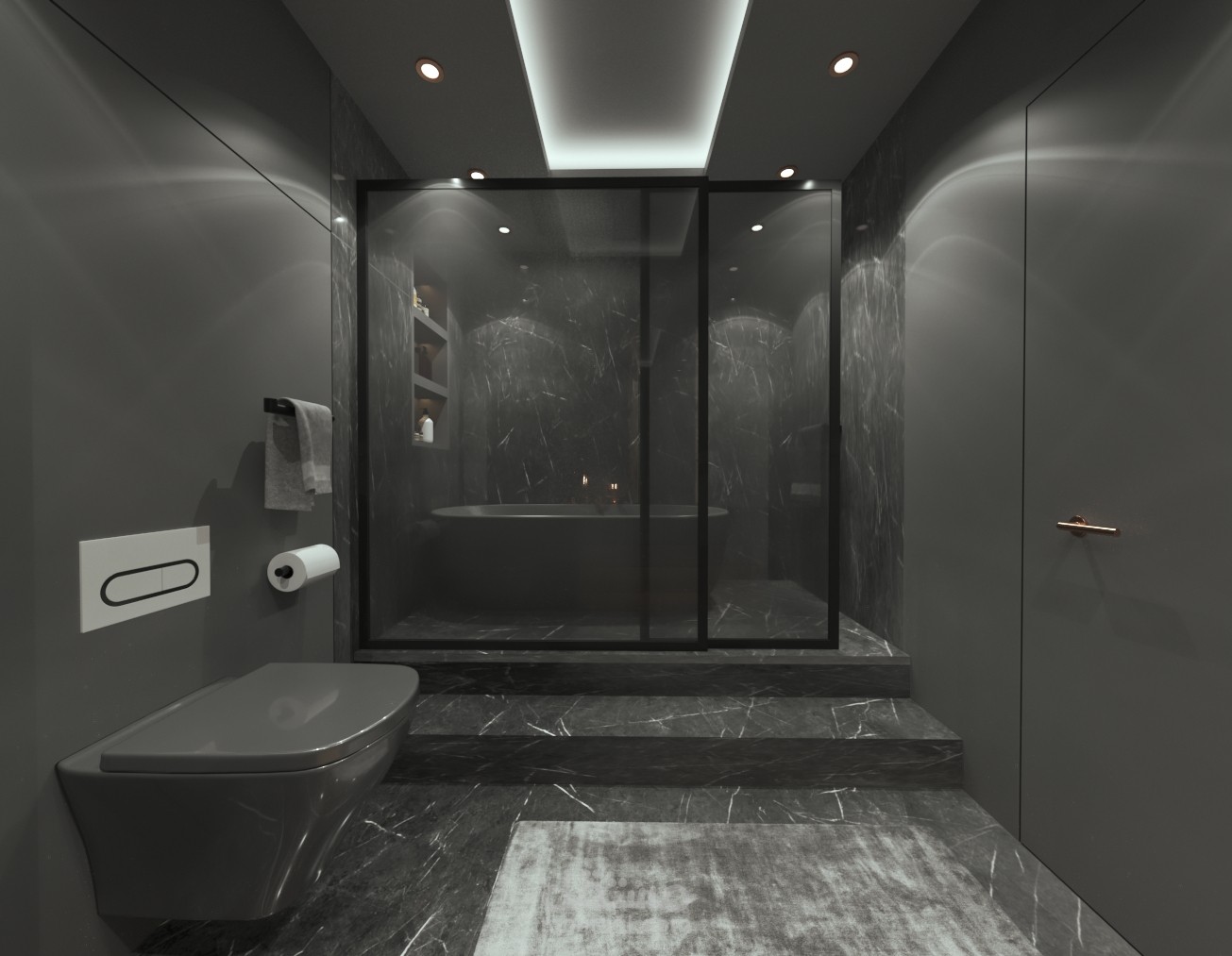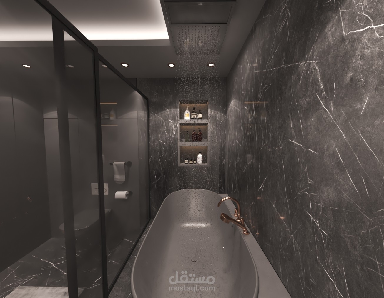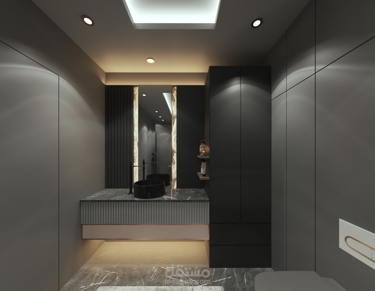 حمام من الطراز الحديث بالوان قاتمة مريحة للاعصاب و مميزة ببساطة التصميم