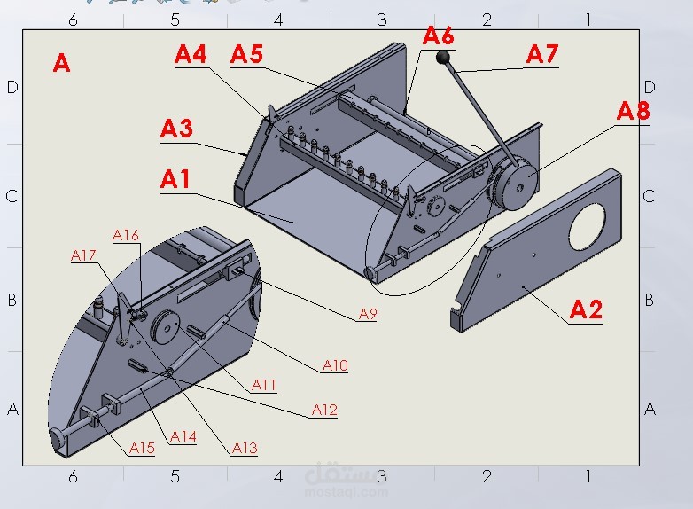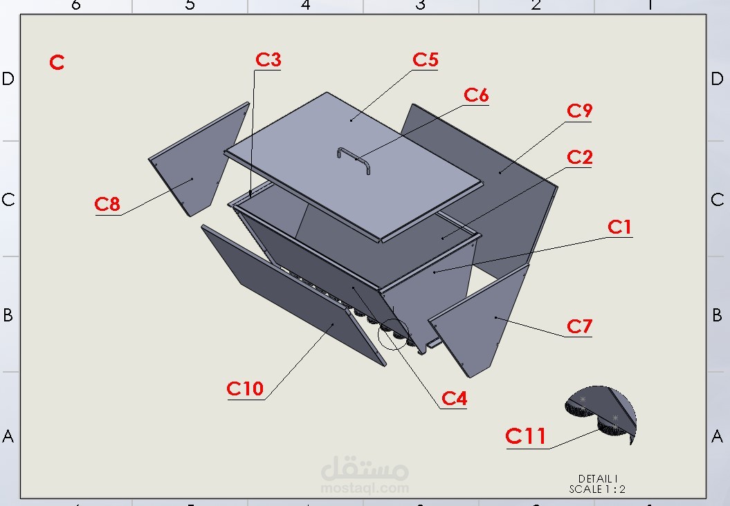 وبعد التأكد من أن التصميم صحيح ومناسب، يتم إنشاء رسومات فنية وتقنية مفصلة للجهاز باستخدام برنامج السوليدووركس، والتي يمكن استخدامها في عملية التصنيع والتجميع والصيانة.