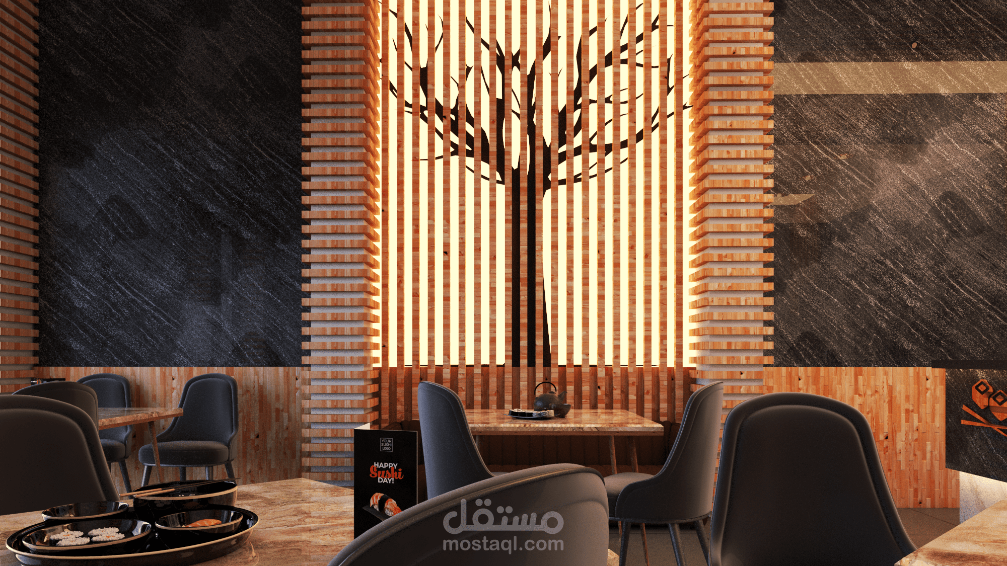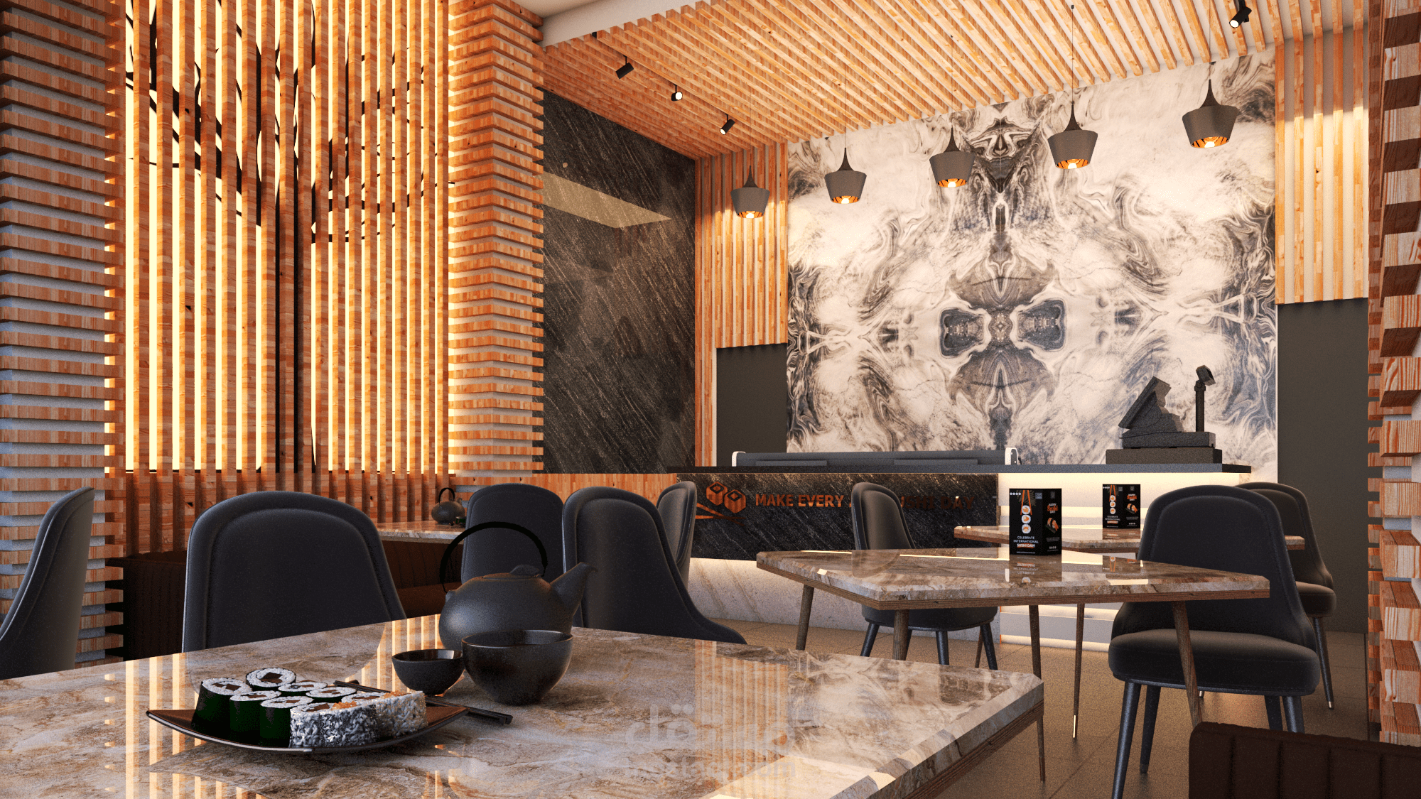 الهدف من العمل كان تصميم مطعم سوشي جذاب مع مطبخ وبار كافيه مع تصميم الاثاث المريح واظهار المشروع بطريقة جذاب و ملفتة ومع عمل لوجو ديزاين للمكان مع عبارة ملفتة