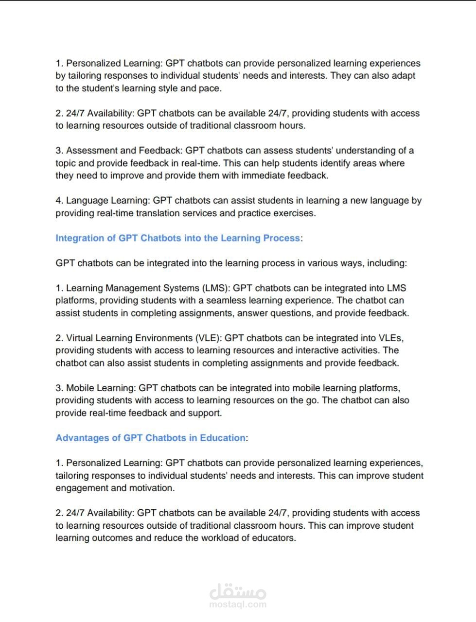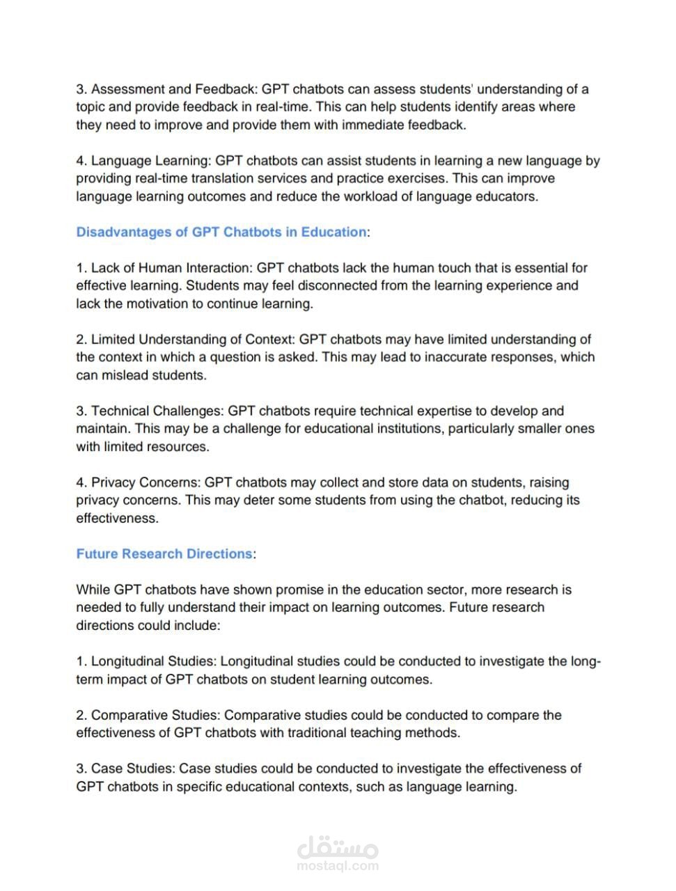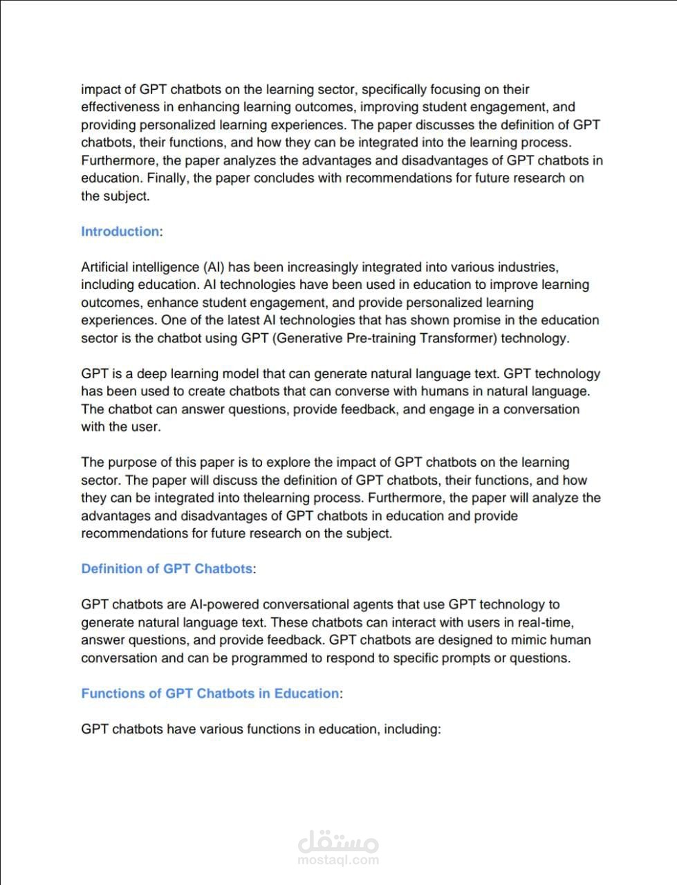 البحث مكون من عدة صفحات سأضع بعضاً منها في الصور كأمثلة، اشتمل البحث على ميزات وسلبيات chat gpt ودوره وأثره على التعليم وعلى واقعنا الحالي .