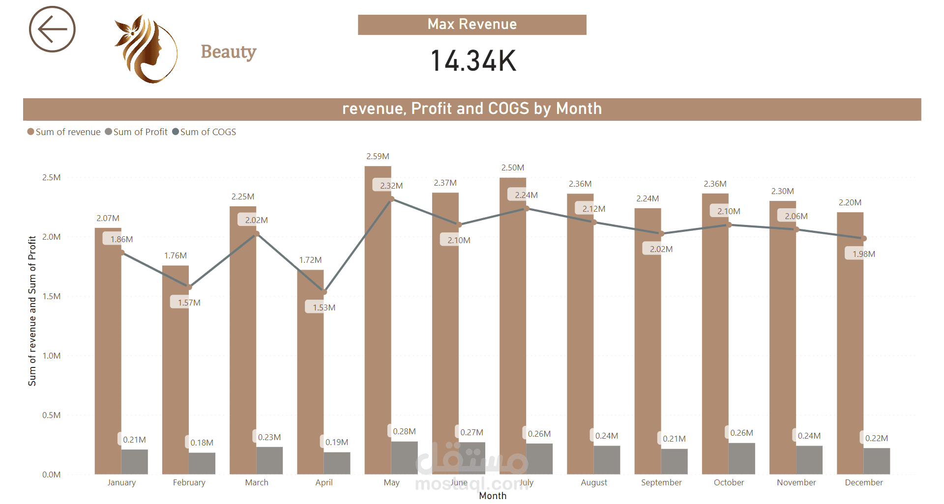 ما هي اتجاهات الإيرادات والأرباح والكمية المباعة شهريًا؟