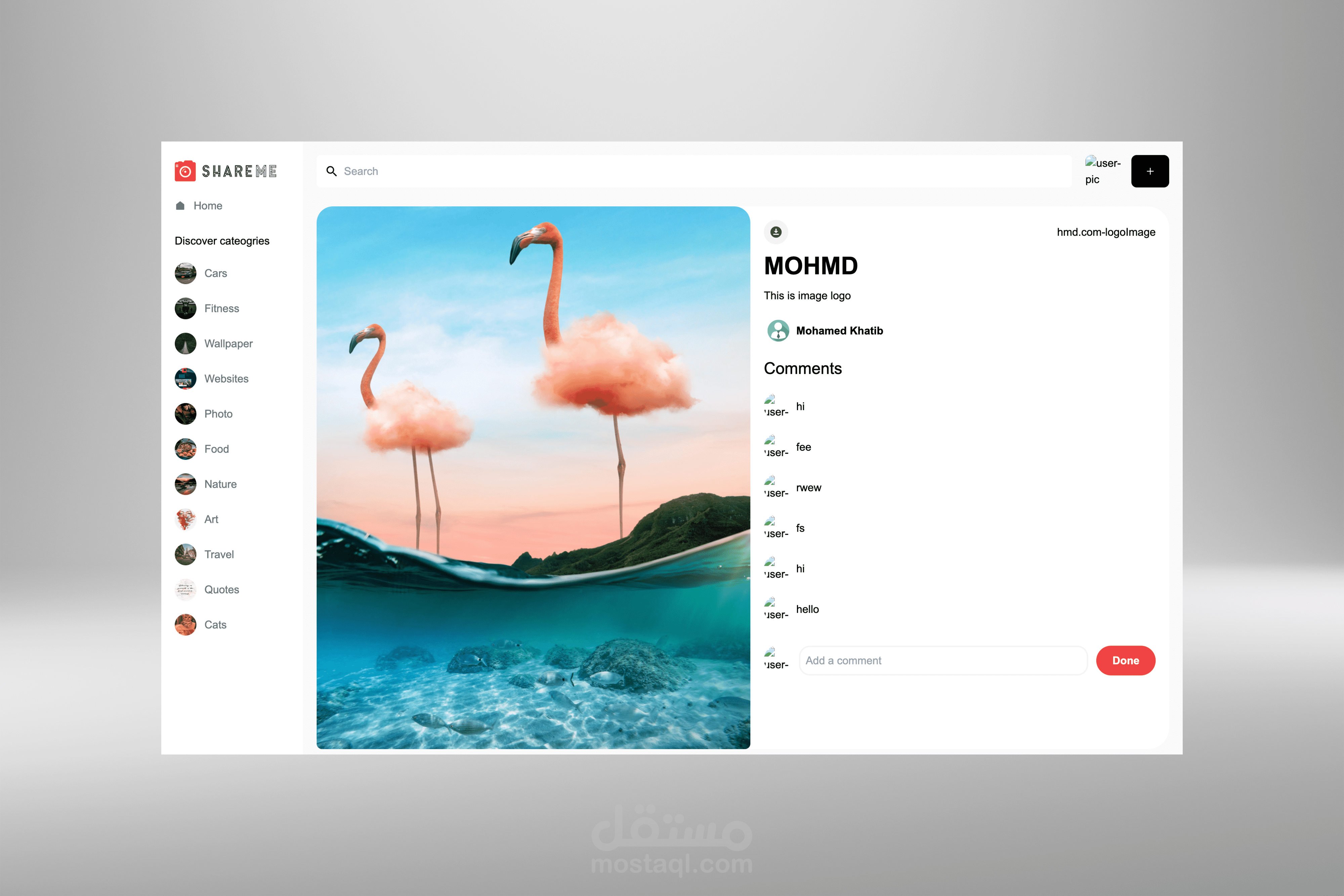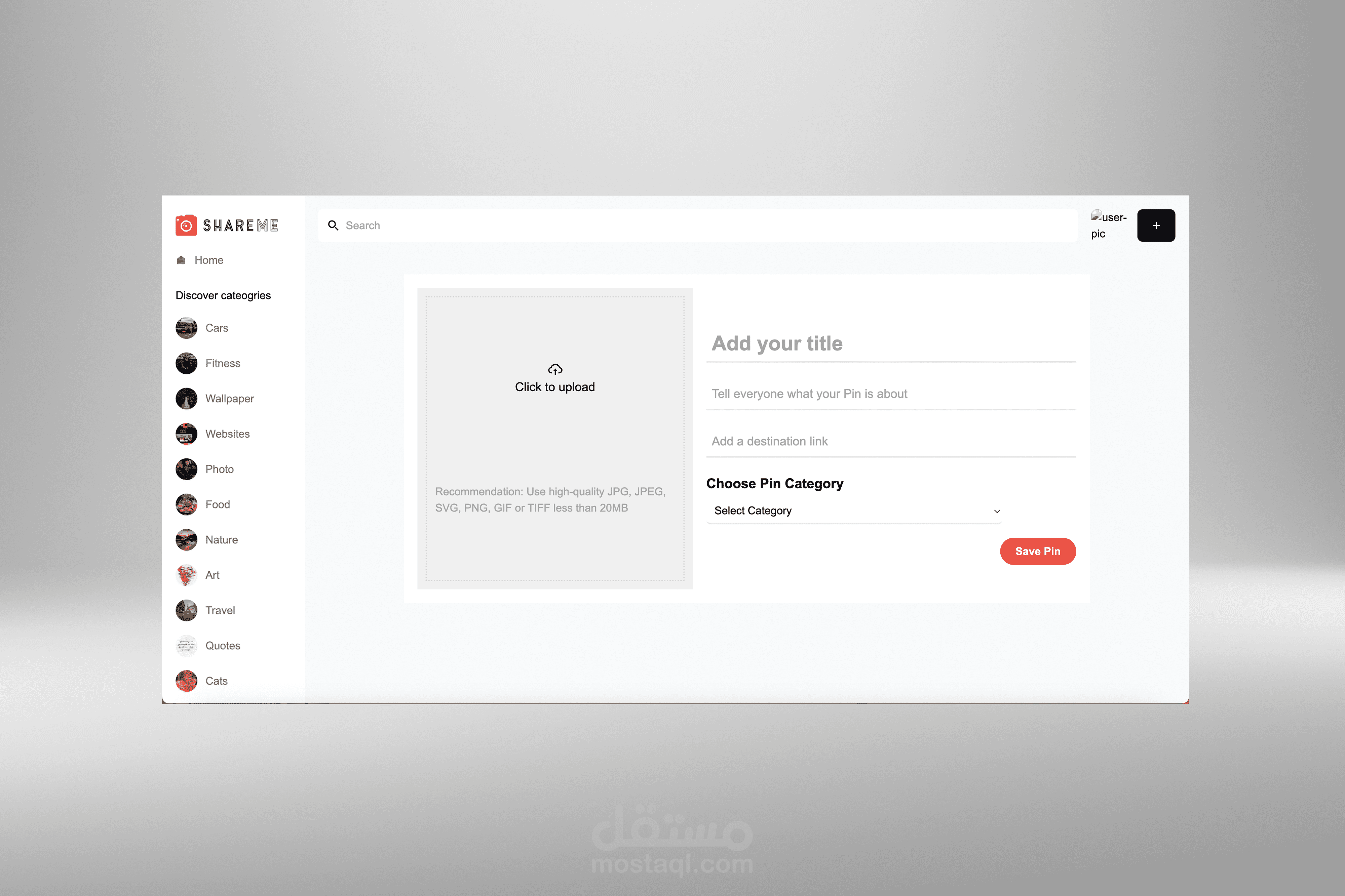 ▸ Shareme is a visually appealing social networking site where users can upload images, choose pin categories, and interact through comments.