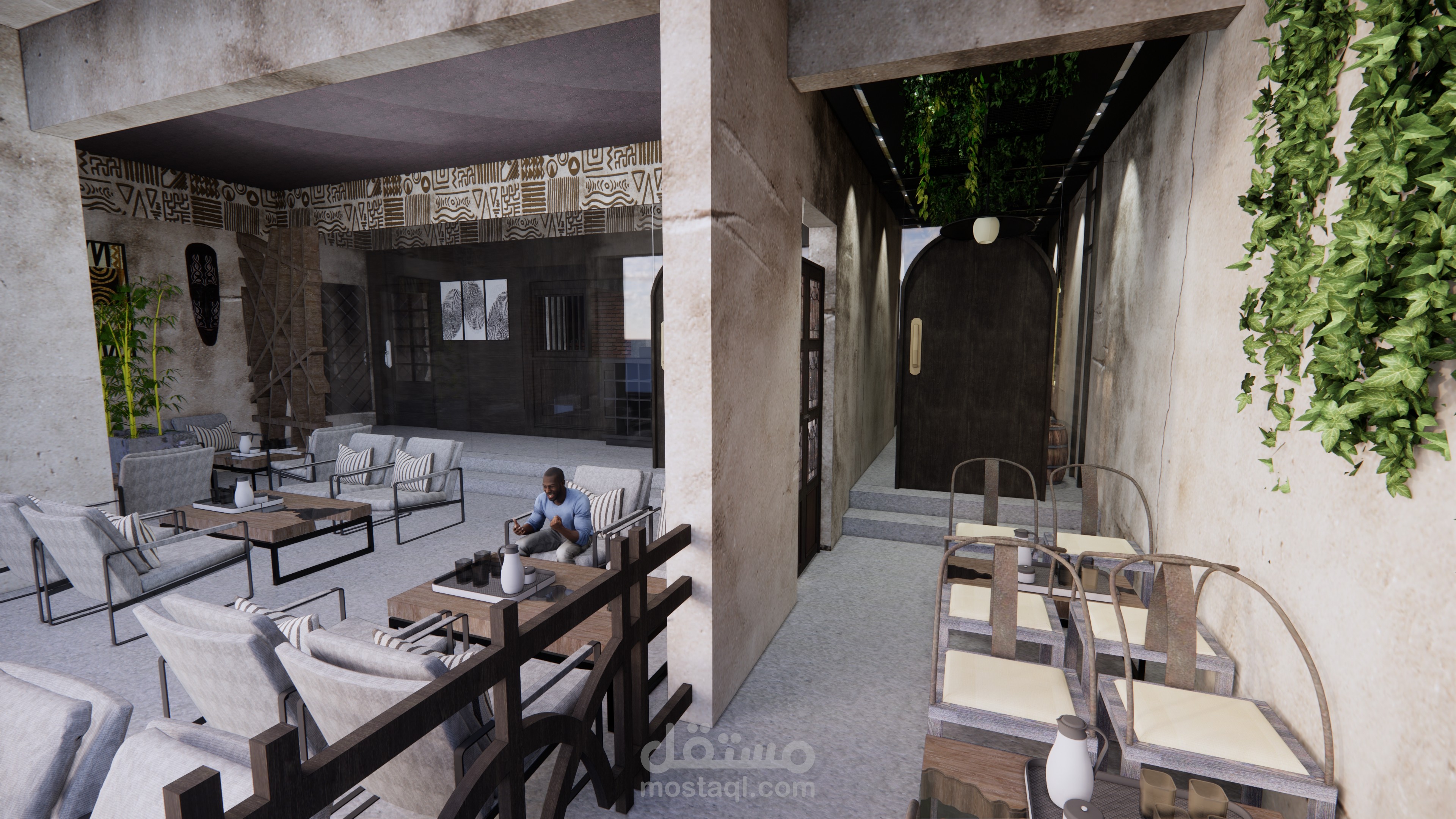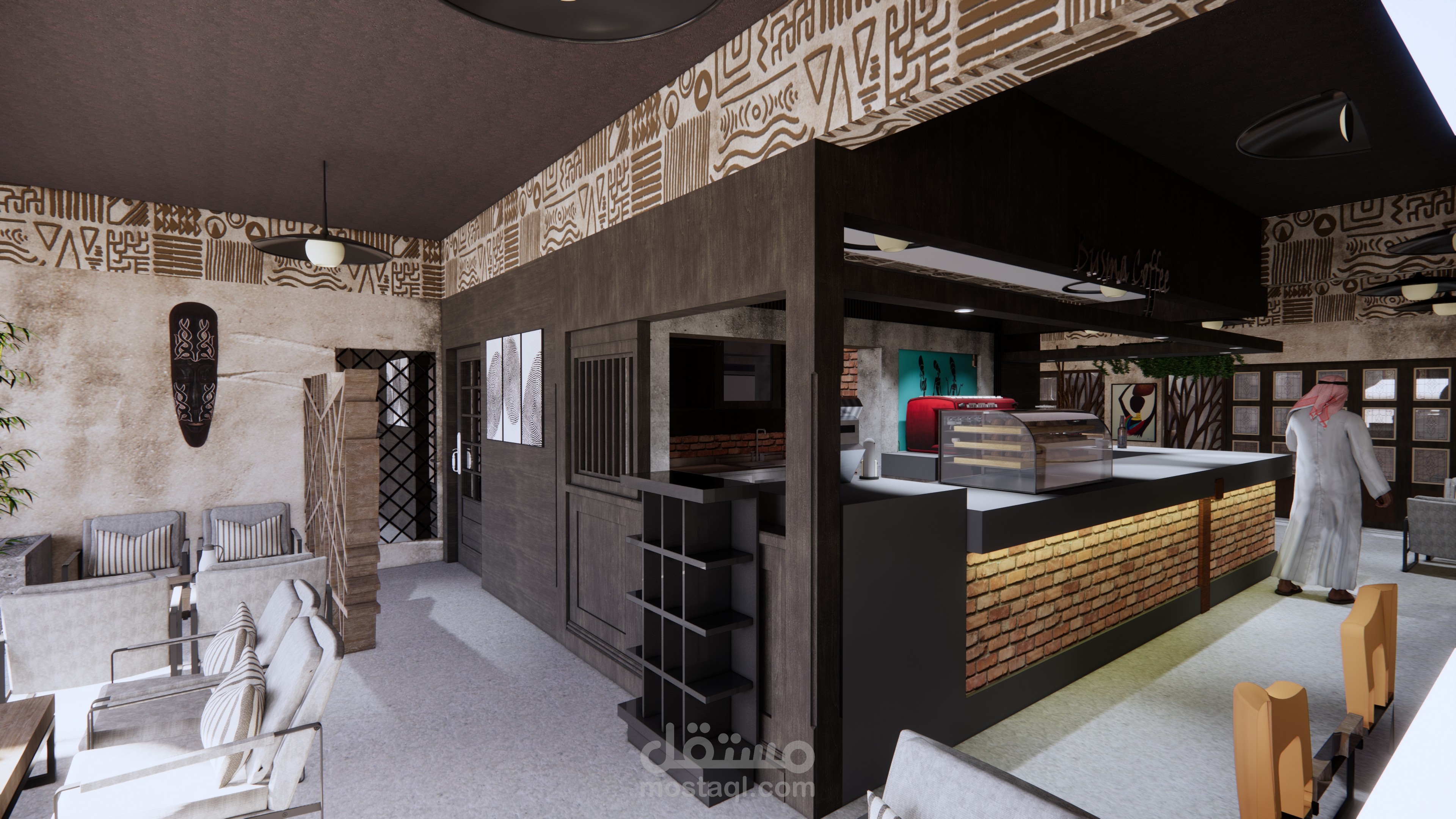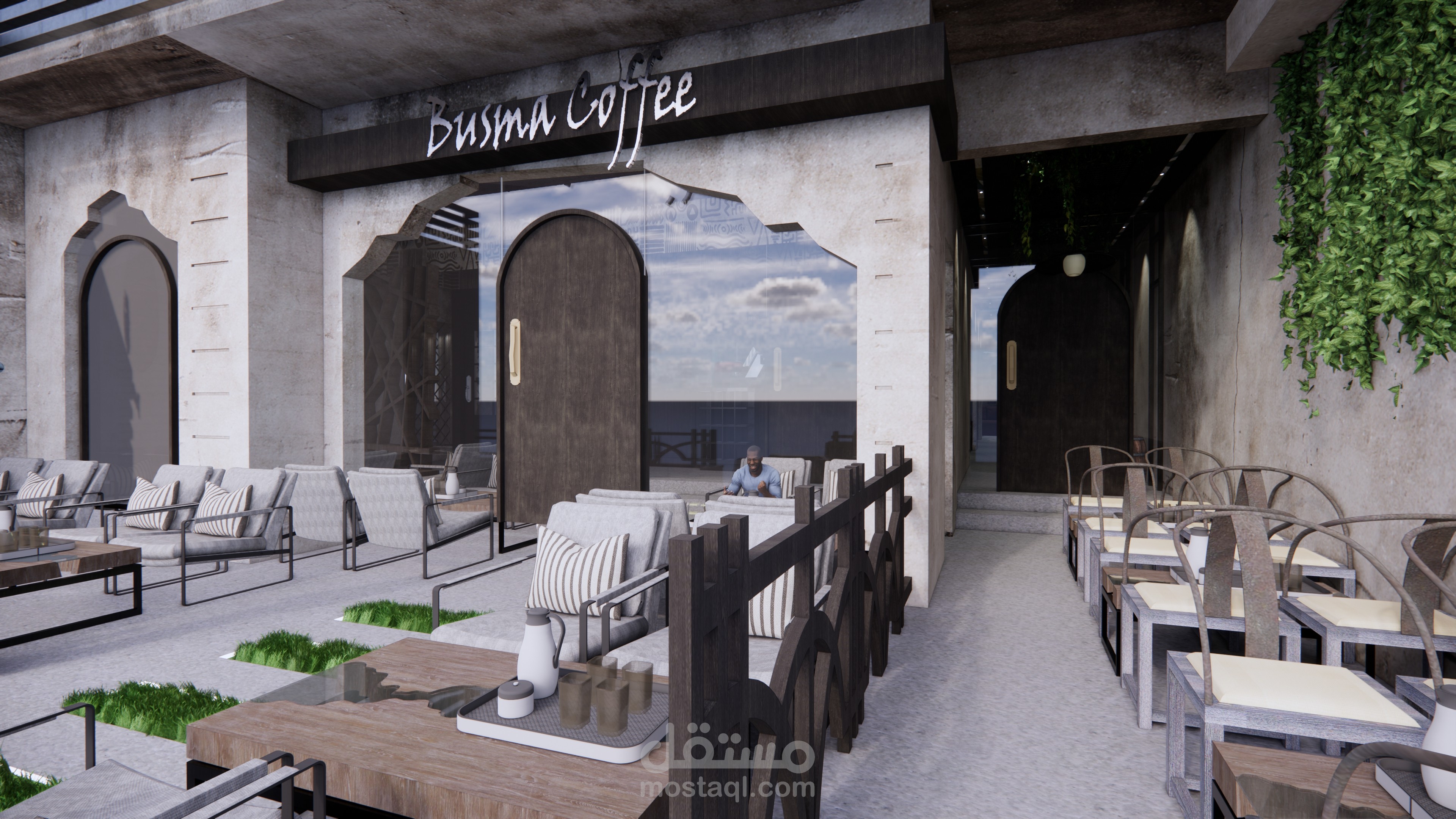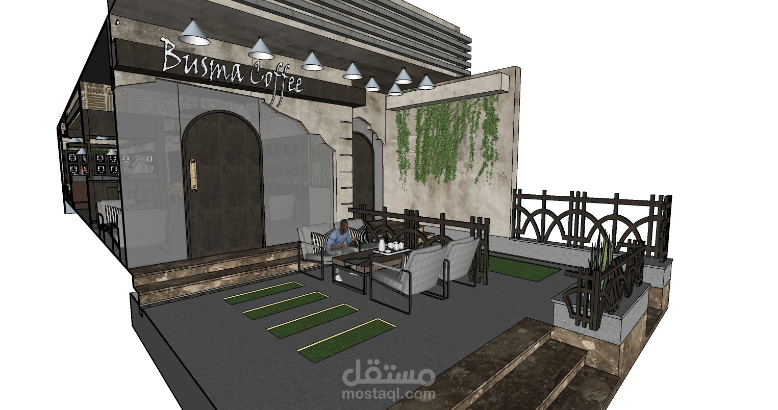 تصميم داخلي كوفي شوب - ينقسم الى جلسات داخلية وجلسات مفتوحة خارجية
