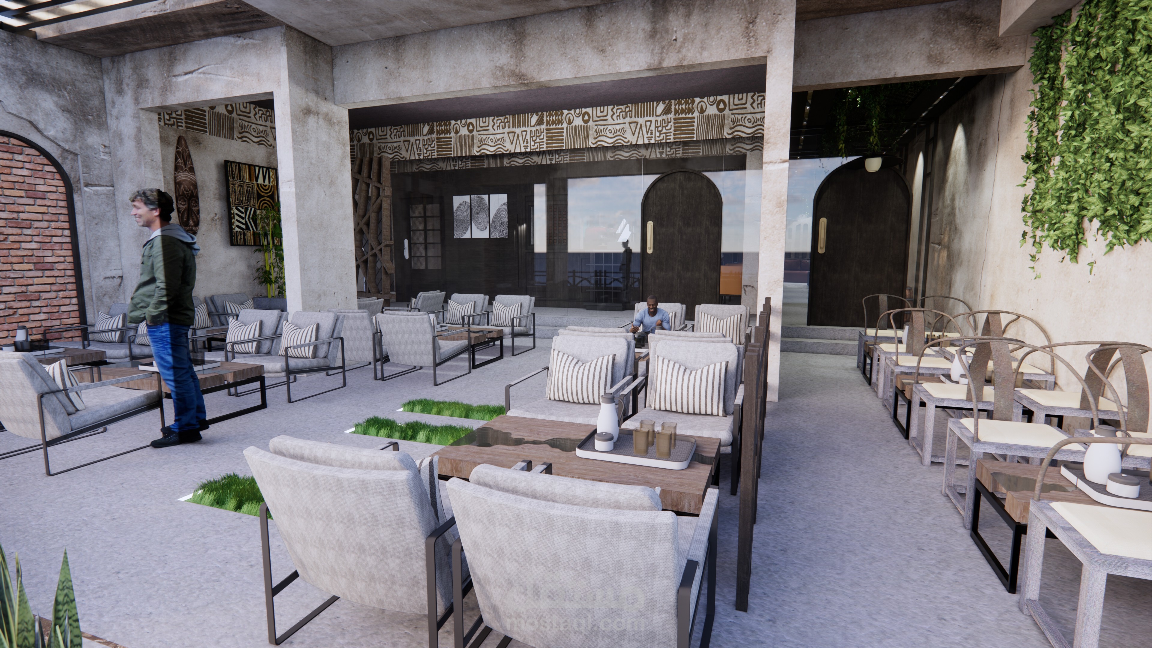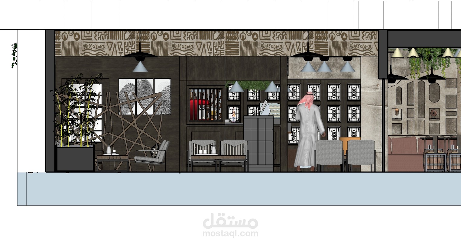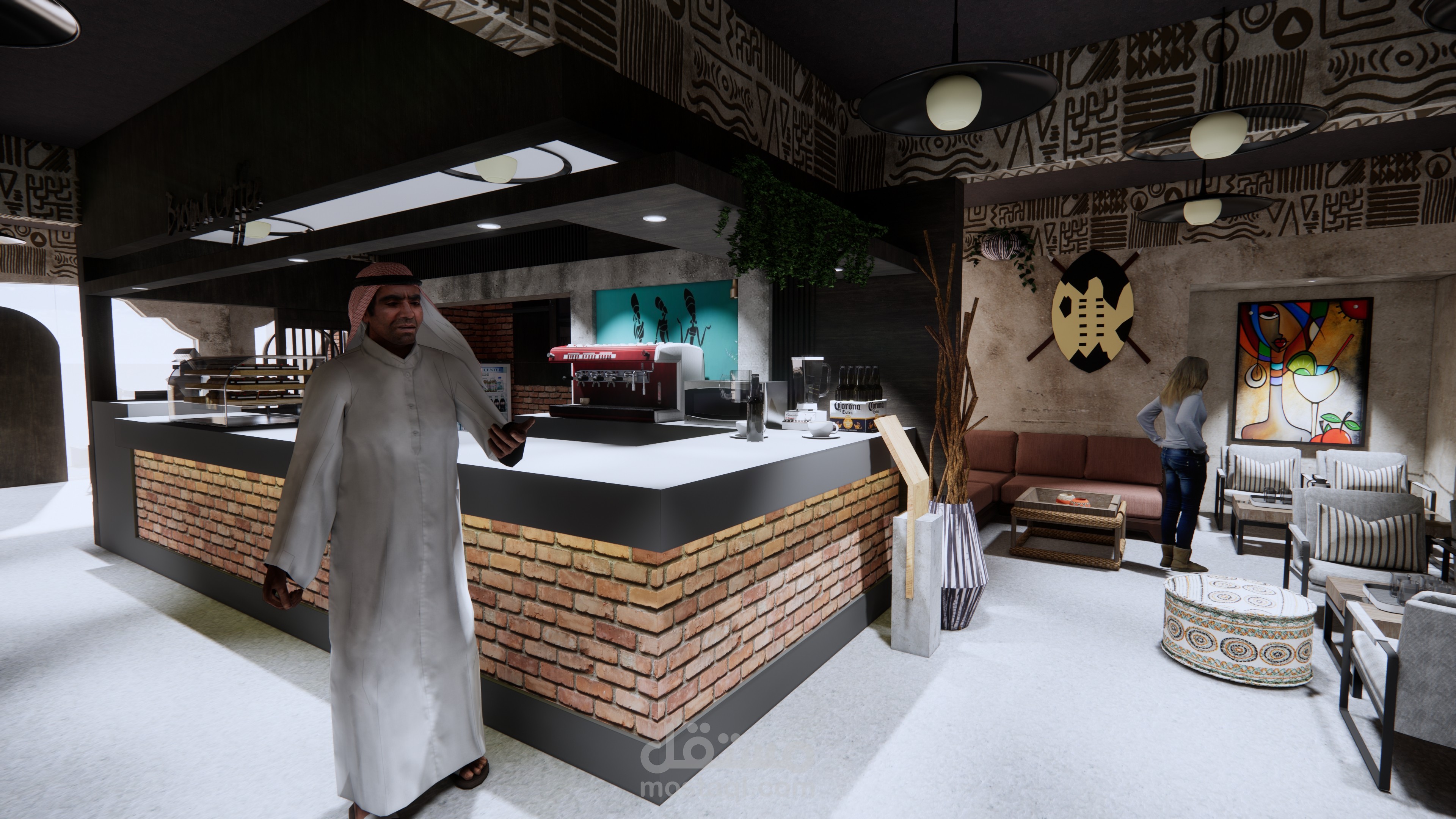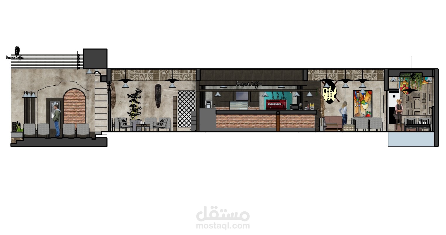 تصميم داخلي كوفي شوب - ينقسم الى جلسات داخلية وجلسات مفتوحة خارجية